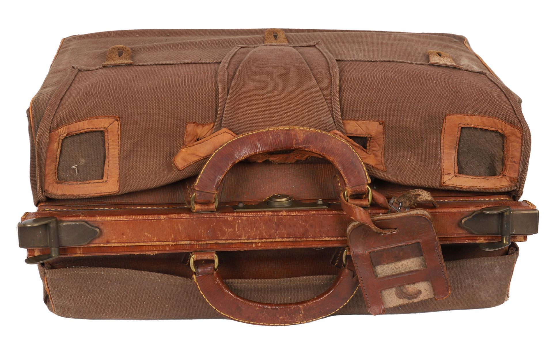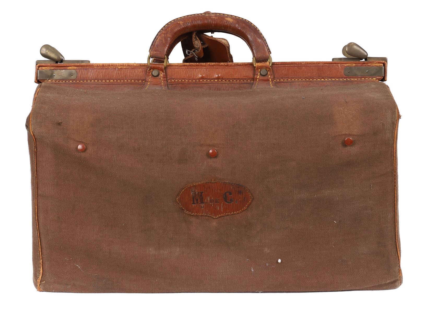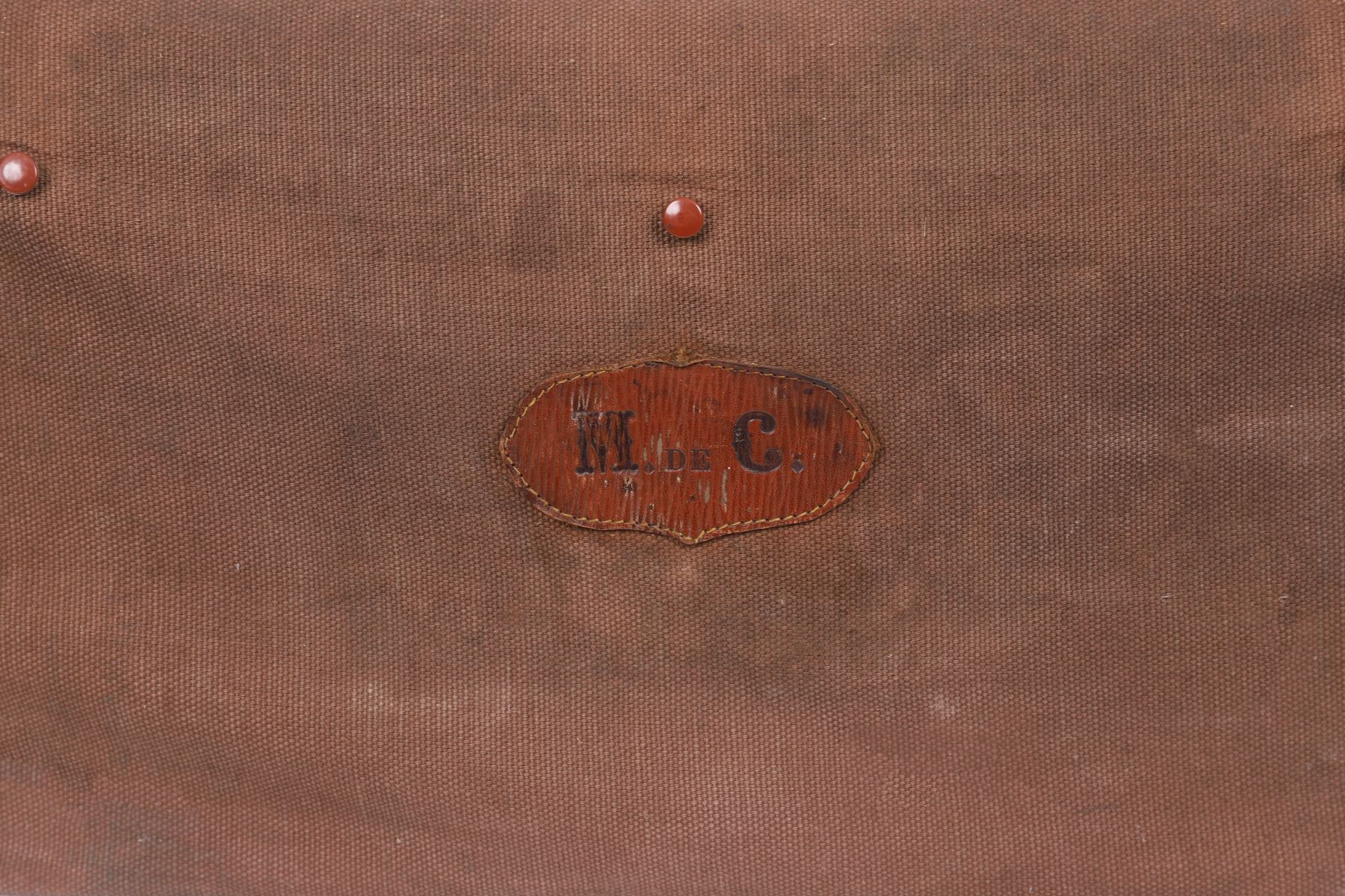 A brown canvas and leather travelling valise with brass clasps, twin leather handles and leather-lined interior, the internal name panel stencilled “M. de C.†(Marthe de Chalain).