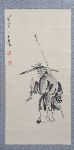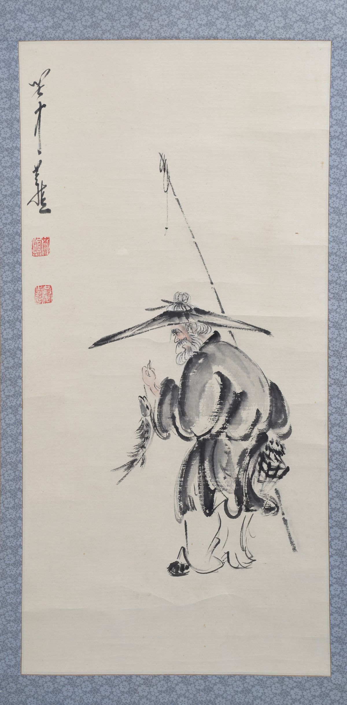 An early 20th-century Chinese hanging scroll depicting a joyous fisherman, rendered in ink on paper, inscribed and bearing two red seals.