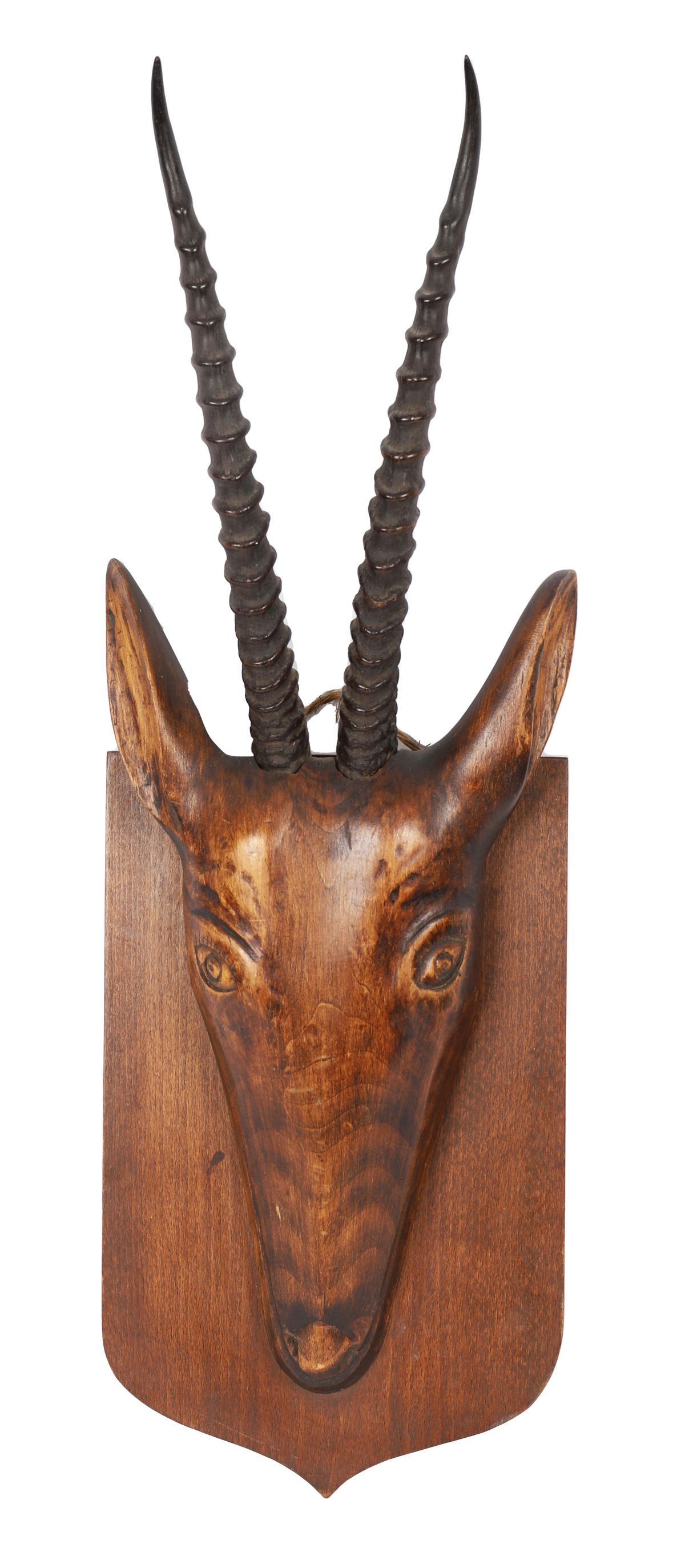 A carved wooden antelope head, modelled with elongated features and mounted with natural horns on a shaped timber shield backboard