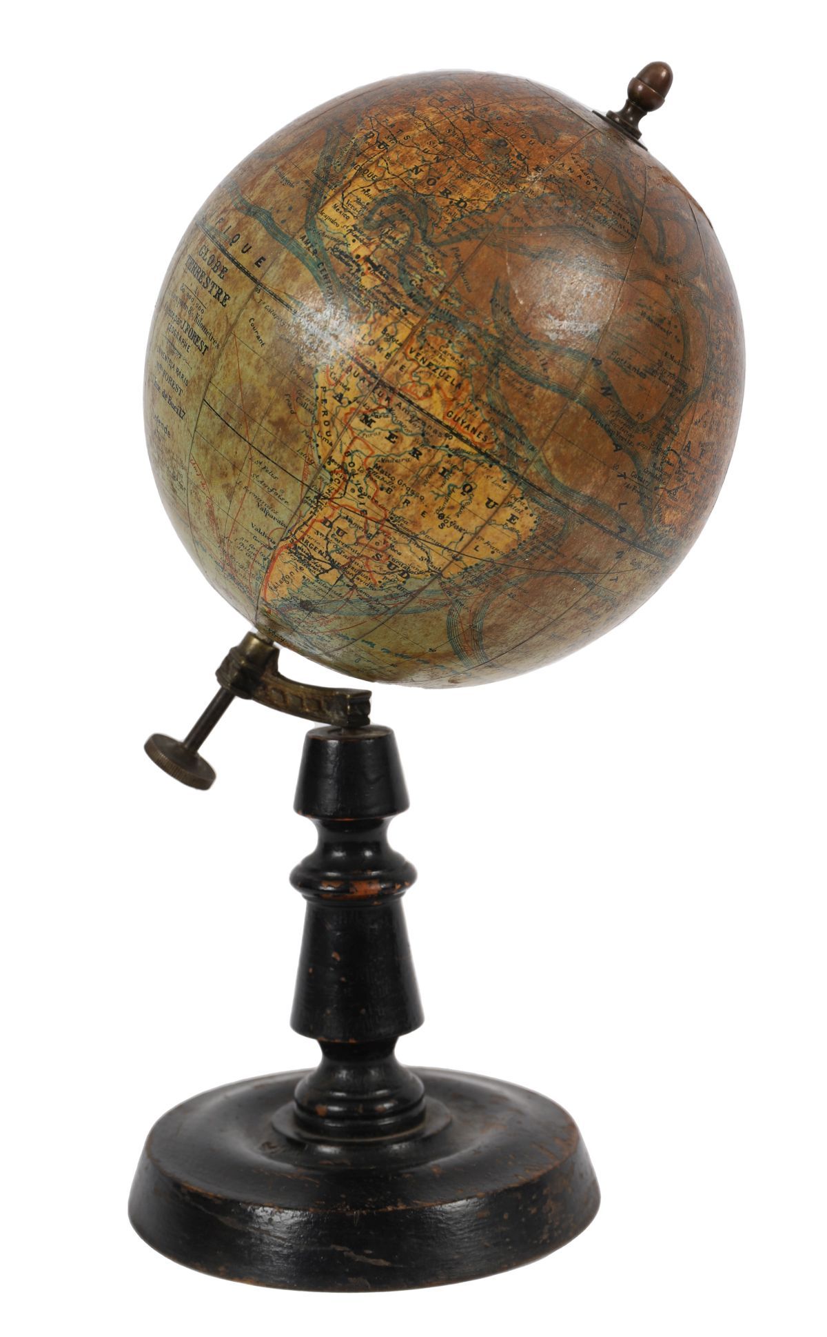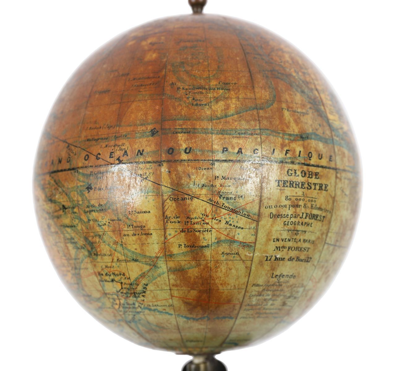 A French terrestrial globe printed “Globe Terrestre – Dressé par J. Forest, Géographeâ€, with scale 1:80,000,000 and address 17 Rue de Buci, Paris. The cartography in French includes a printed legend and political boundaries of the period.