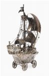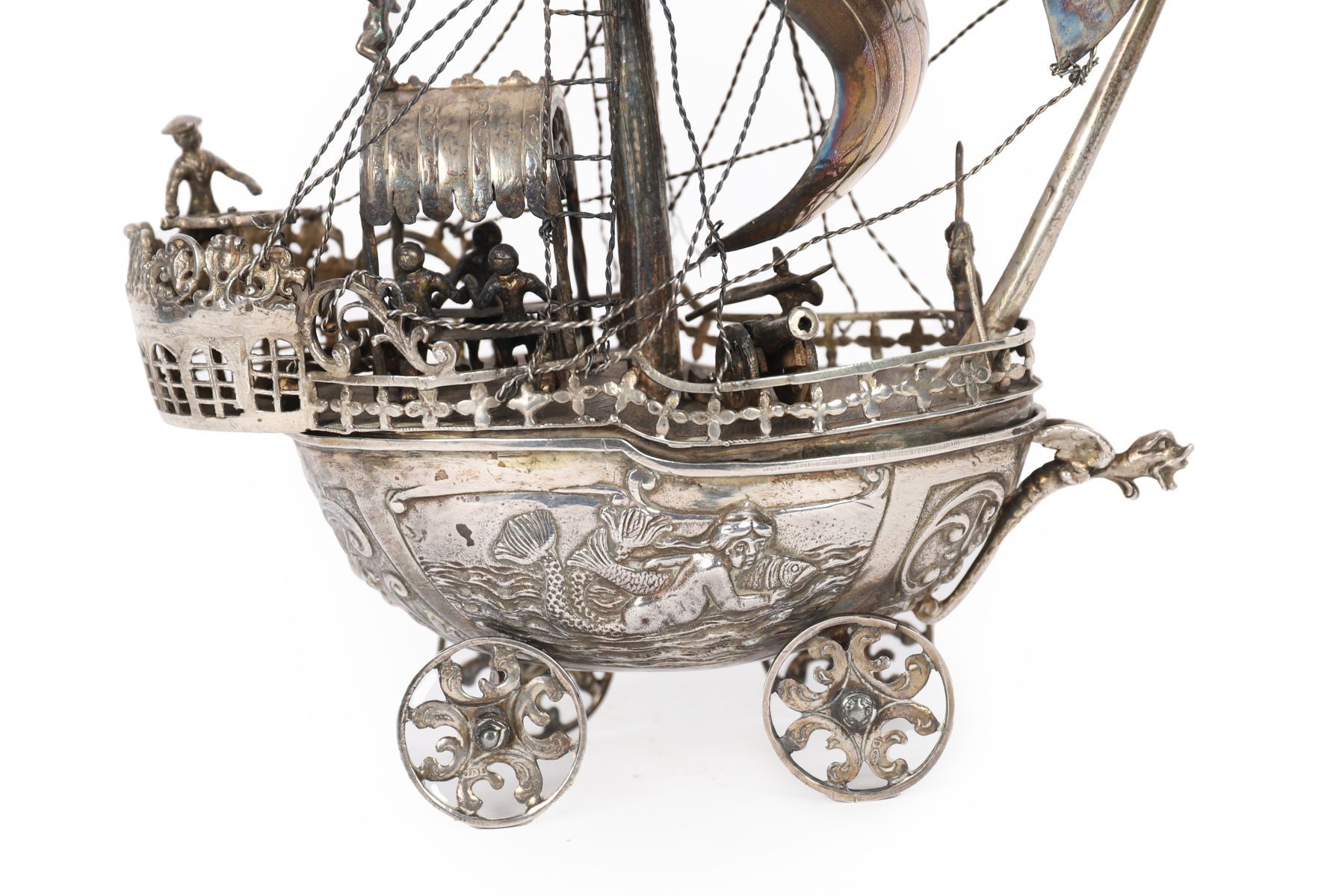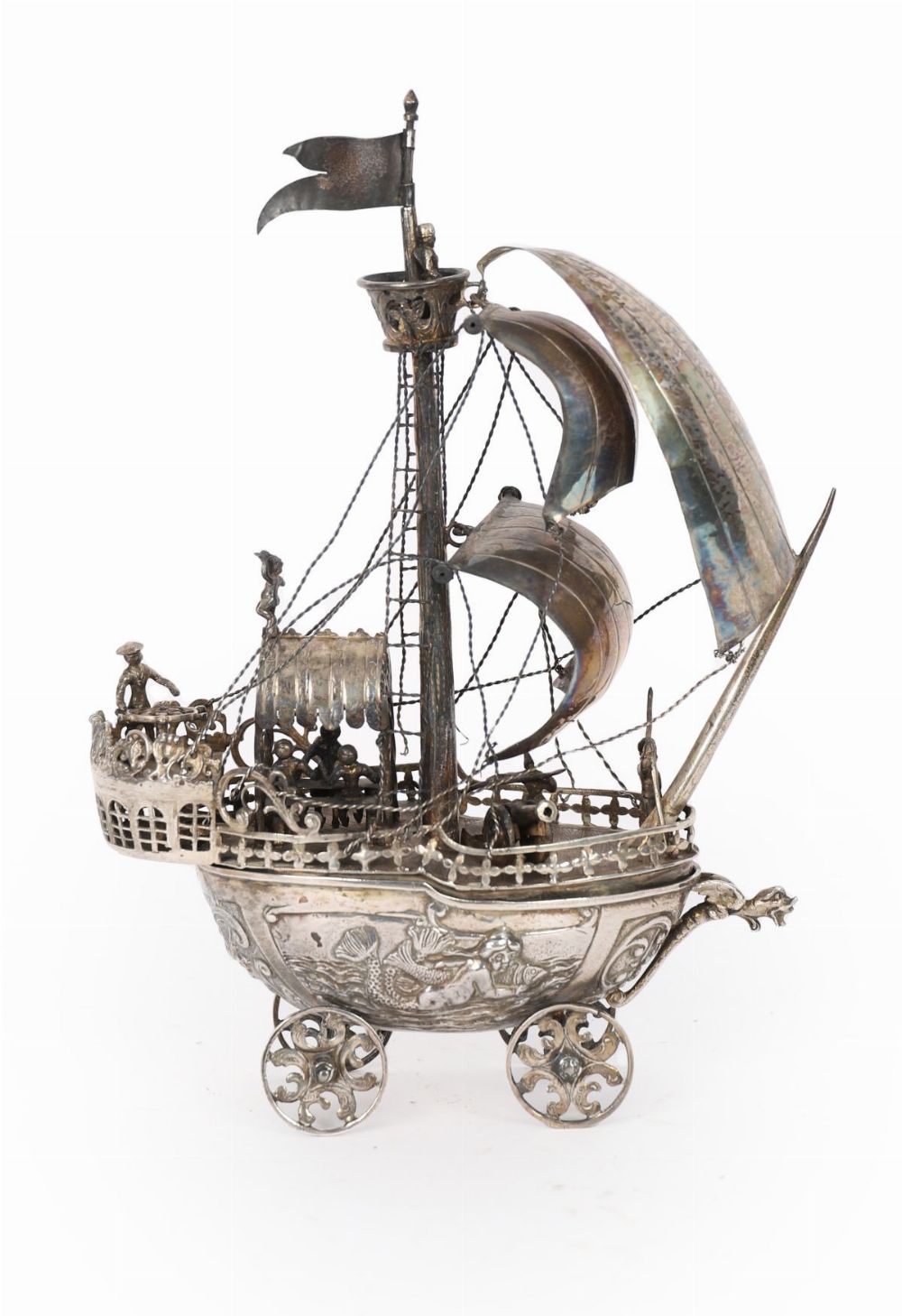 A finely executed solid silver model of a galleon-form sailing vessel by Berthold Müller, bearing English import marks. The ship richly detailed with pierced and chased decoration to the hull incorporating shell and scroll motifs, figurehead to the prow, and applied beaded borders. The deck populated with cast figures, canopy-covered stern section, ropework rigging and three curved silver sails with naturalistic hammering. Surmounted by a bannered mast and raised on four pierced scrollwork wheels. A substantial and highly decorative example of Müller’s sought-after maritime models.