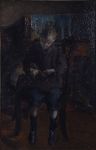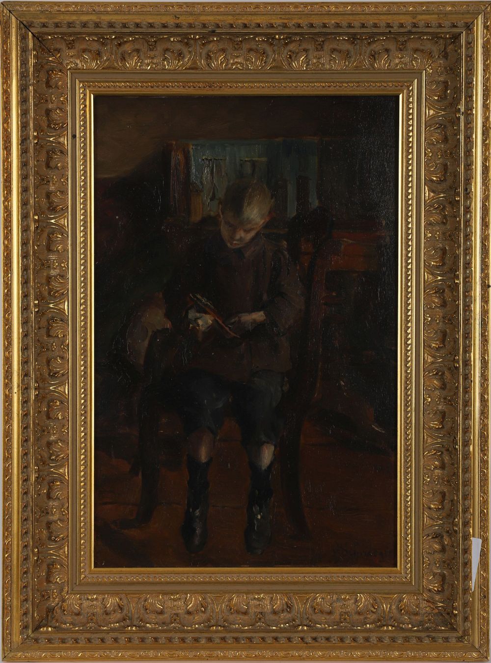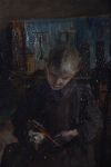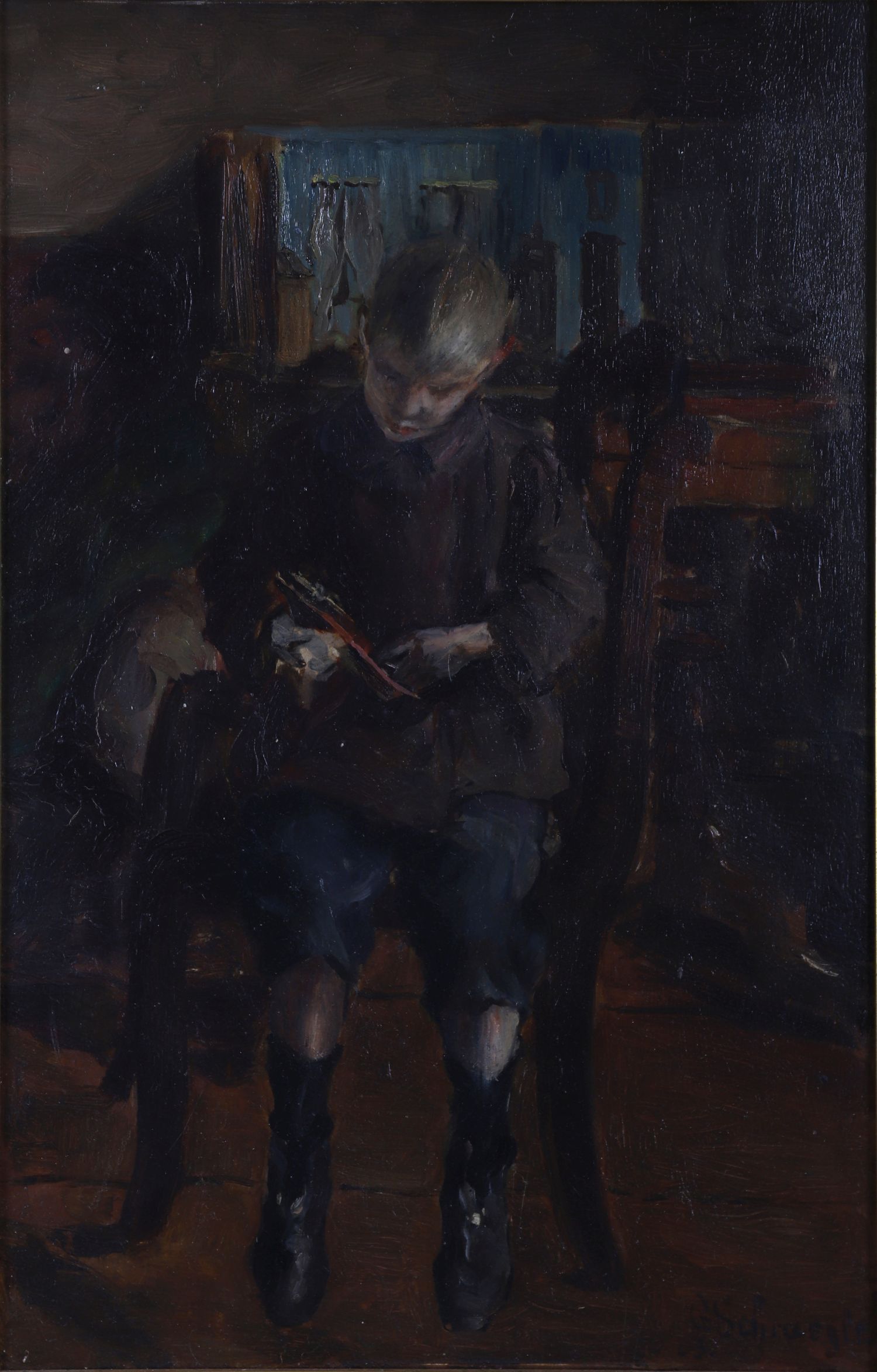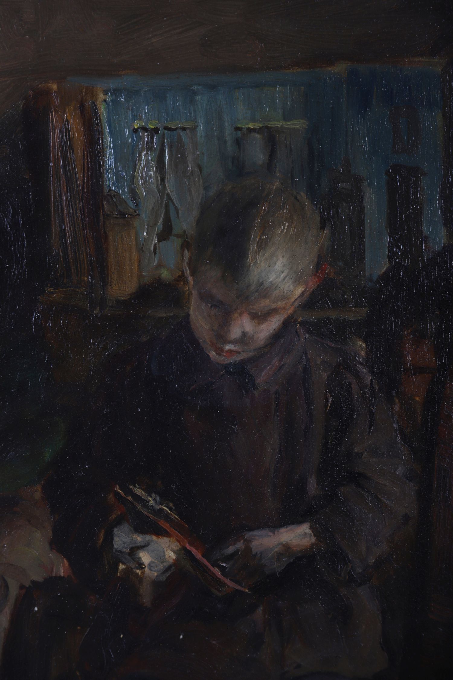 Description: Interior scene of a young boy reading in a dimly lit room. A characterful study rendered in Schraegle's expressive brushwork.