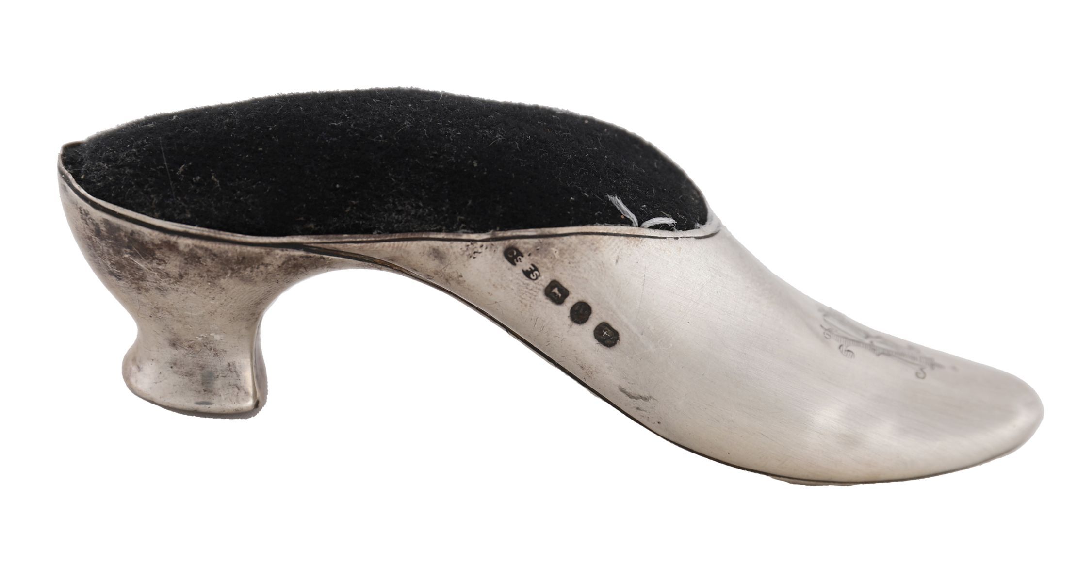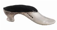 An early 20th-century novelty silver pin cushion, modelled as a lady’s shoe, hallmarked for London, maker Barrett & Son, Piccadilly.