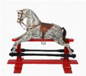 An early 20th-century carved and painted rocking horse, the body polychrome decorated with red-painted stand, complete with saddle, reins and stirrups.