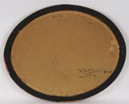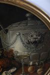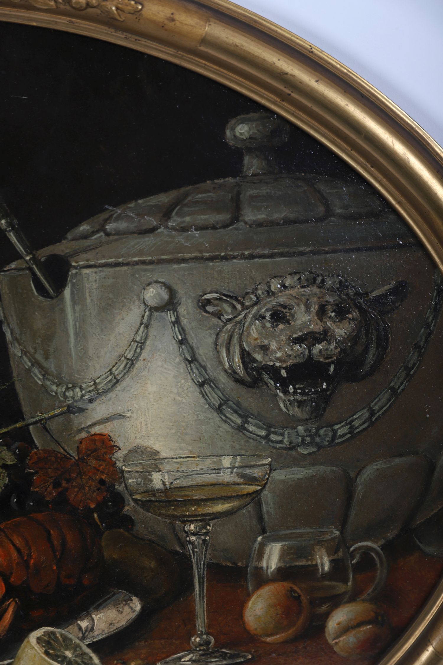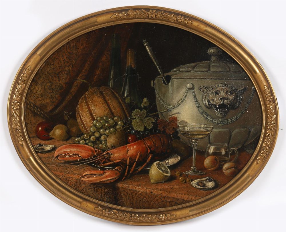 A finely executed oval still life with lobster, fruit, and silverware. Signed. Richly detailed and typical of Lassen's classical still life compositions.