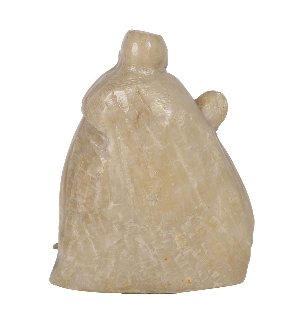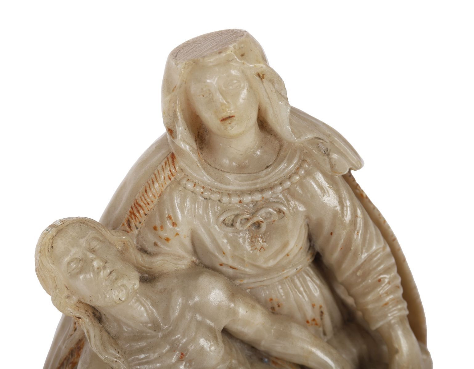 An early carved alabaster group of “The Pietà â€, depicting the Virgin cradling the body of Christ, delicately modelled with serene expression and flowing drapery, traces of original gilding.