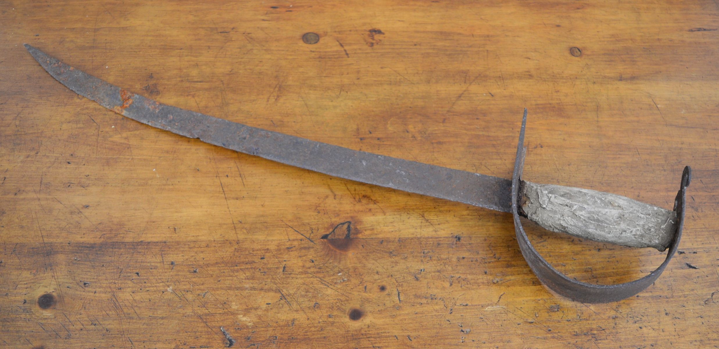 Early forged iron sword with straight blade and simple guard.