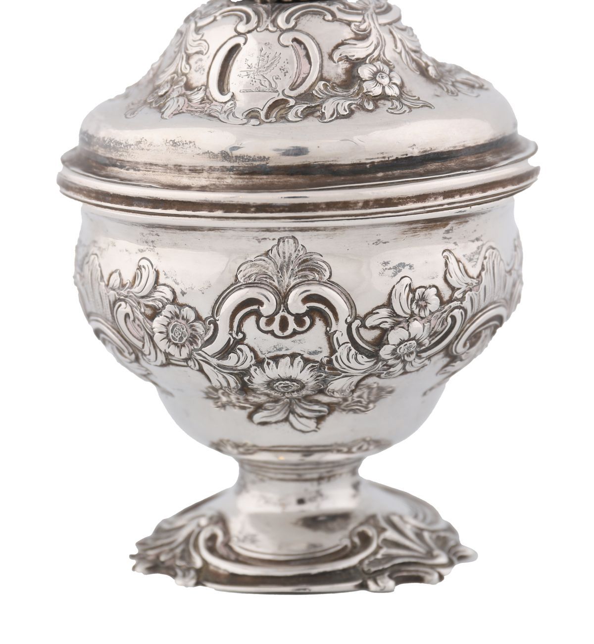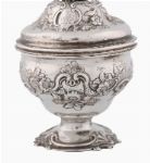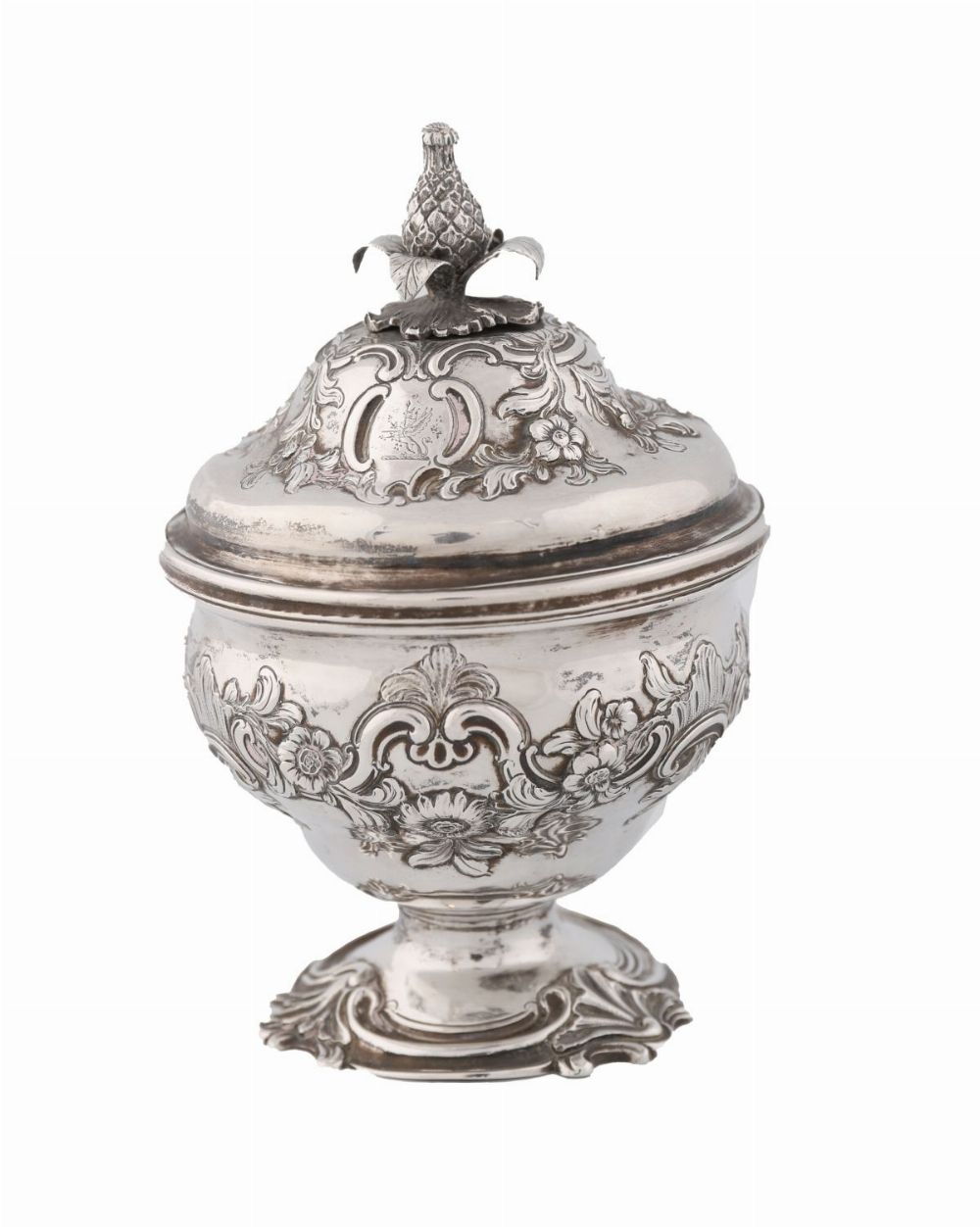 An early George III silver mixing bowl and cover, Daniel Smith & Robert Sharp, London, 1760. The bowl chased with rococo flowers and scrolls within a crested cartouche, the domed cover repeating the motif, capped by a pineapple finial and raised on rocaille-decorated pedestal foot. weight 310 g (10 oz)