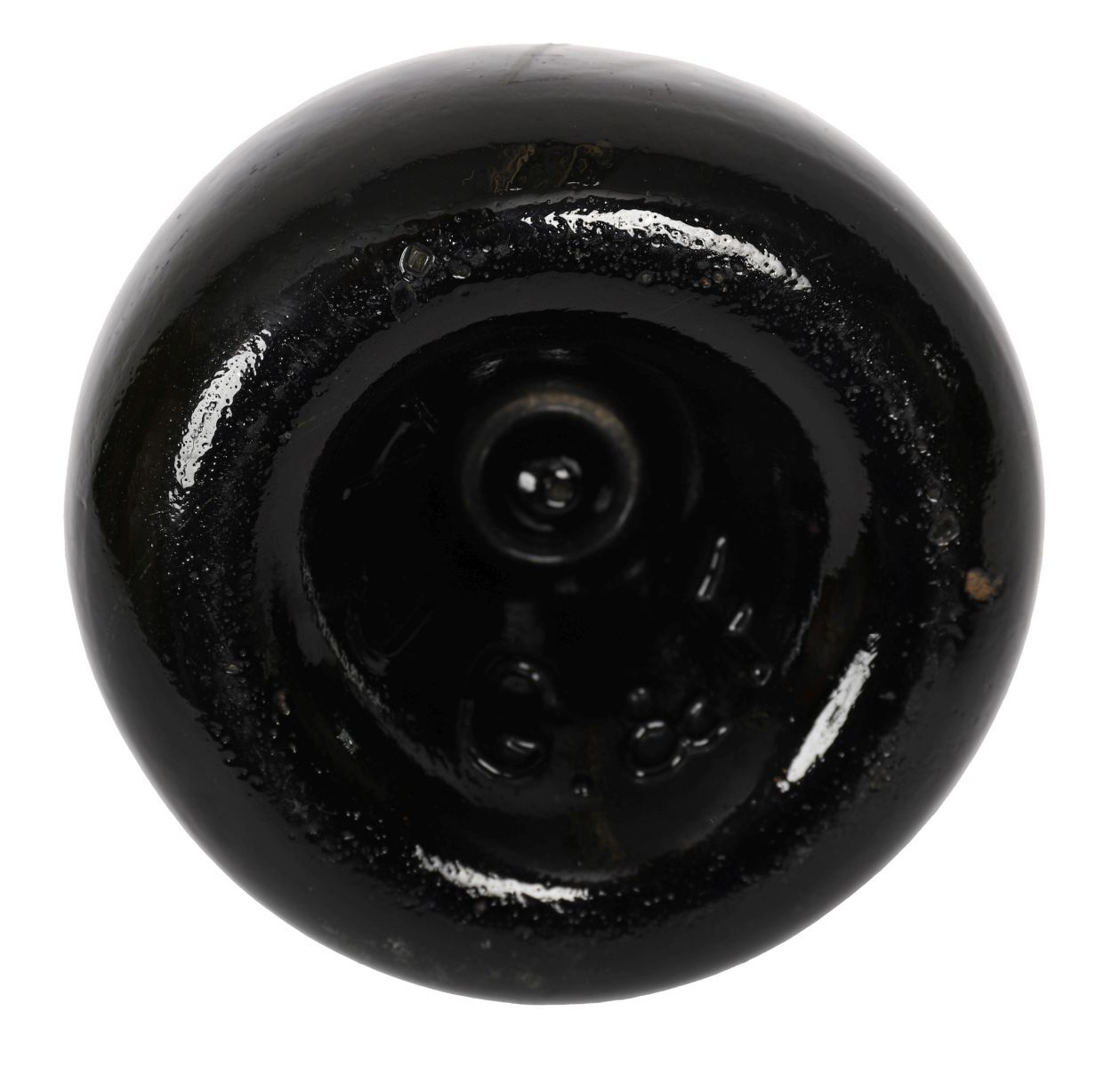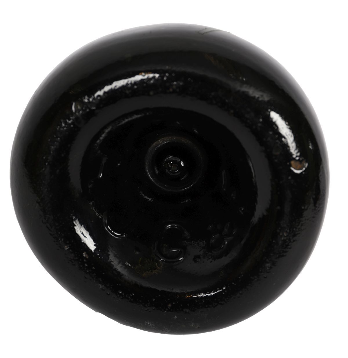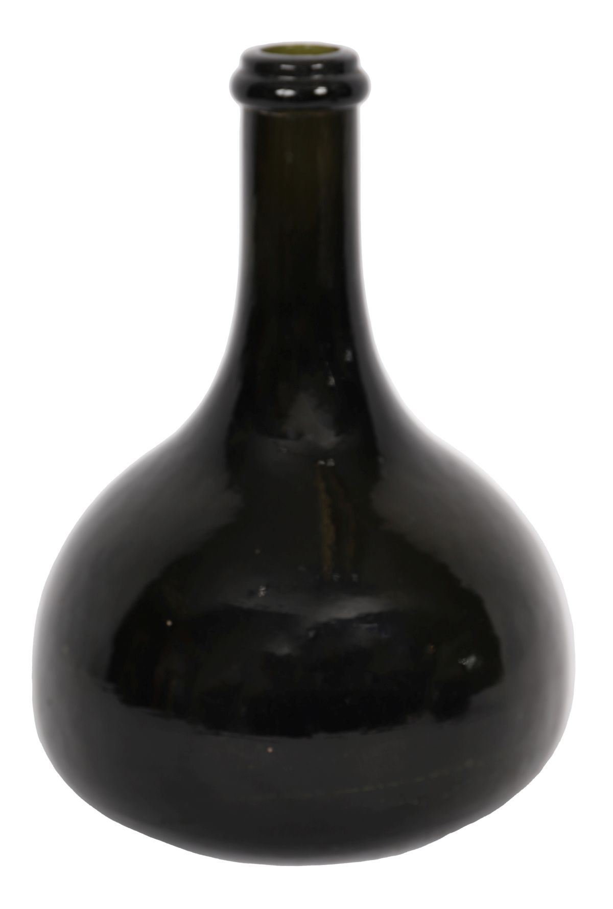 An early Georgian dark glass onion bottle, with short cylindrical neck and broad flattened body.
