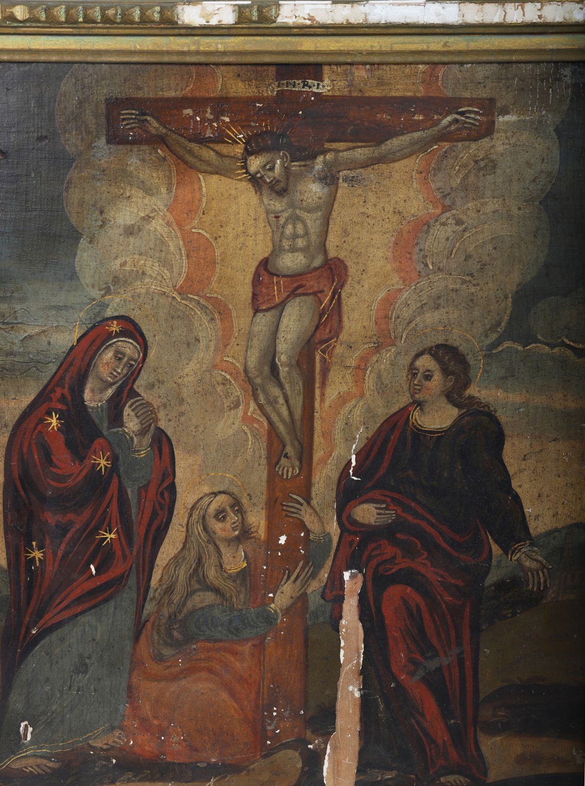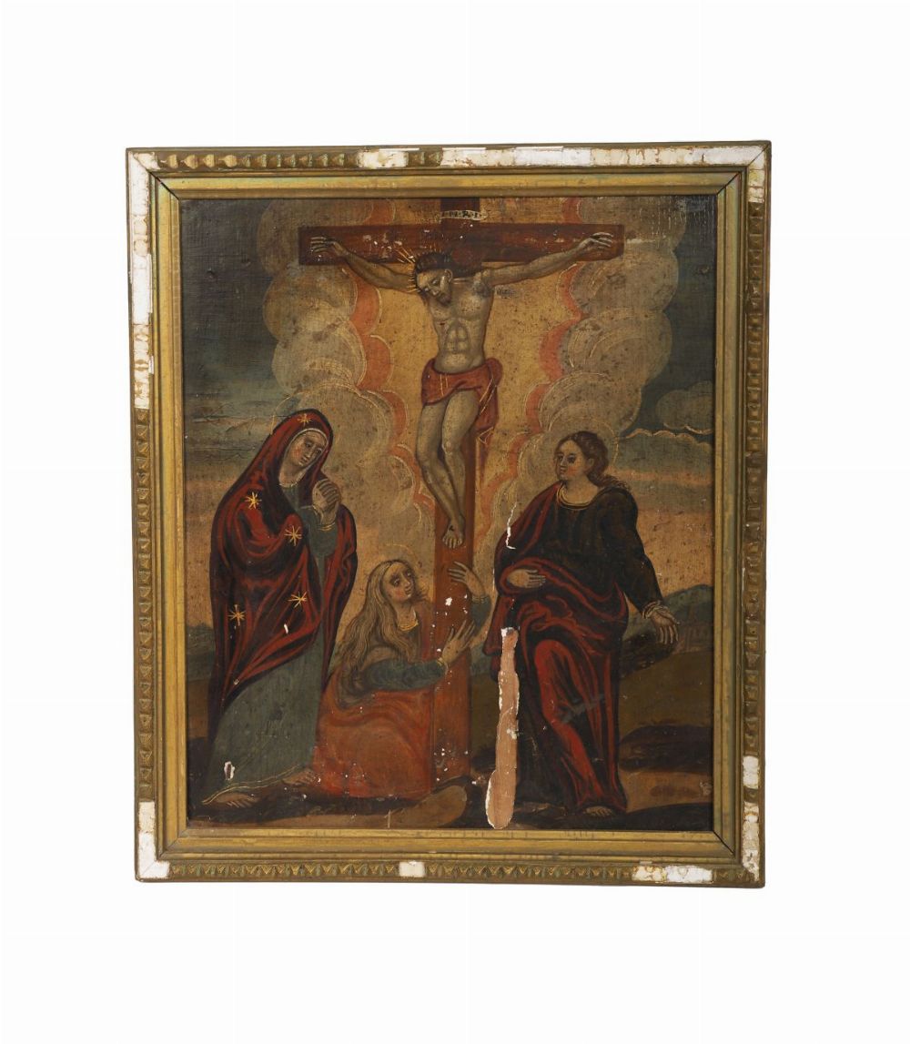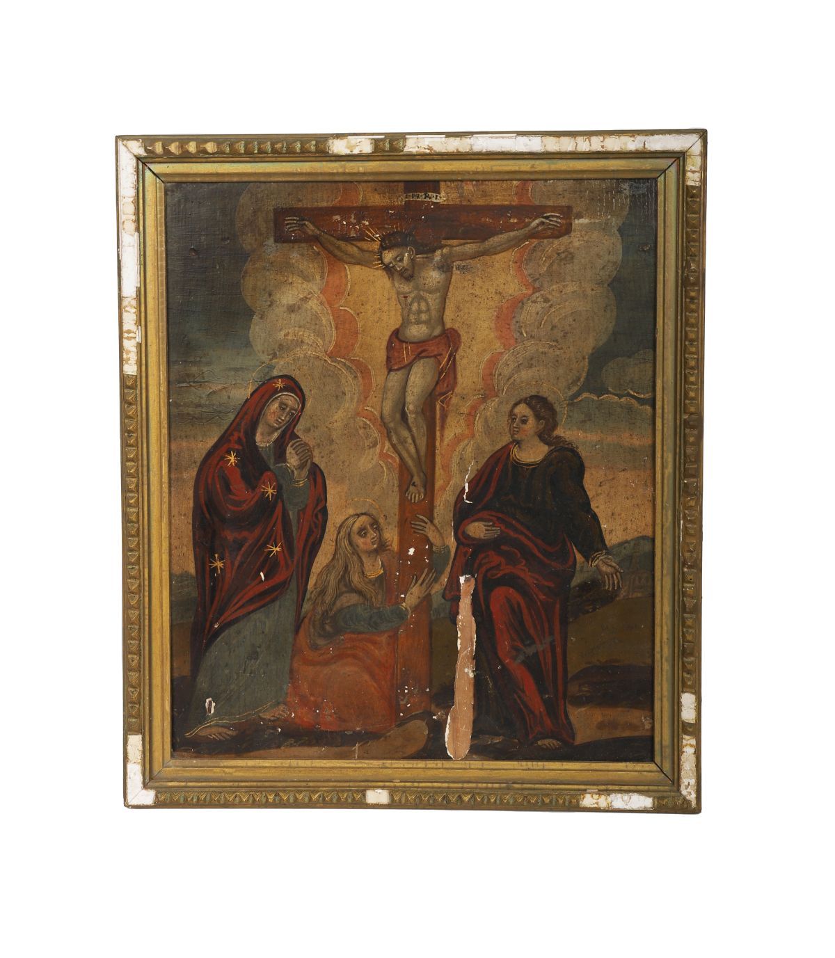 An early painted religious icon on panel depicting the Crucifixion, with the Virgin, Mary Magdalene, and St. John, against a gilt ground.