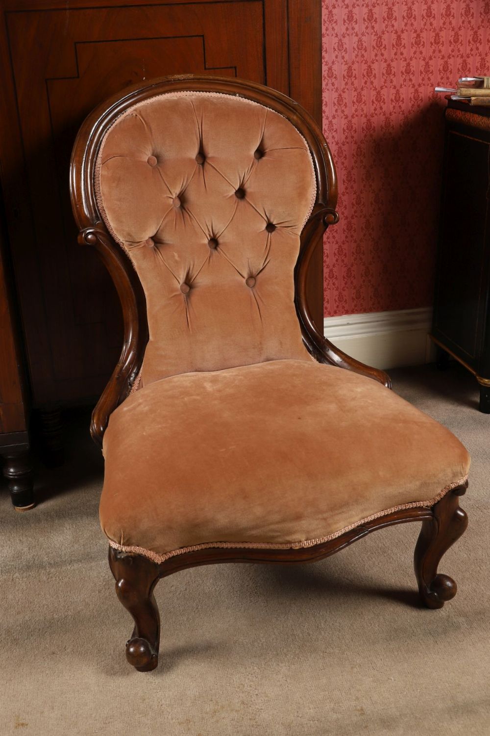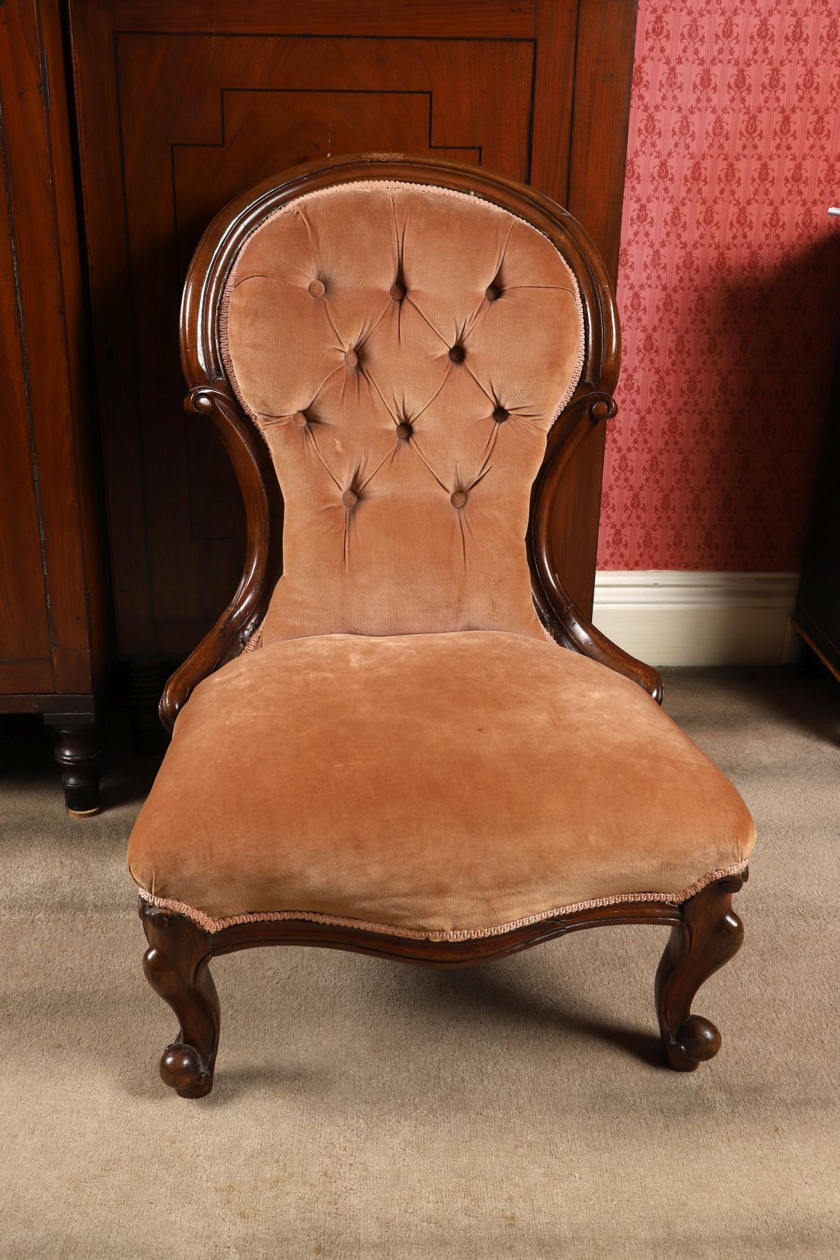 An early Victorian mahogany balloon-back lady’s chair, with serpentine seat, carved cabriole legs and button-tufted upholstered back and seat.