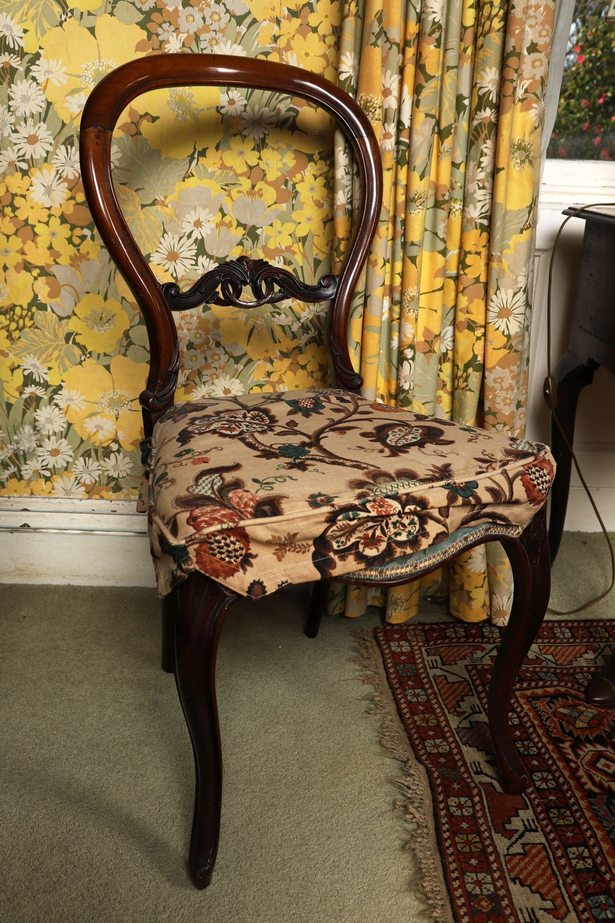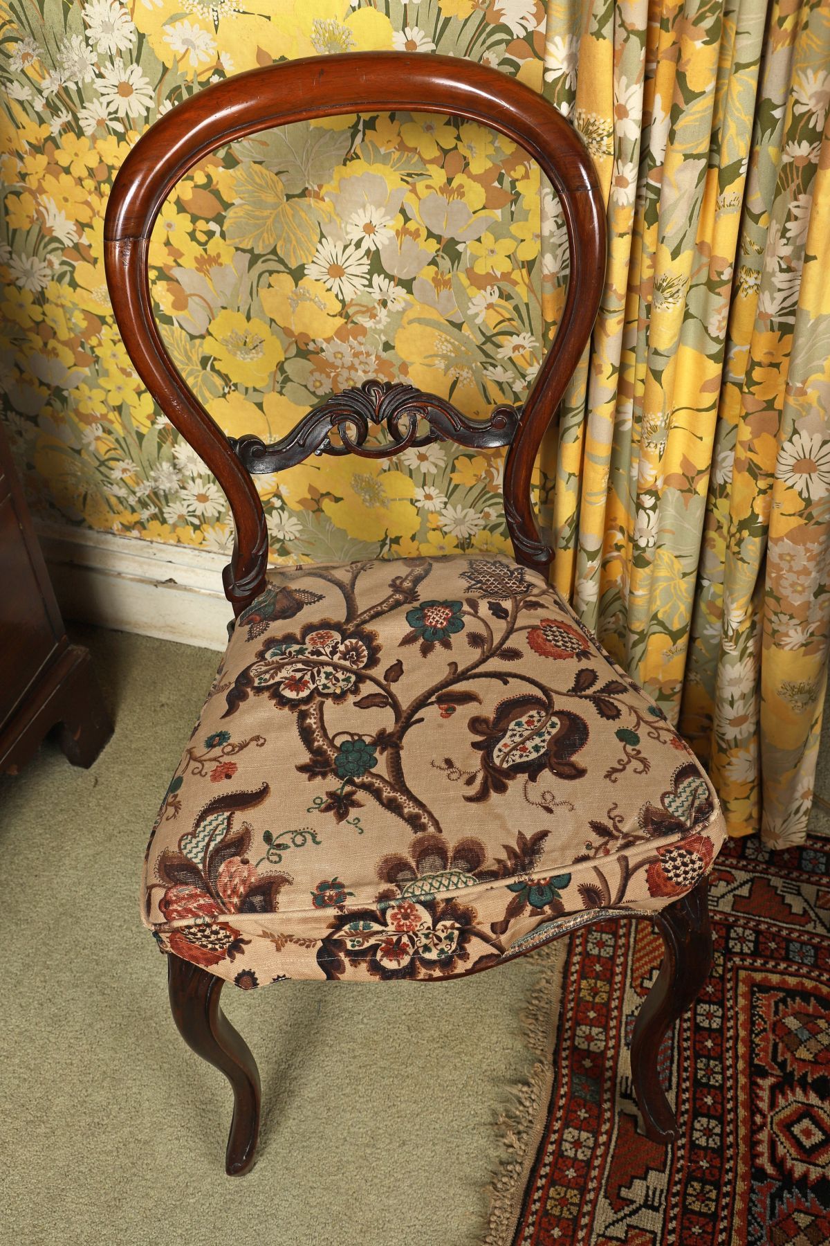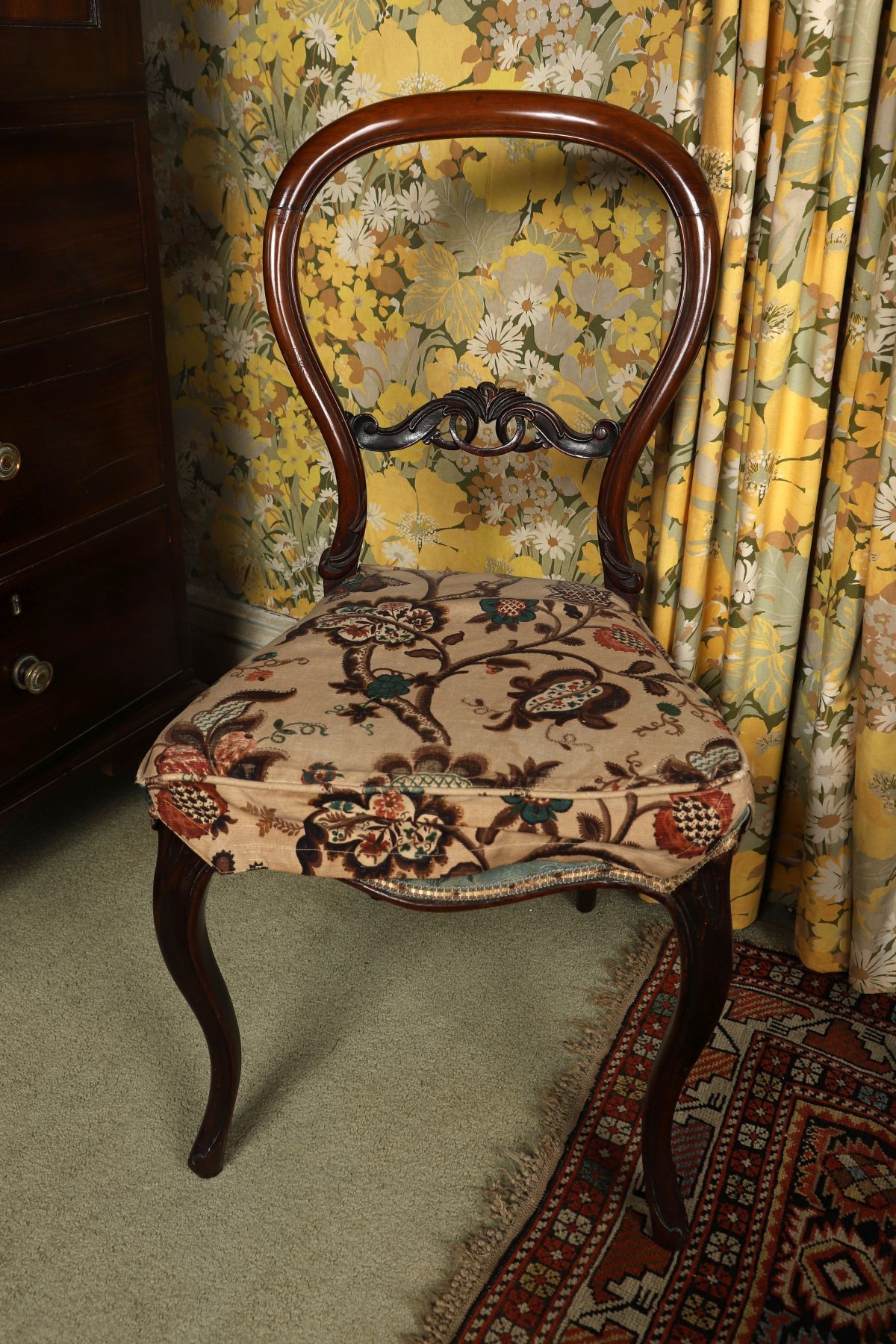 An early Victorian walnut balloon-back chair, the shaped back rail enclosing a carved central splat, above an upholstered seat, raised on cabriole legs.