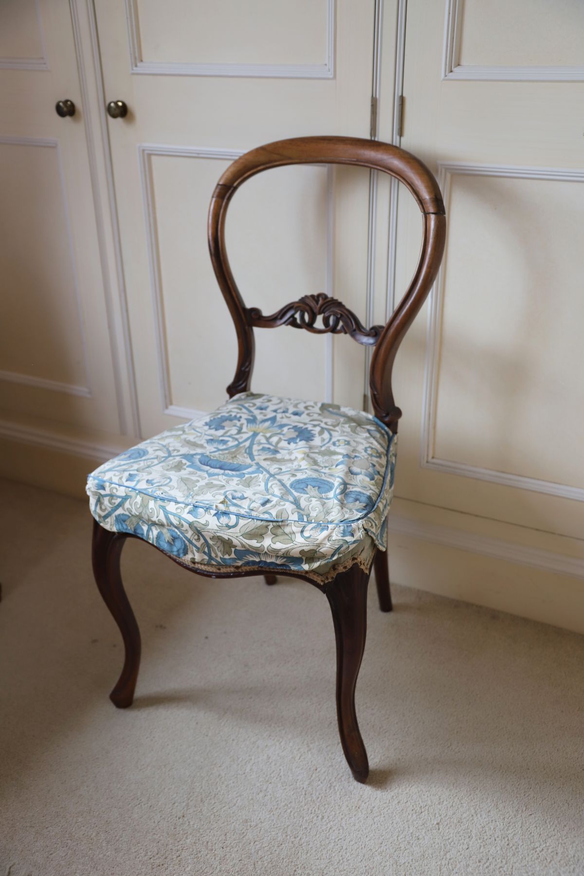 An early Victorian walnut balloon back chair, the carved and pierced back above a drop-in upholstered seat, raised on cabriole legs.