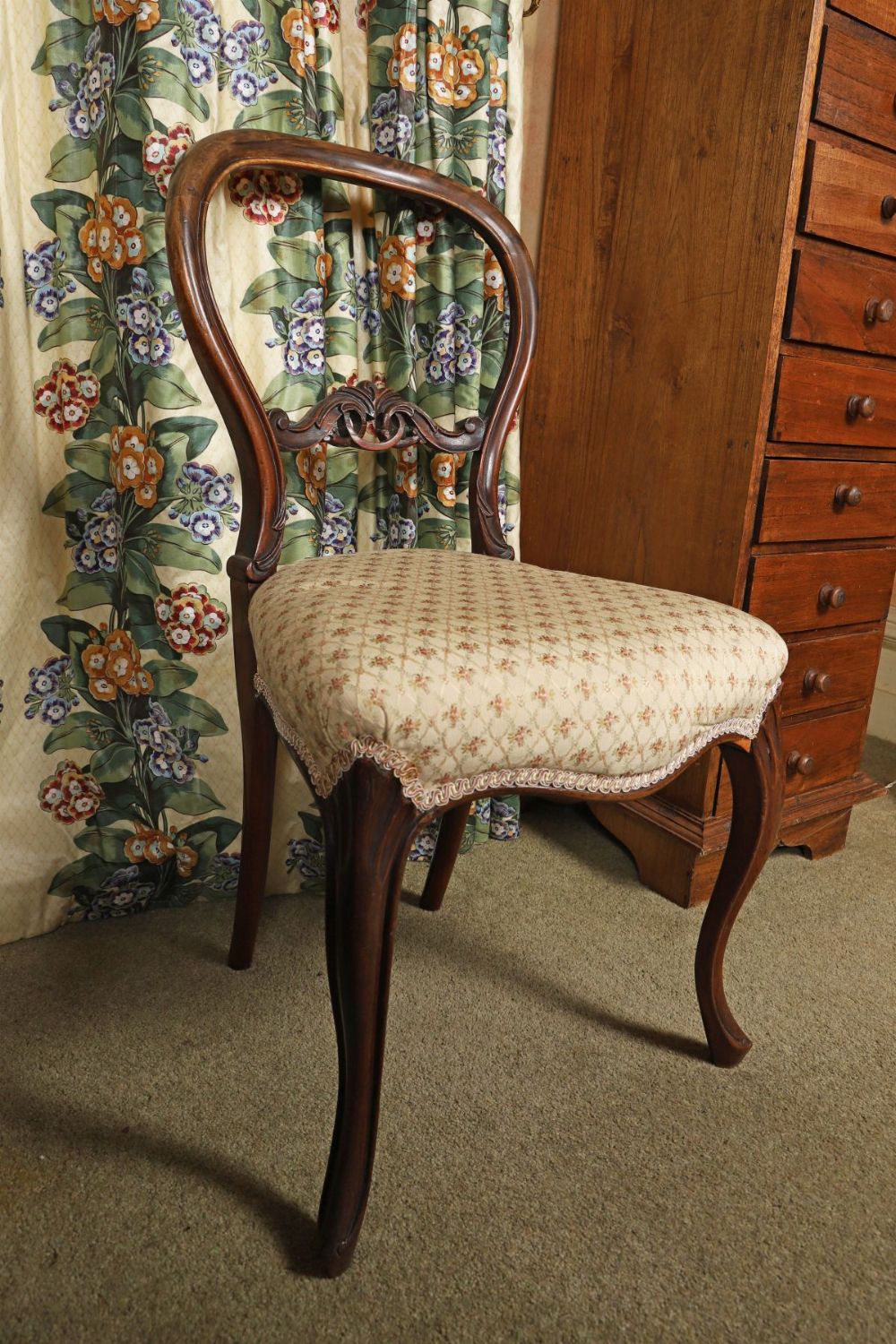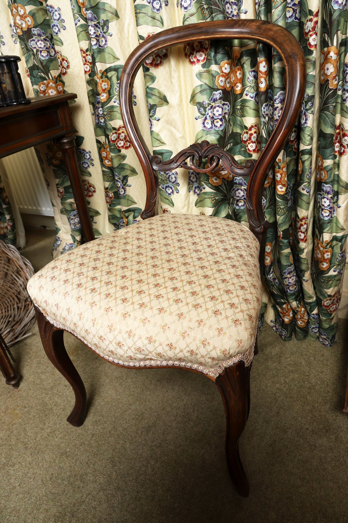 The shaped back above an upholstered seat, raised on cabriole legs to the fore.