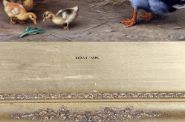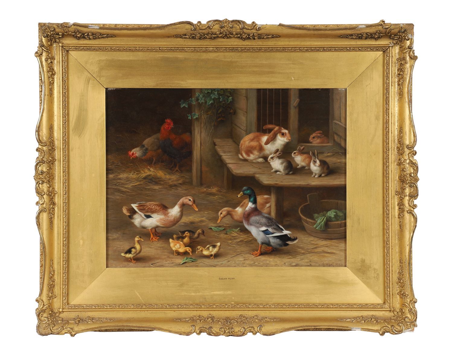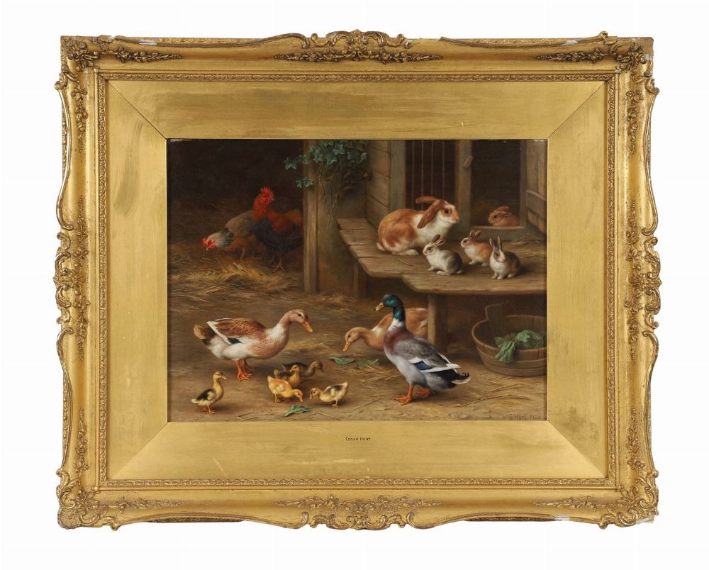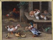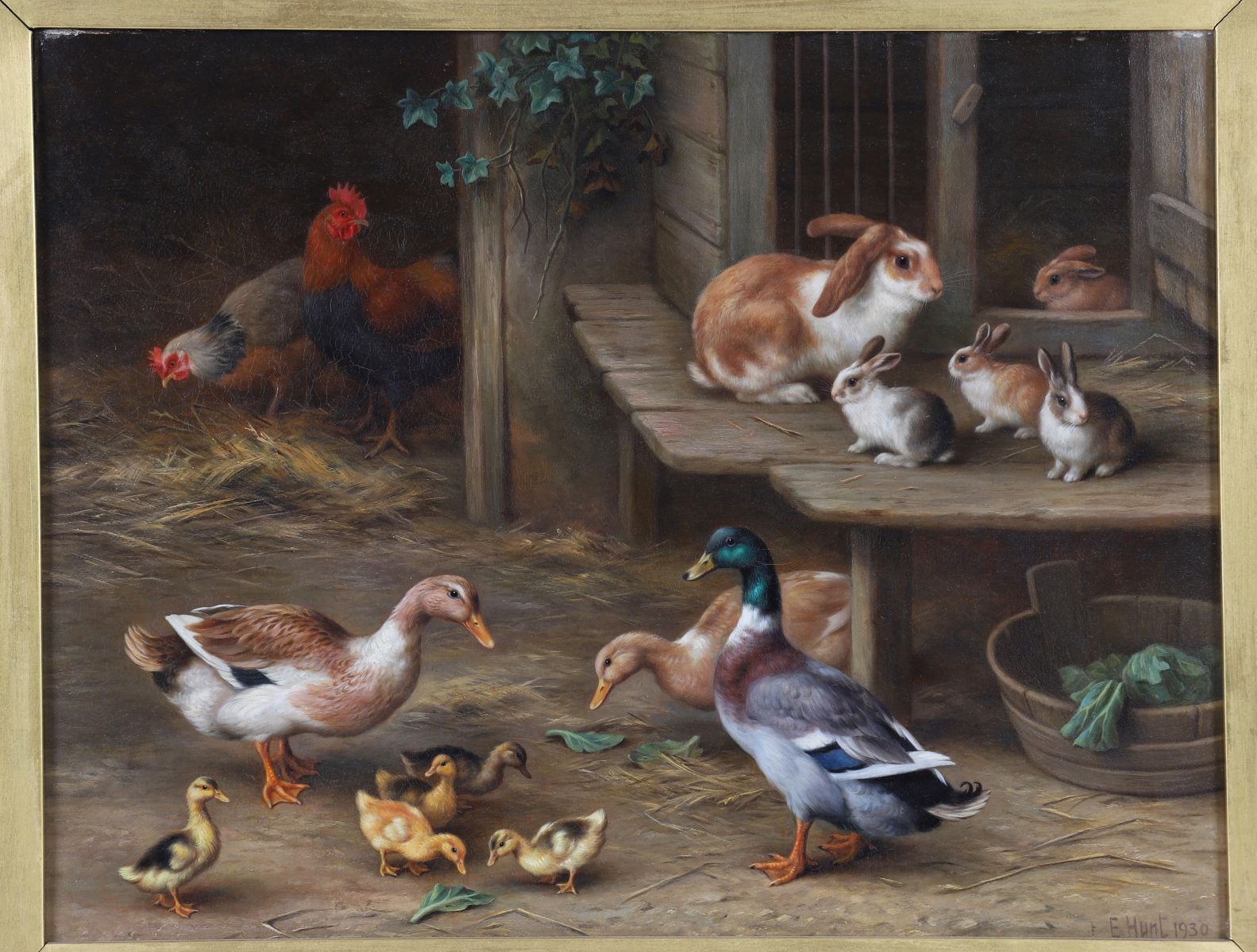 Ducks, ducklings, chickens, and rabbits in a farmyard. Oil. Signed and dated lower left. Framed.