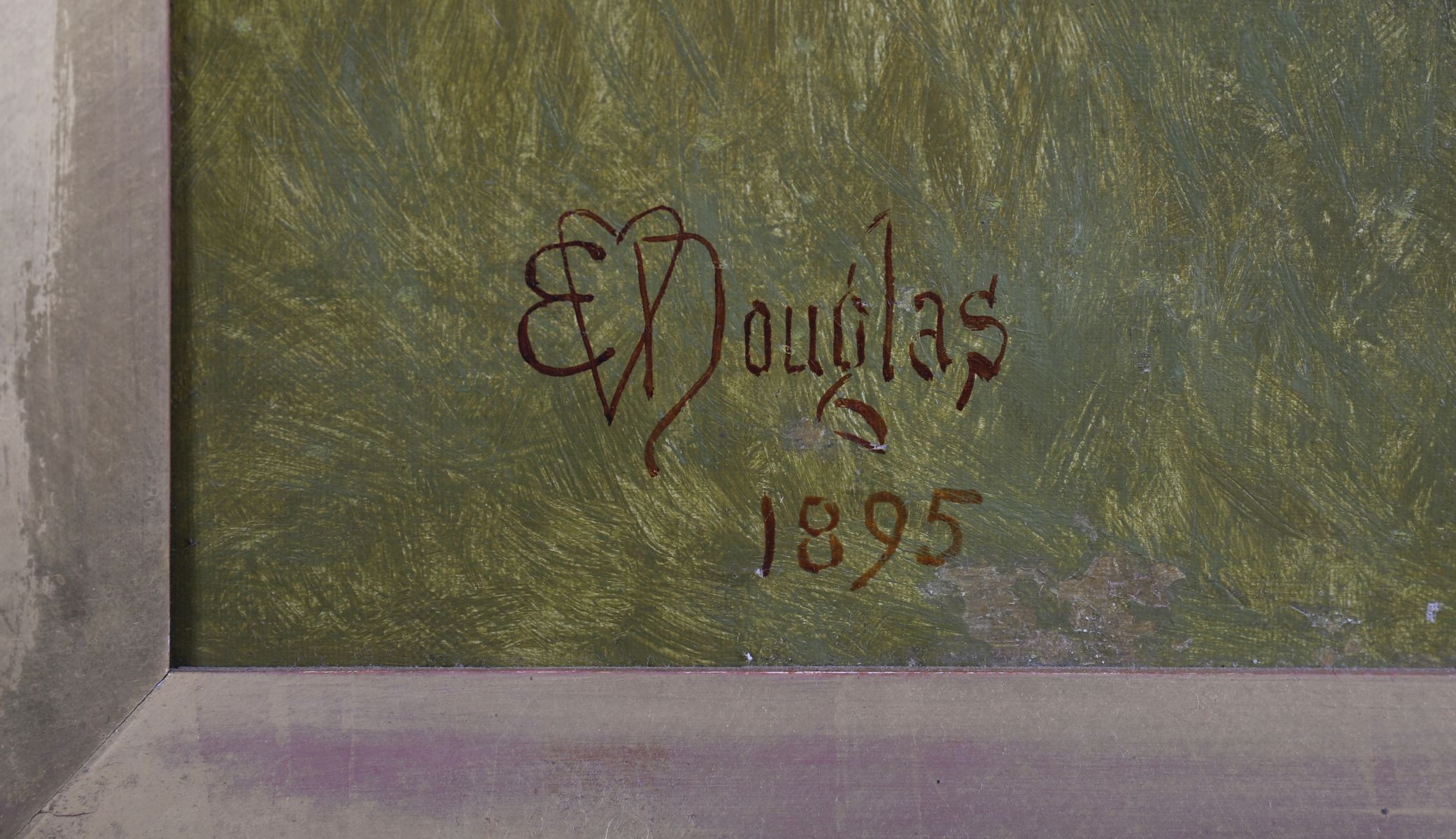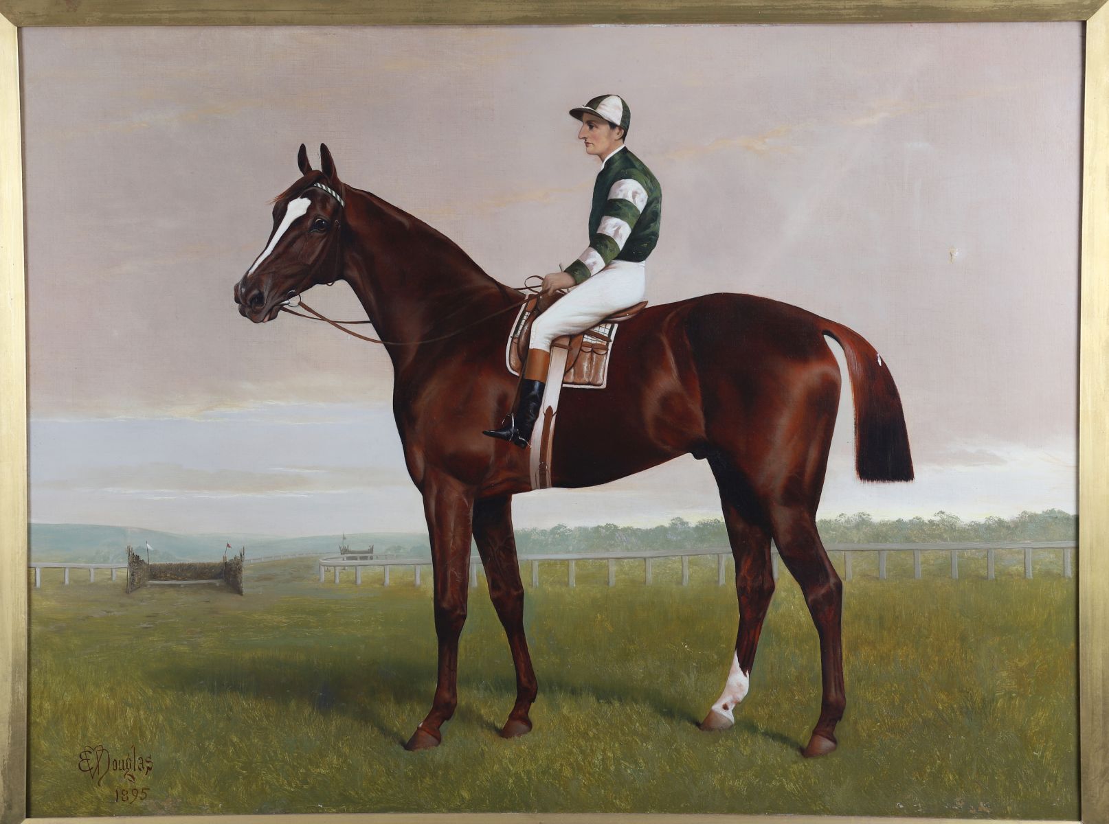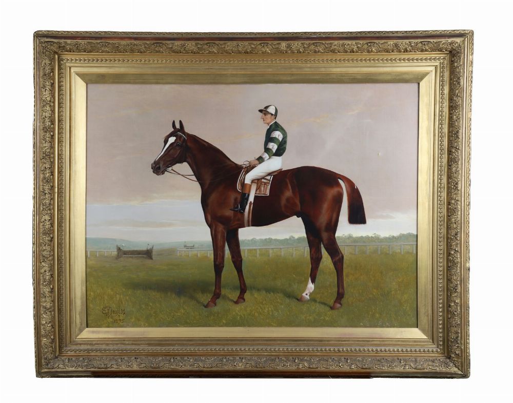 Edward Douglas (British, fl. late 19th century), Horse and Jockey, oil on canvas, depicting a mounted racehorse in profile, signed and dated 1895 lower right. Presented in a gilt frame.