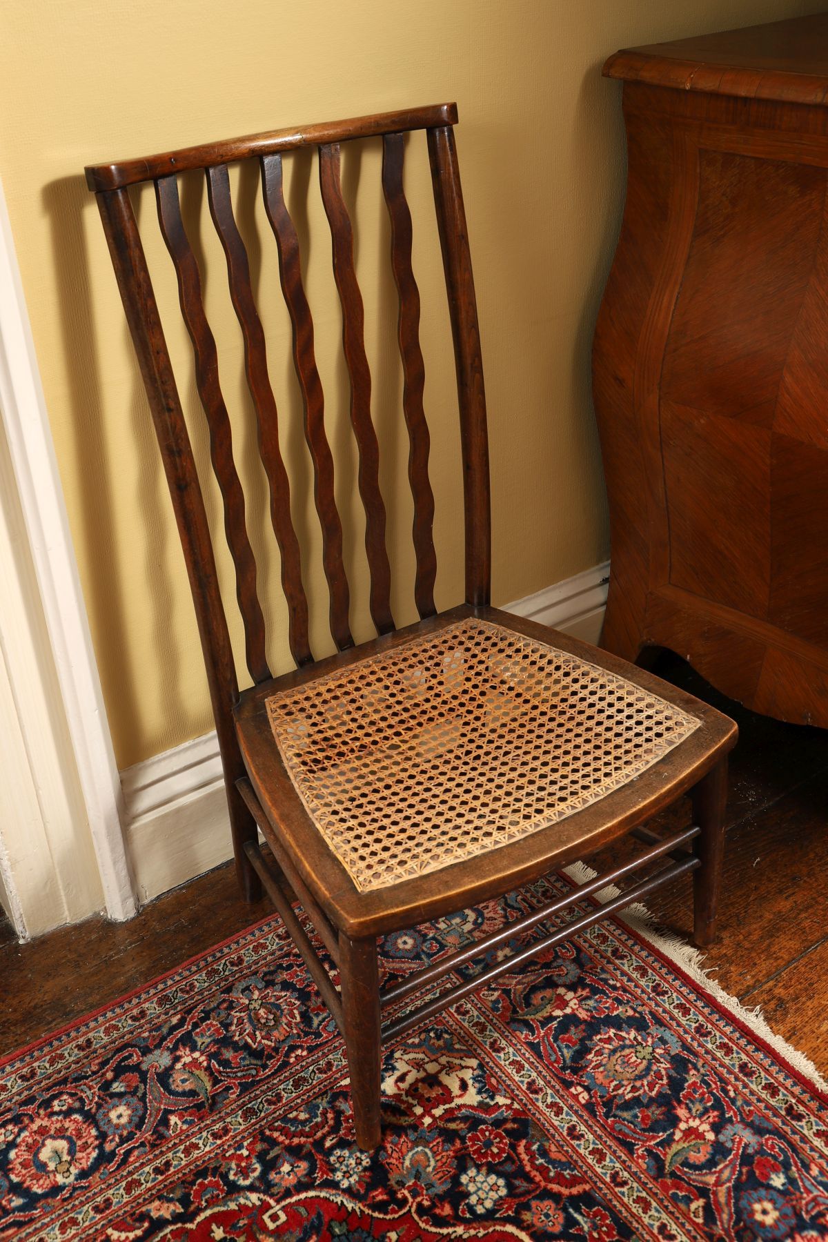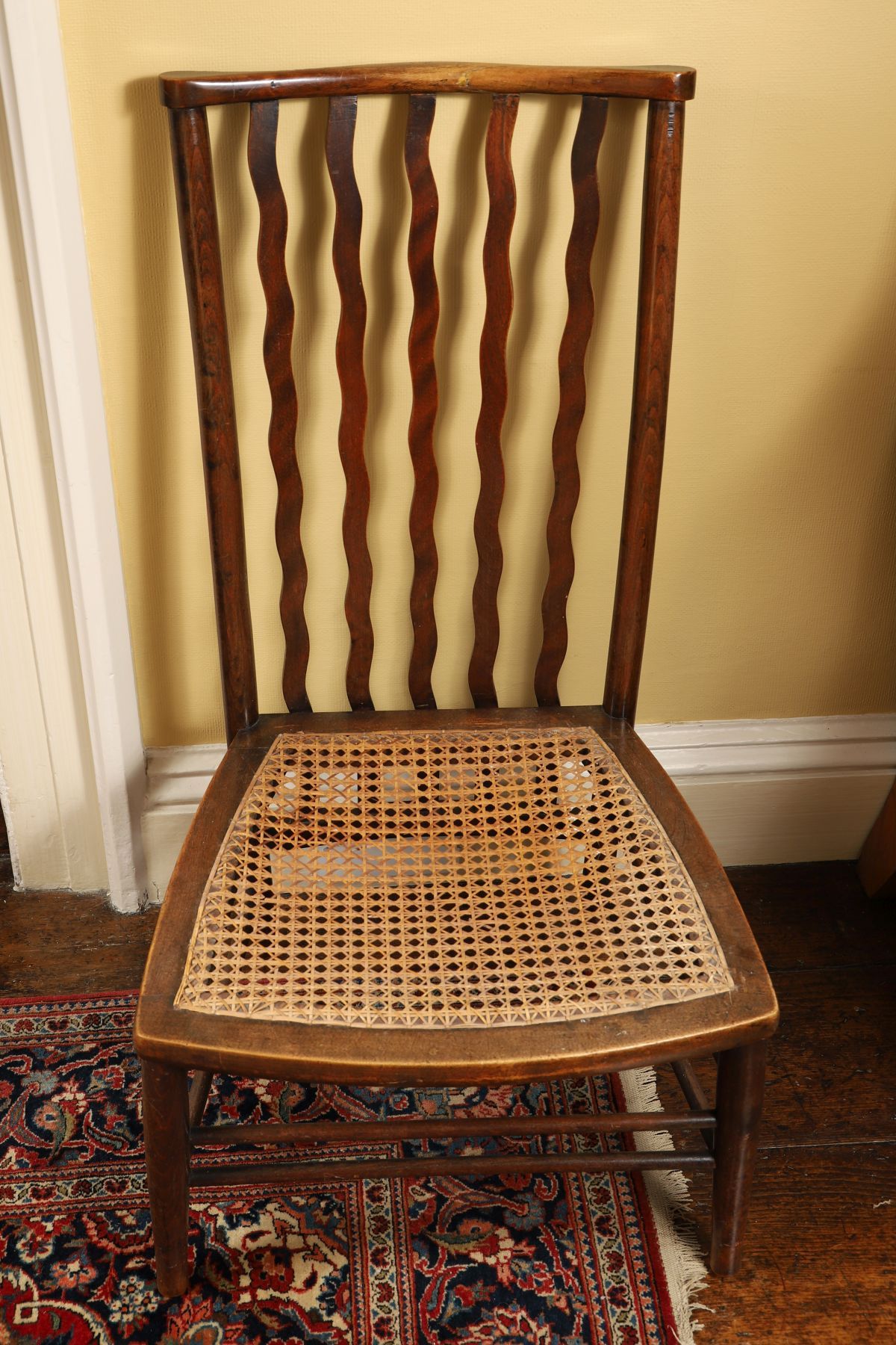 An Edwardian beech occasional chair with shaped rail back, vertical splats, and woven seat, raised on square-section legs united by stretchers.