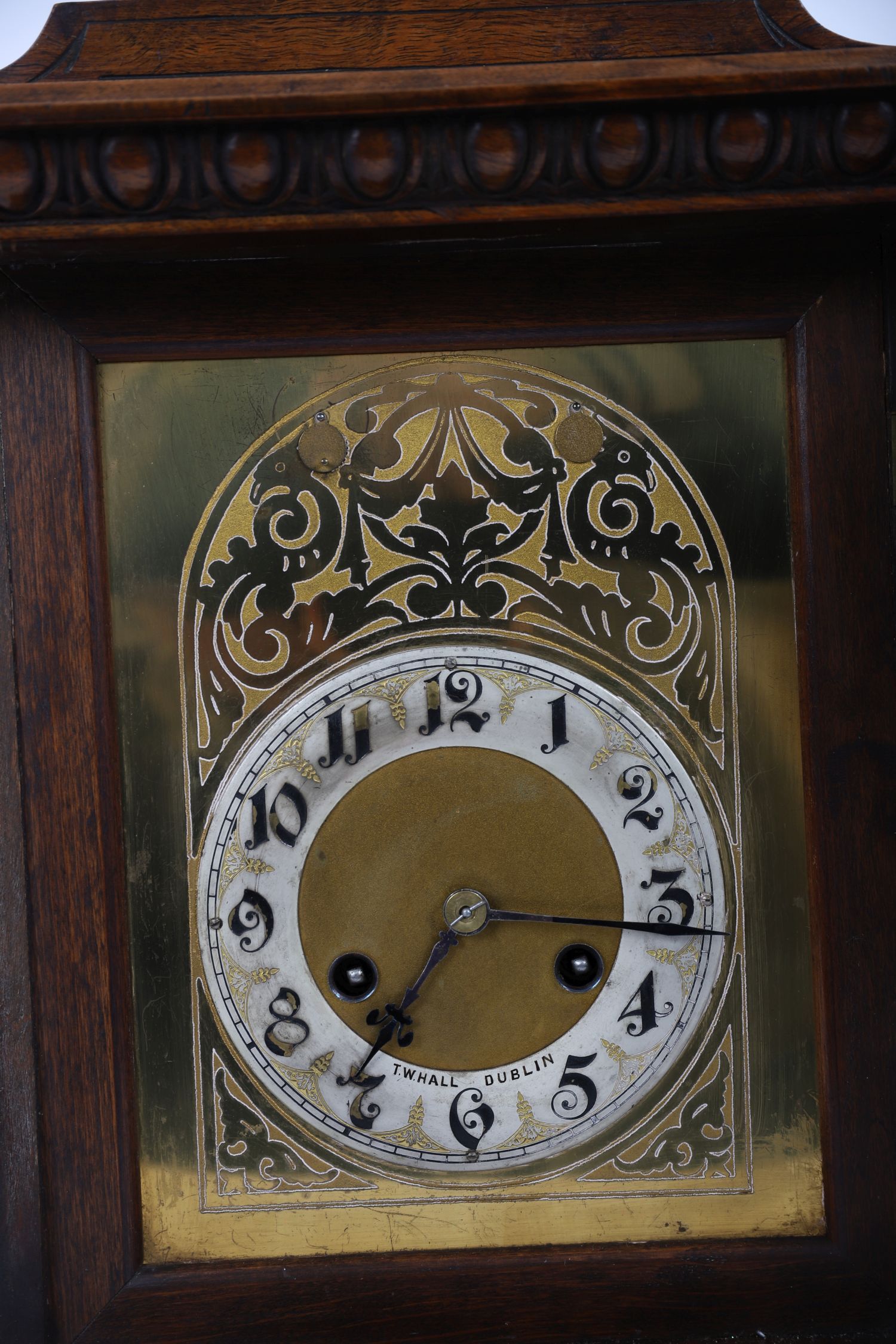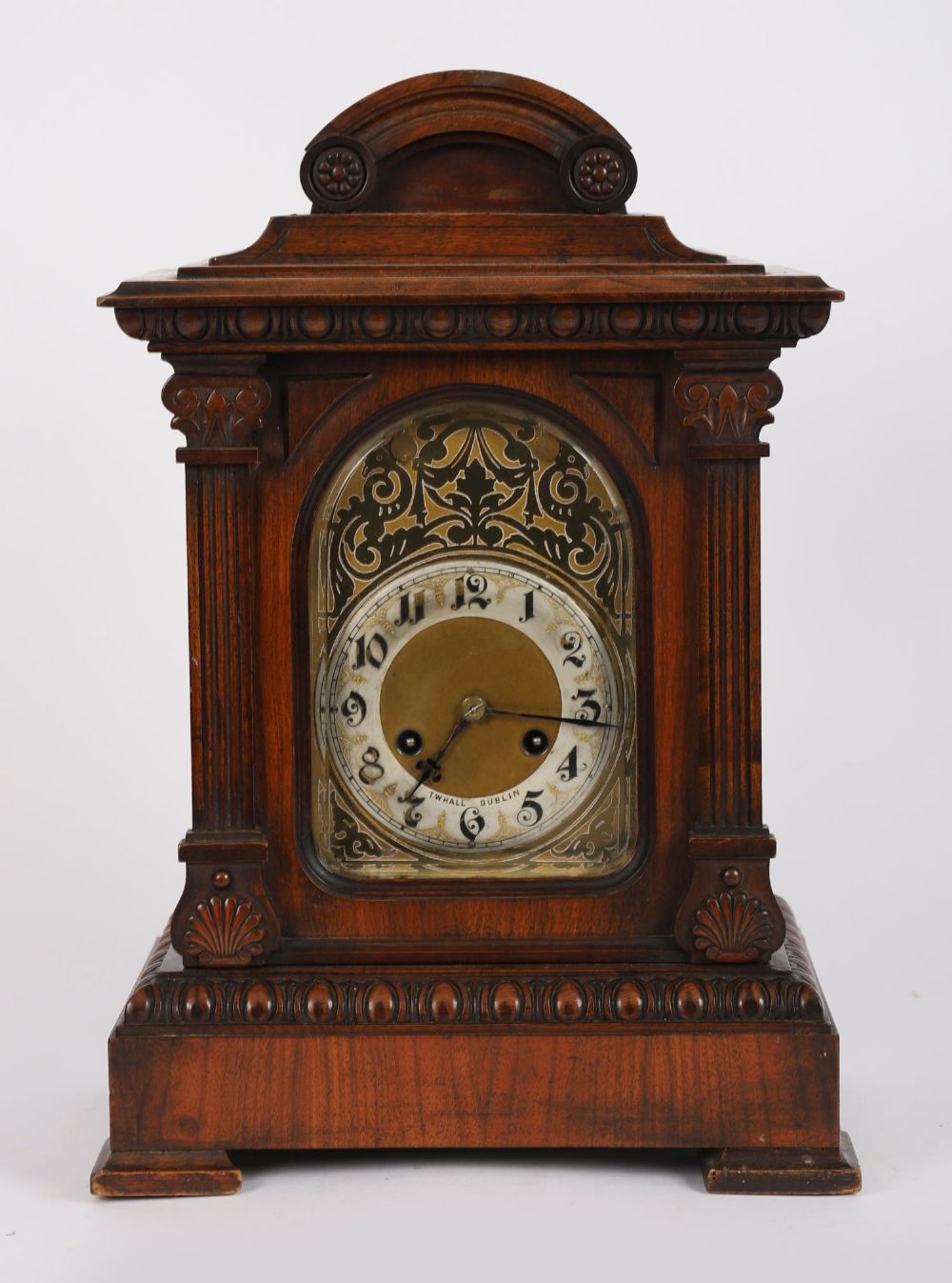 An early 20th-century mahogany bracket clock with arched pediment, silvered dial, and engraved spandrels, signed T. W. Wall, Dublin.