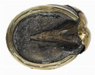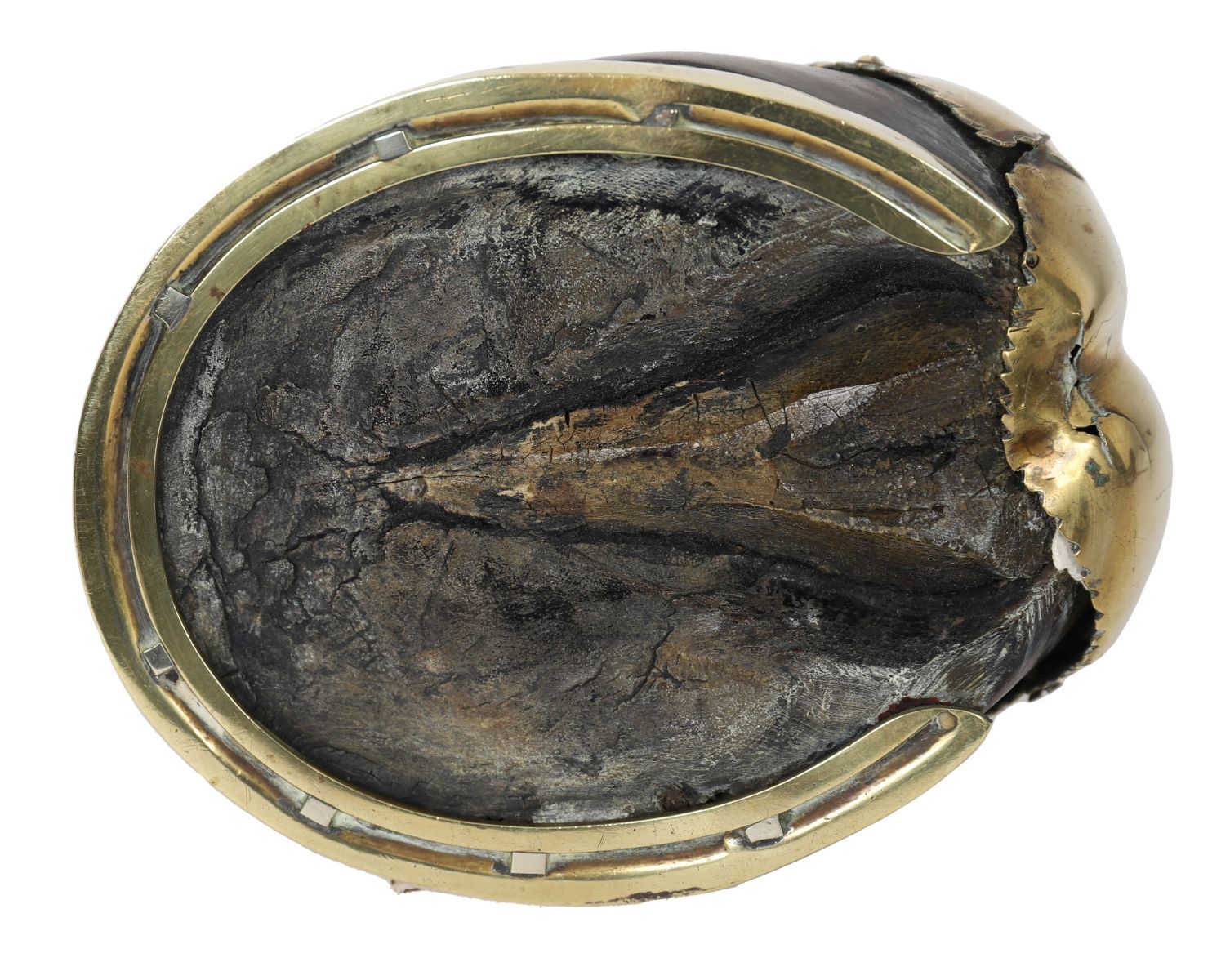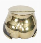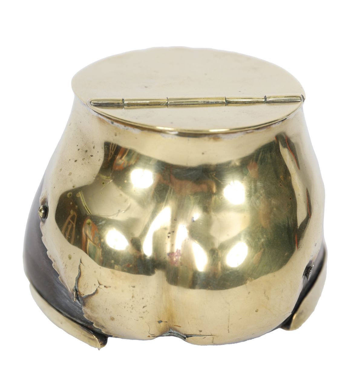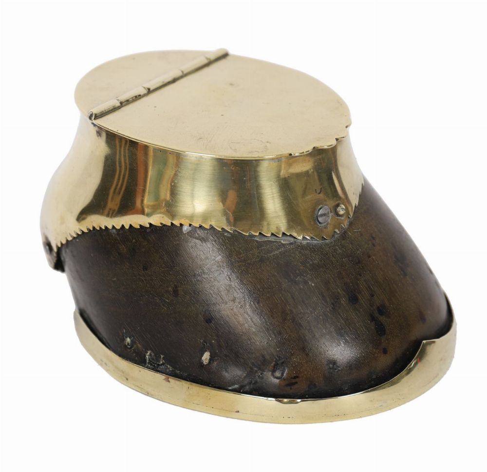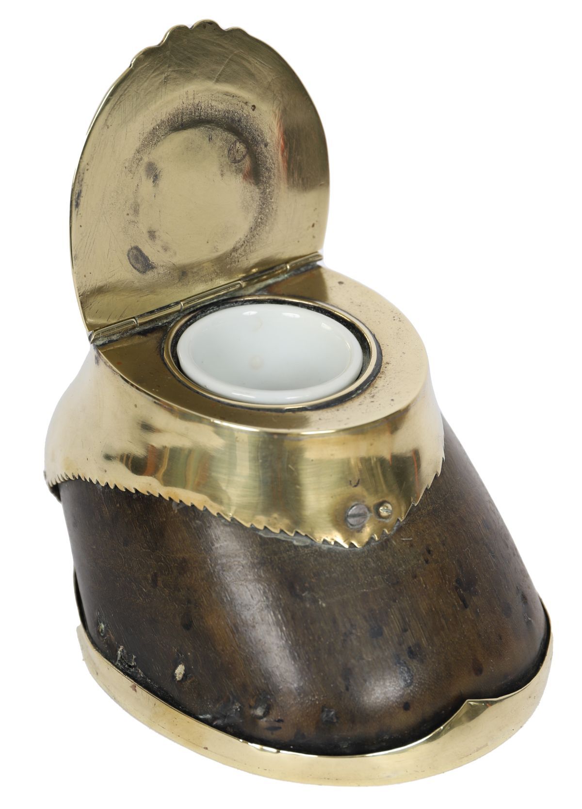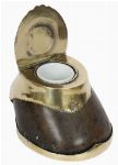 An Edwardian brass-mounted horseshoe inkwell, the hinged brass cover opening to reveal a glass liner, mounted on a natural horseshoe base.