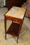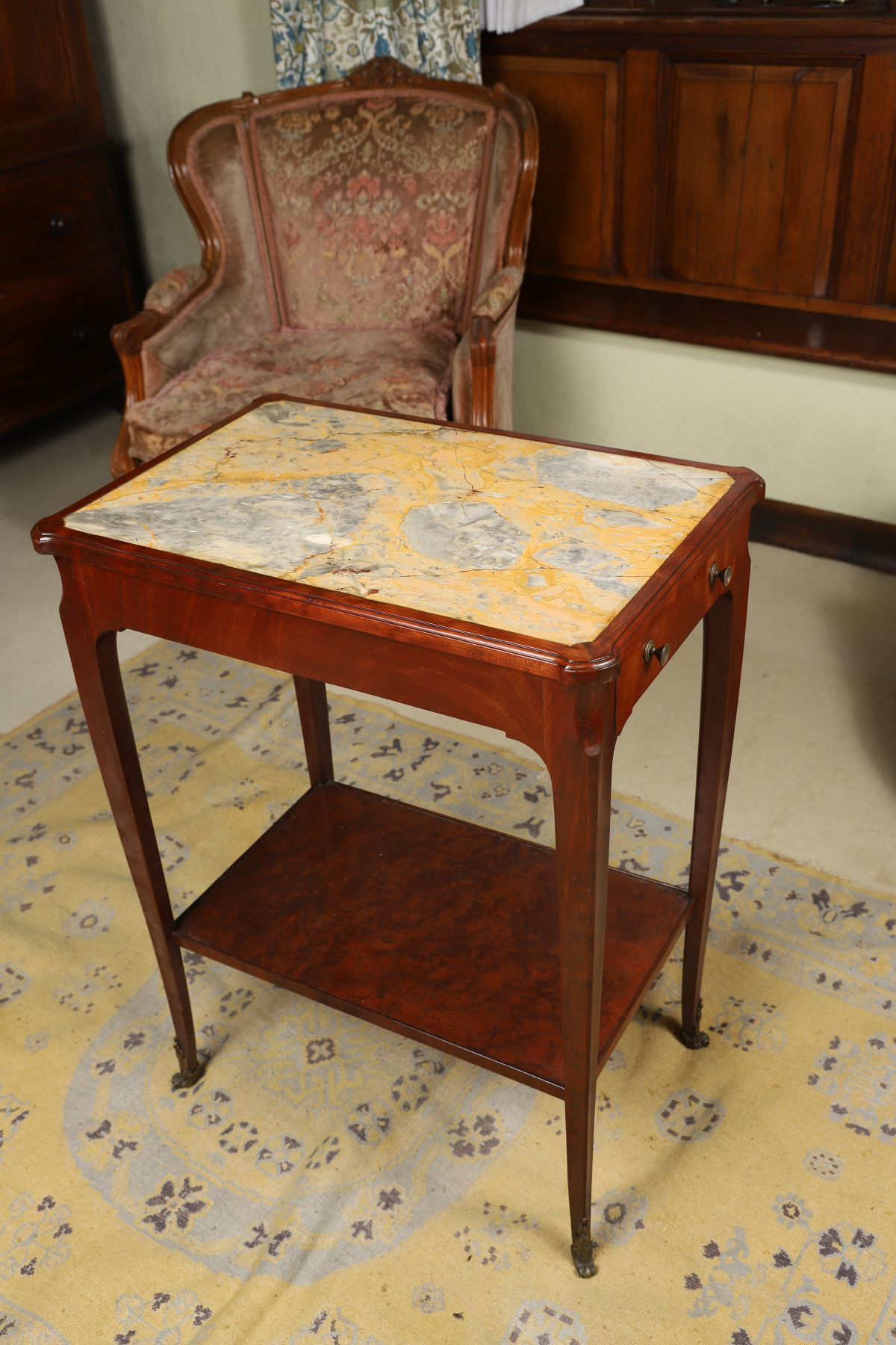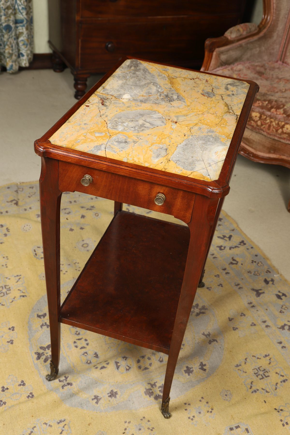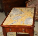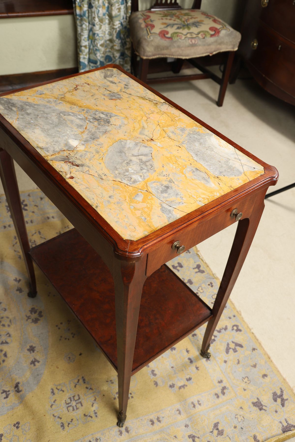 the rectangular marble inset top above a real and opposing faux end drawer, raised on cabriole legs, joined by an undershelf.