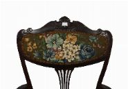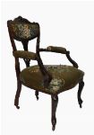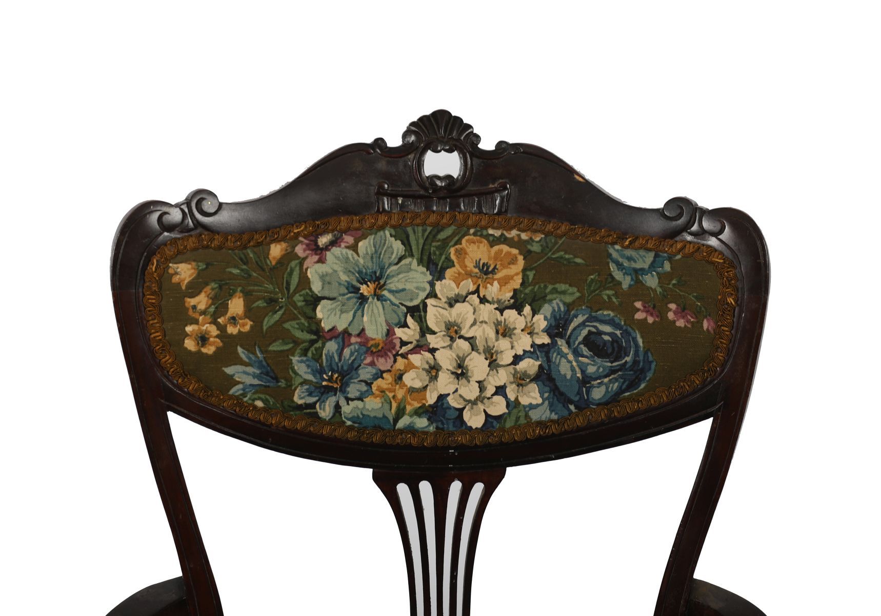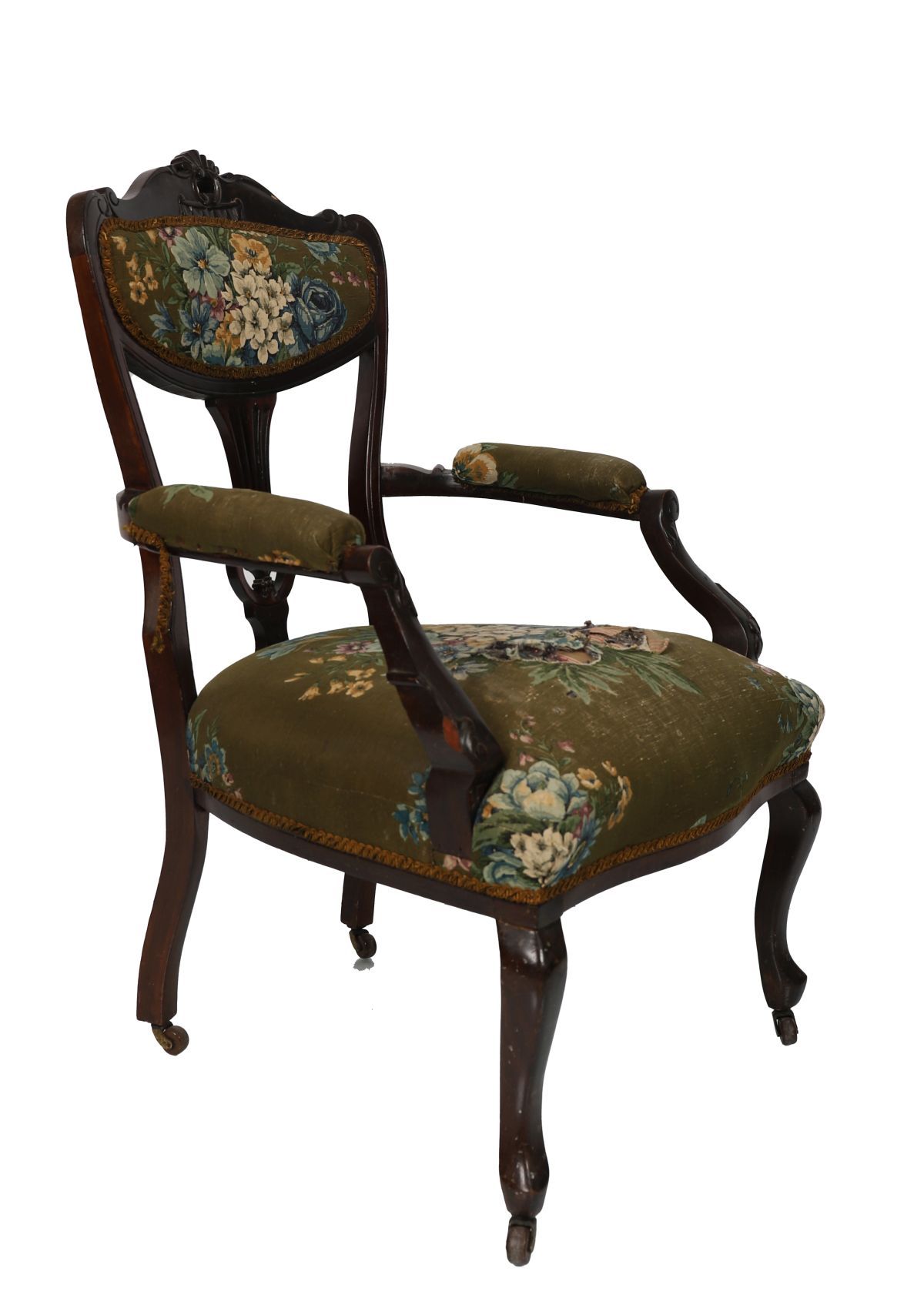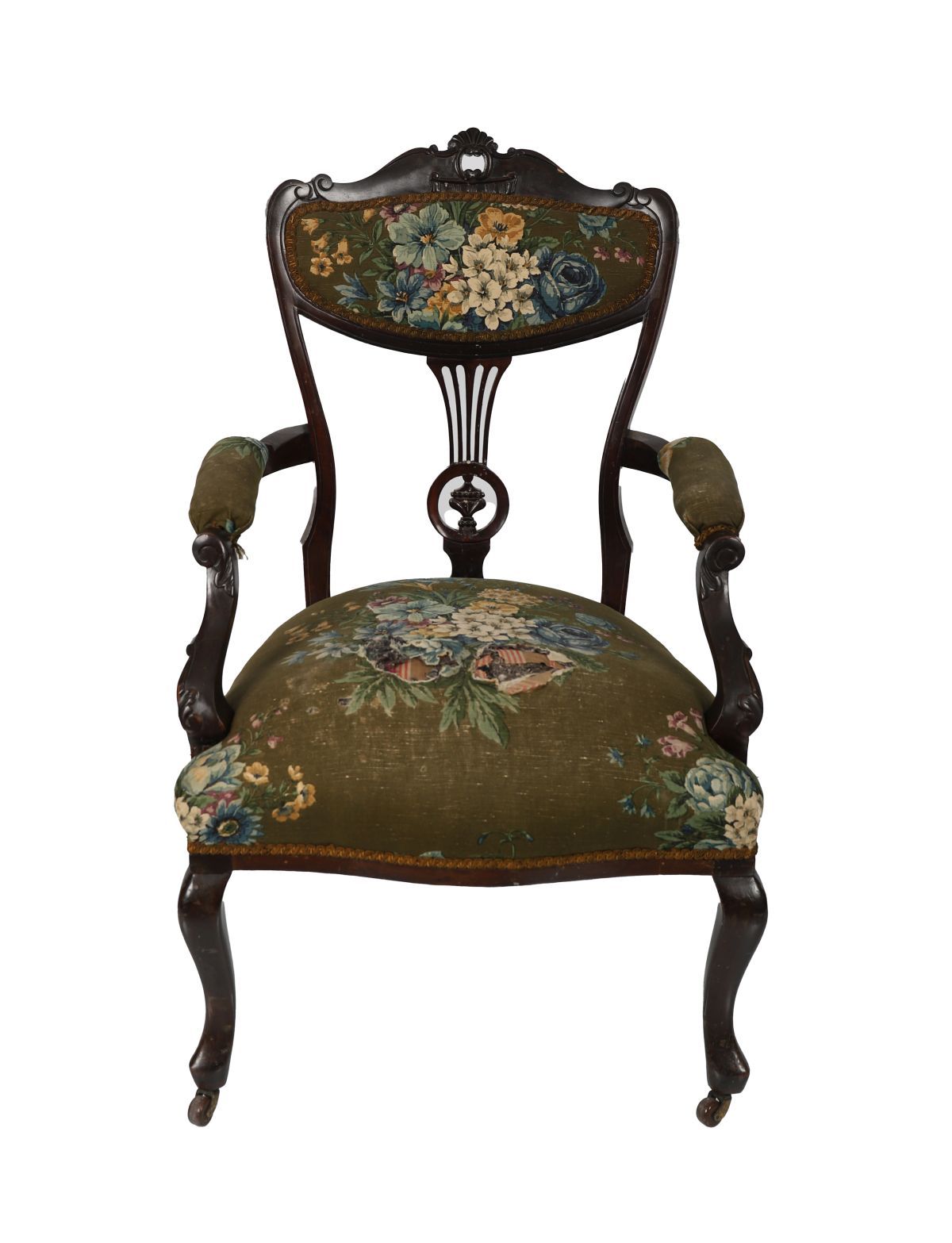A Edwardian carved mahogany armchair with pierced and scroll-carved back, floral needlework upholstery to back and seat, and cabriole front legs with scroll feet. Circa 1880.