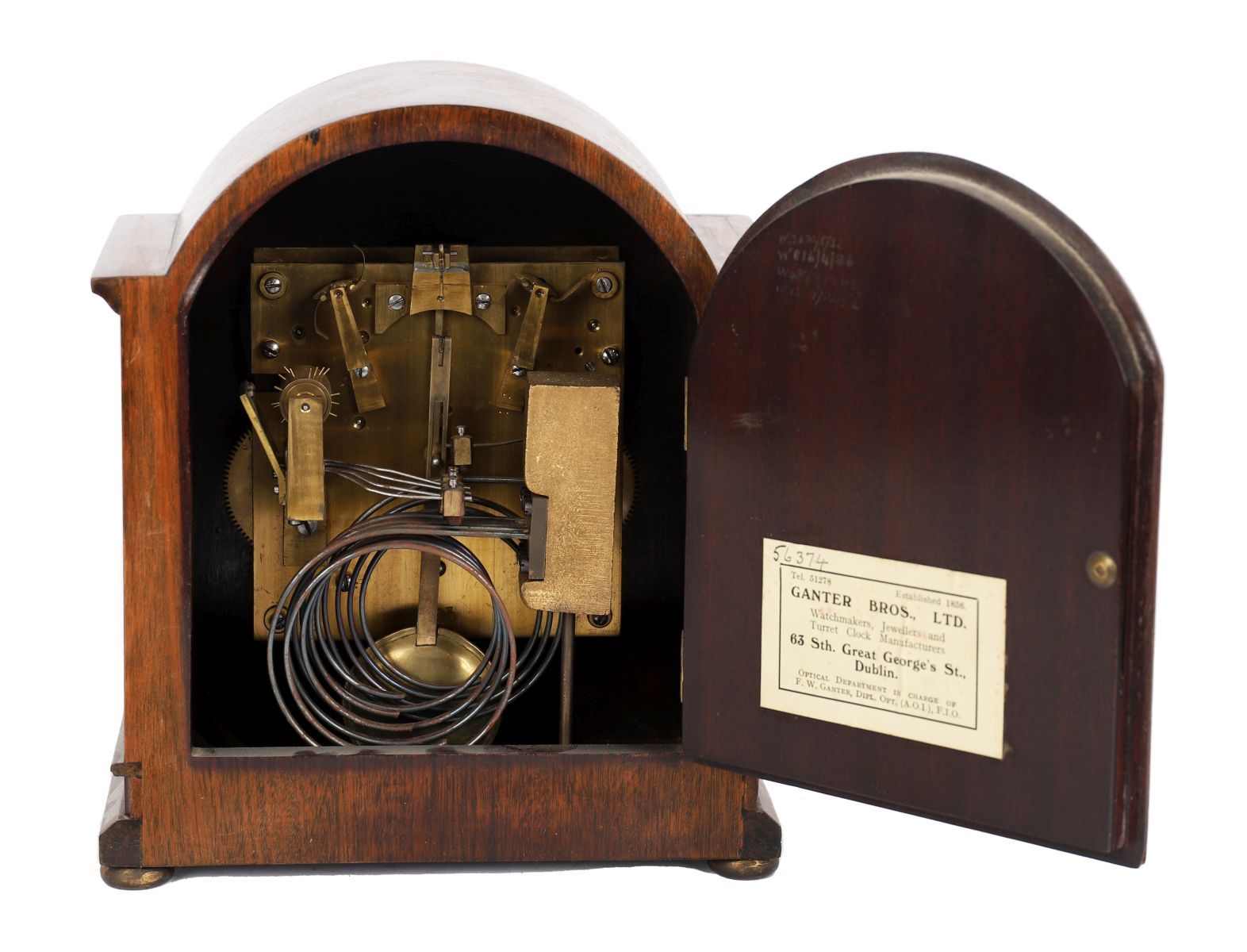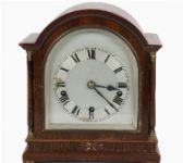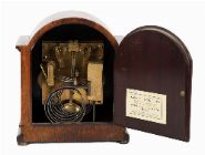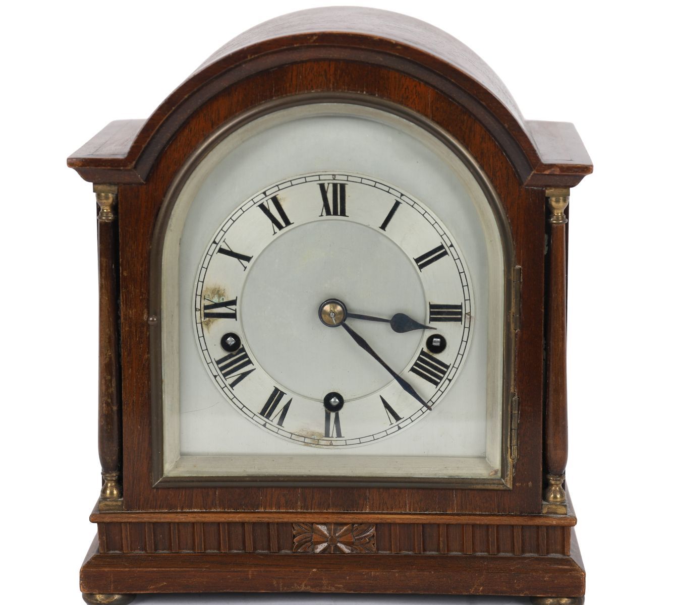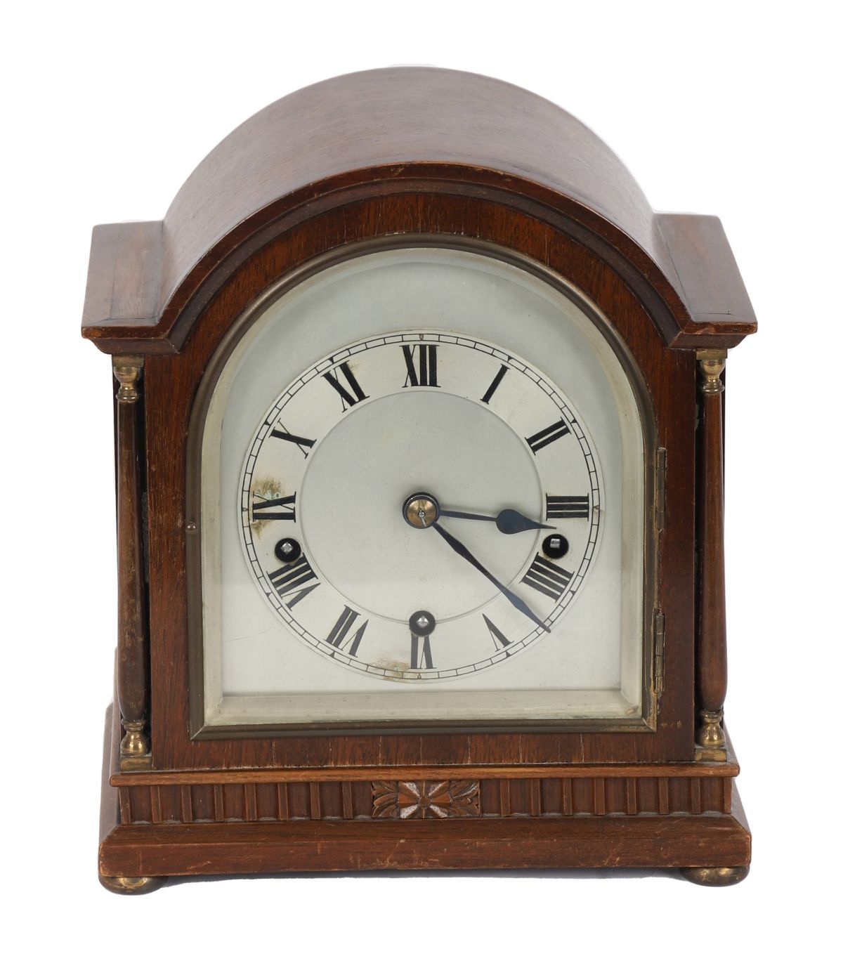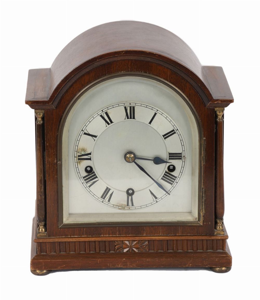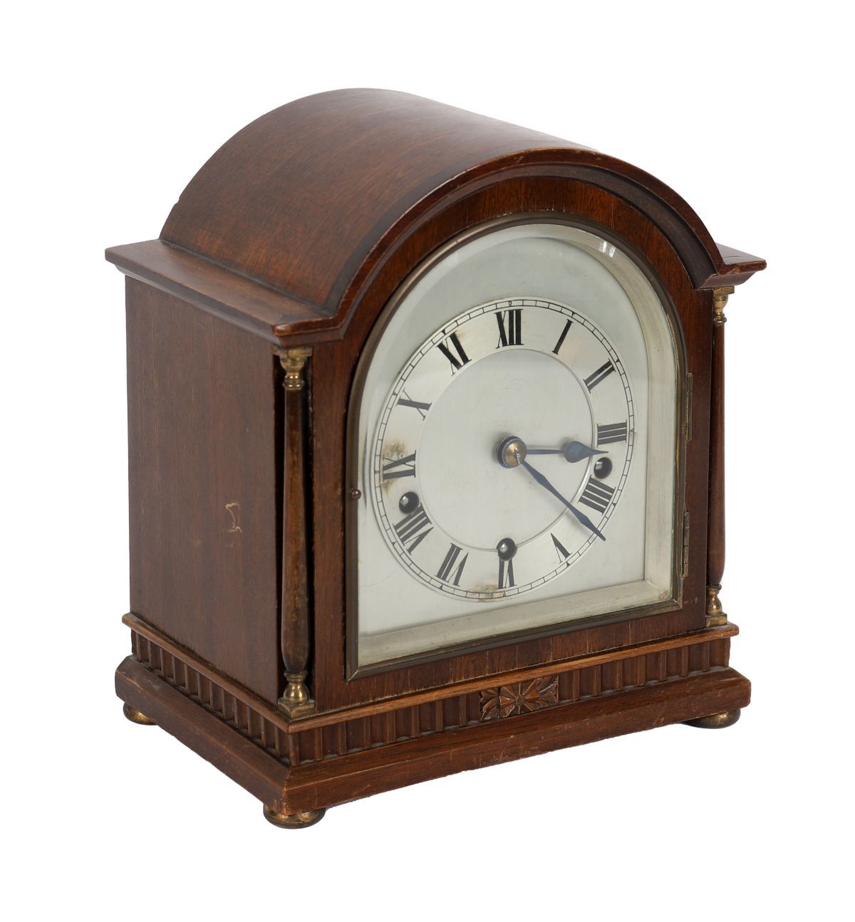 Arched case with silvered dial and Roman numerals.