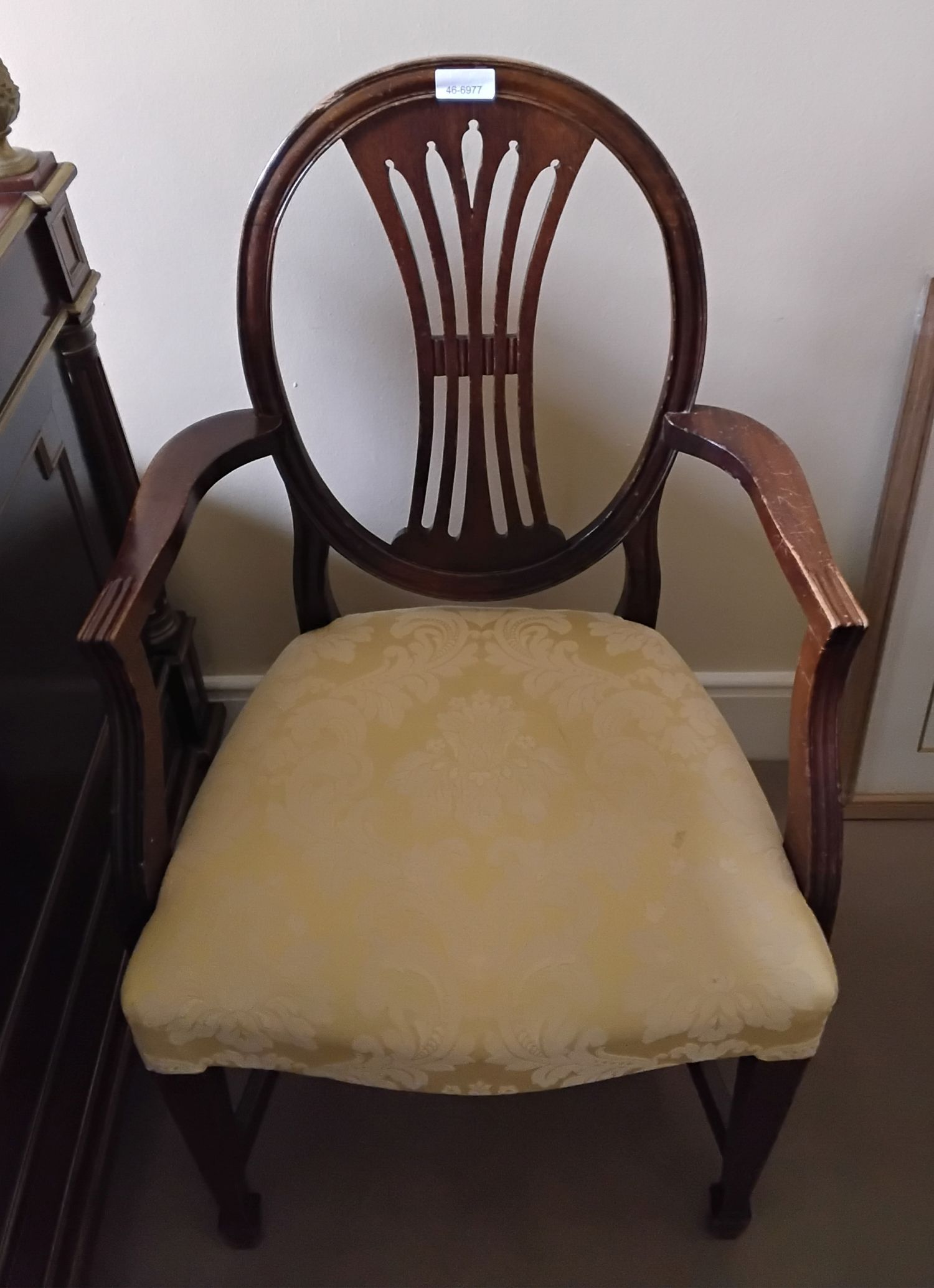 A mahogany elbow chair in the Hepplewhite manner, the shaped shield back with pierced splat, moulded arms and overstuffed drop-in seat upholstered in damask, raised on square tapering legs joined by stretchers.