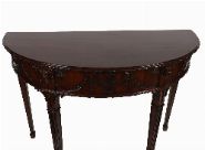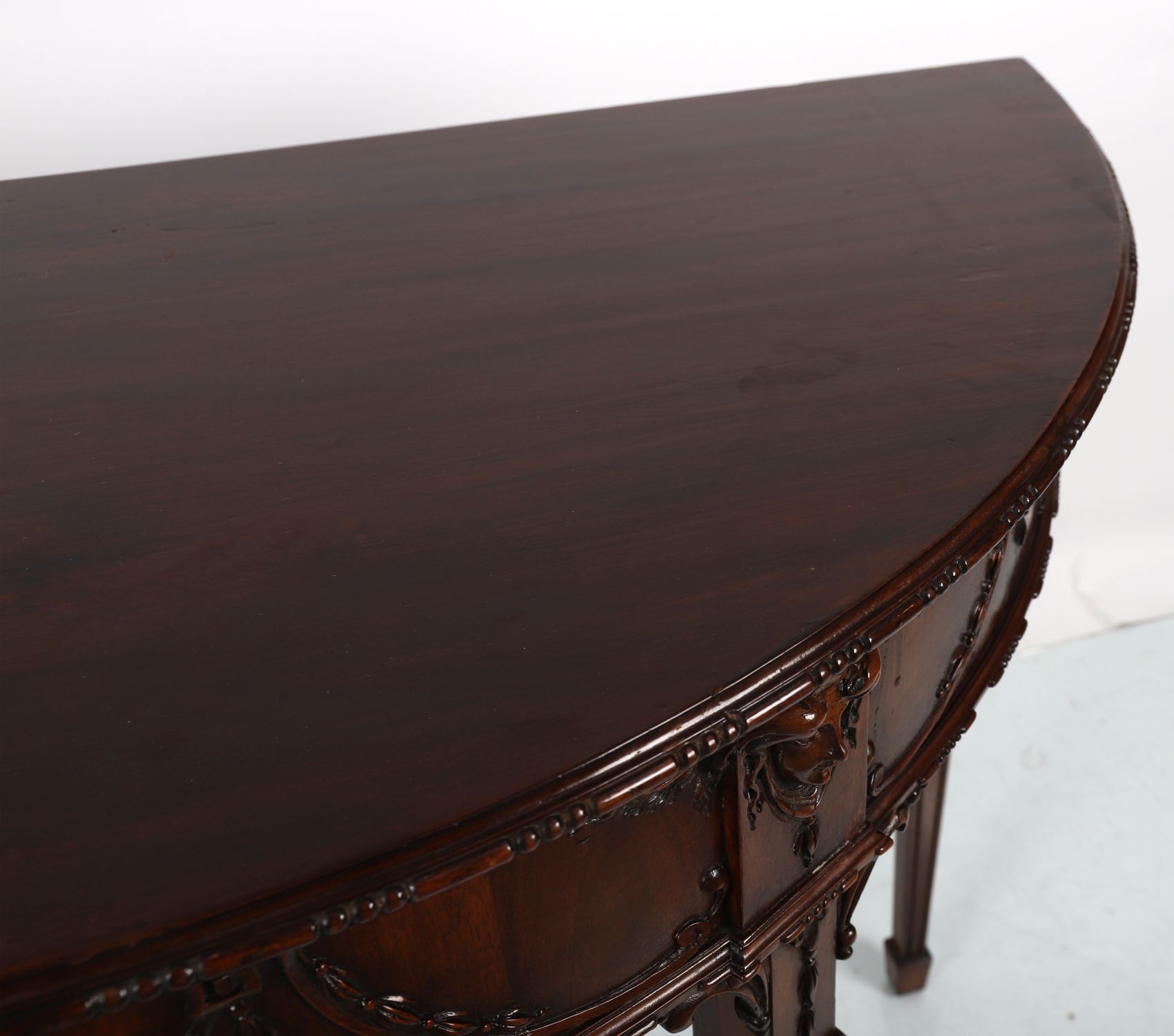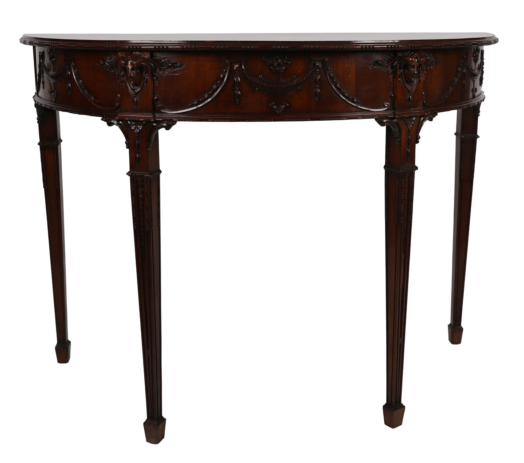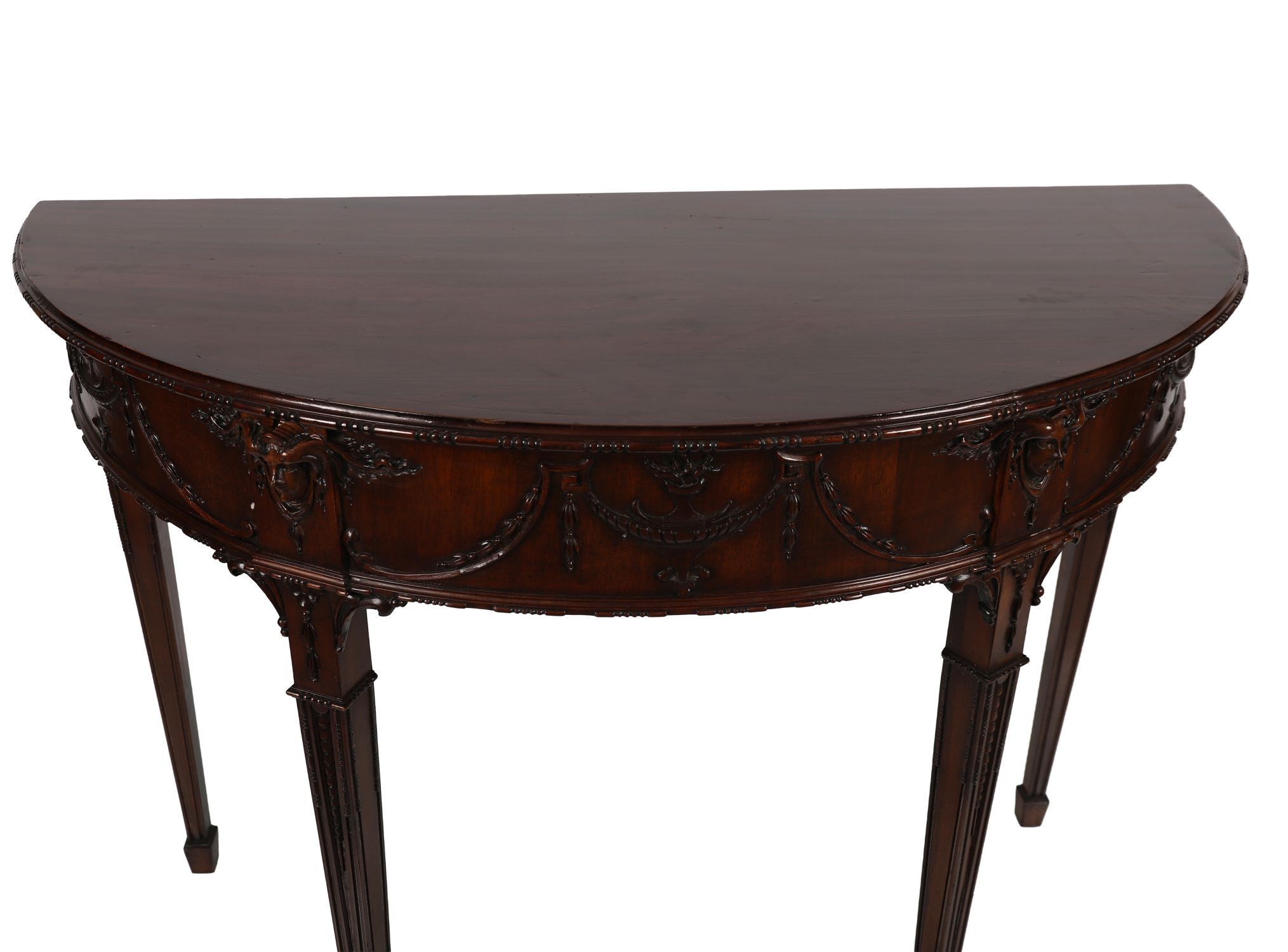 An early 20th-century Adam style demi-lune side table in mahogany, the frieze carved with swags and ribbon-tied husks centred by a ram's mask, raised on fluted tapering legs with spade feet.
