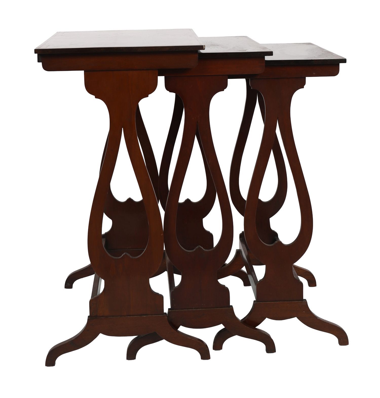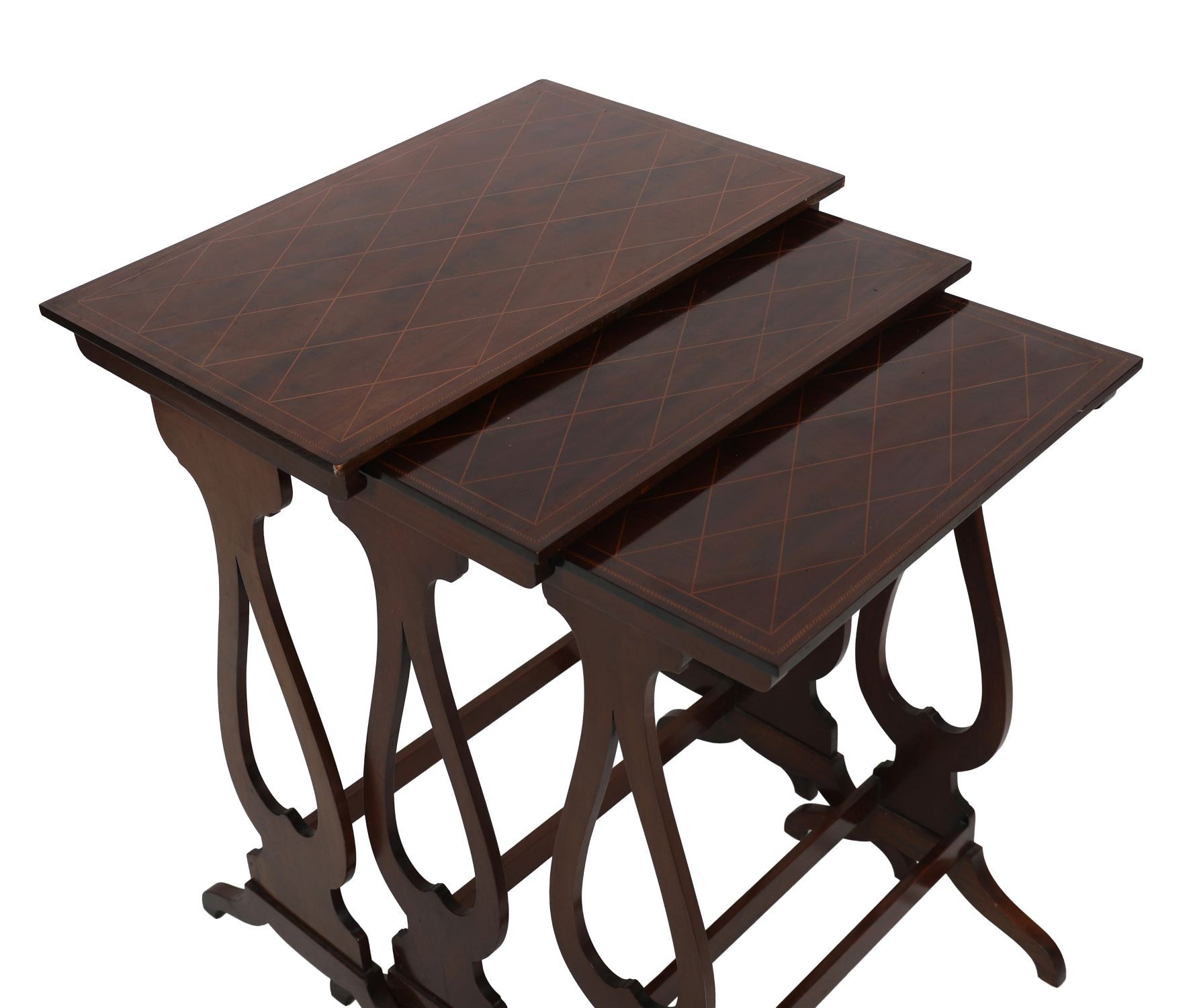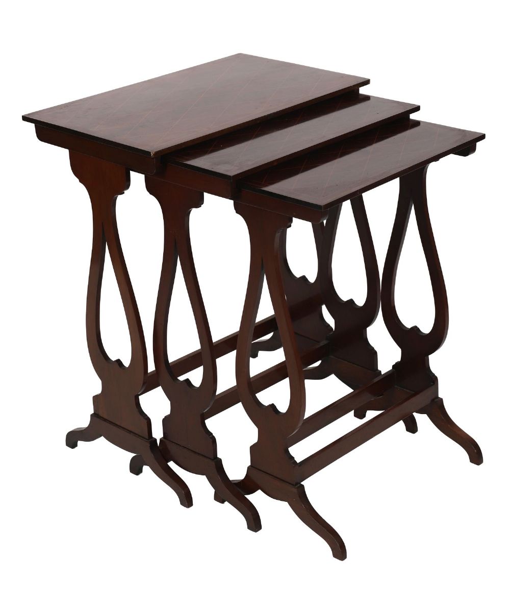 An Edwardian nest of three mahogany tables, each rectangular top with boxwood line and lozenge inlay, raised on slender lyre-shaped end supports united by stretchers. Designed for versatility in the drawing room, these tables combine practical elegance with refined inlay decoration.