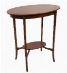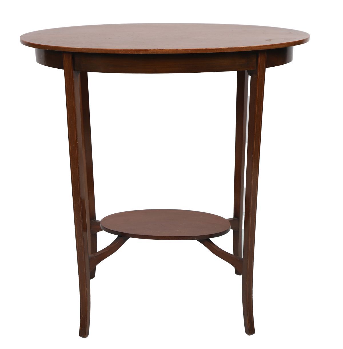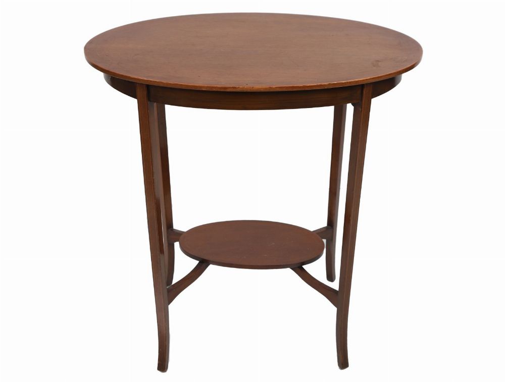 The oval-shaped top above a conforming frieze, raised on square tapered and outswept legs joined by an undershelf.