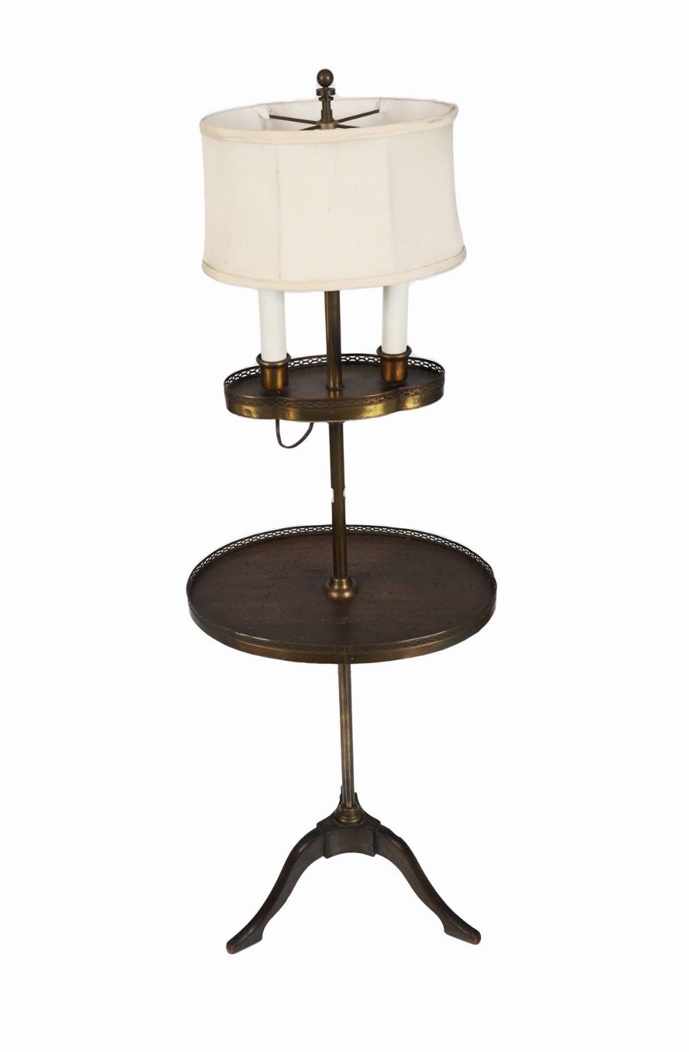 A tall Edwardian mahogany and brass three-tier standard lamp, each circular shelf with pierced brass gallery, raised on a tripod base, with twin electric fittings and pleated shade.