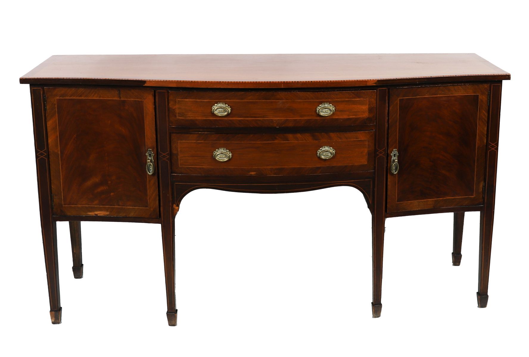 the rectangular shaped top with a serpentine front, above two central drawers flanked by curved panel doors, all furnished with brass handles, raised on square tapered legs terminating on spade feet.