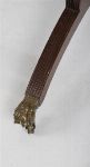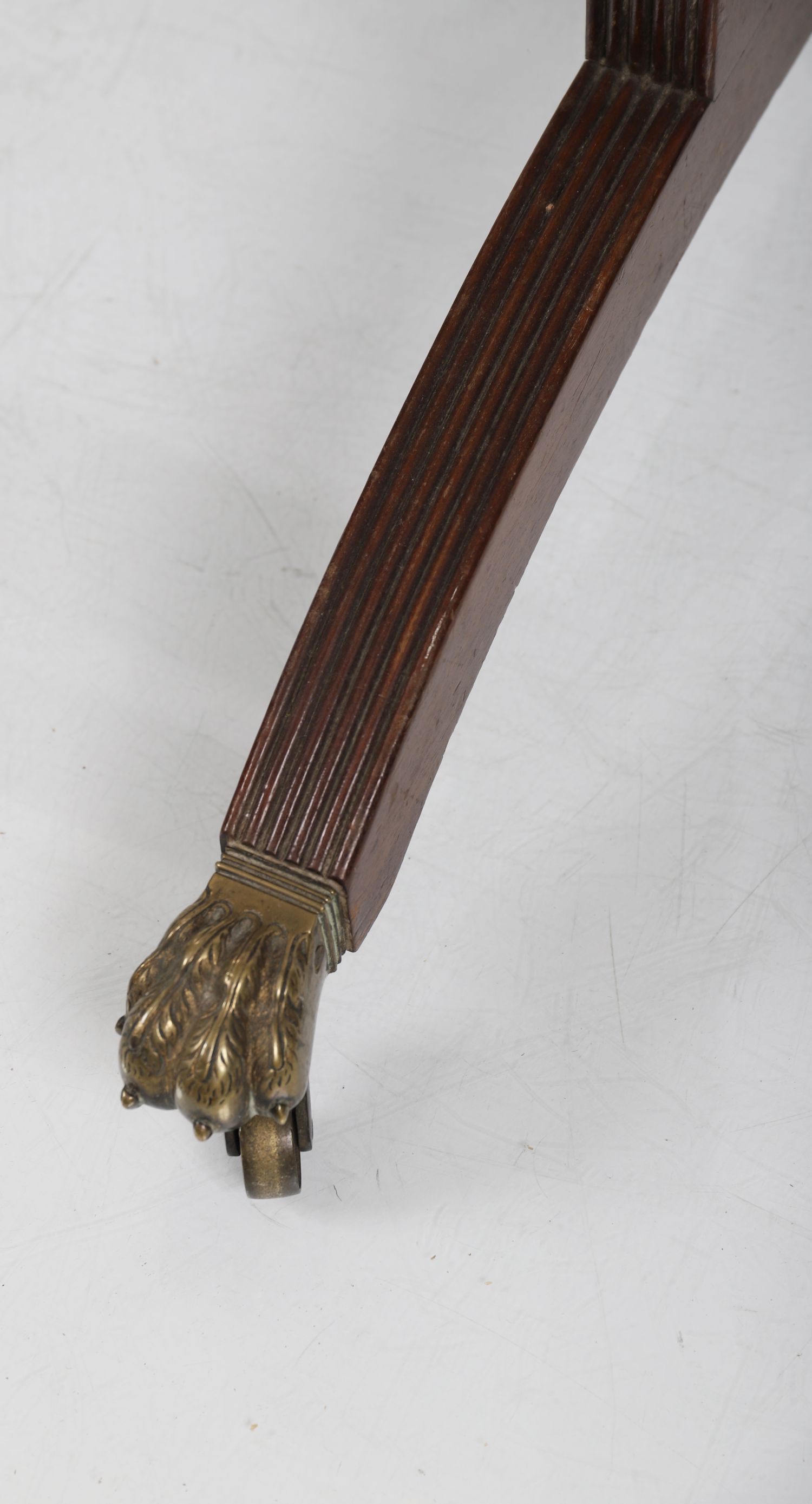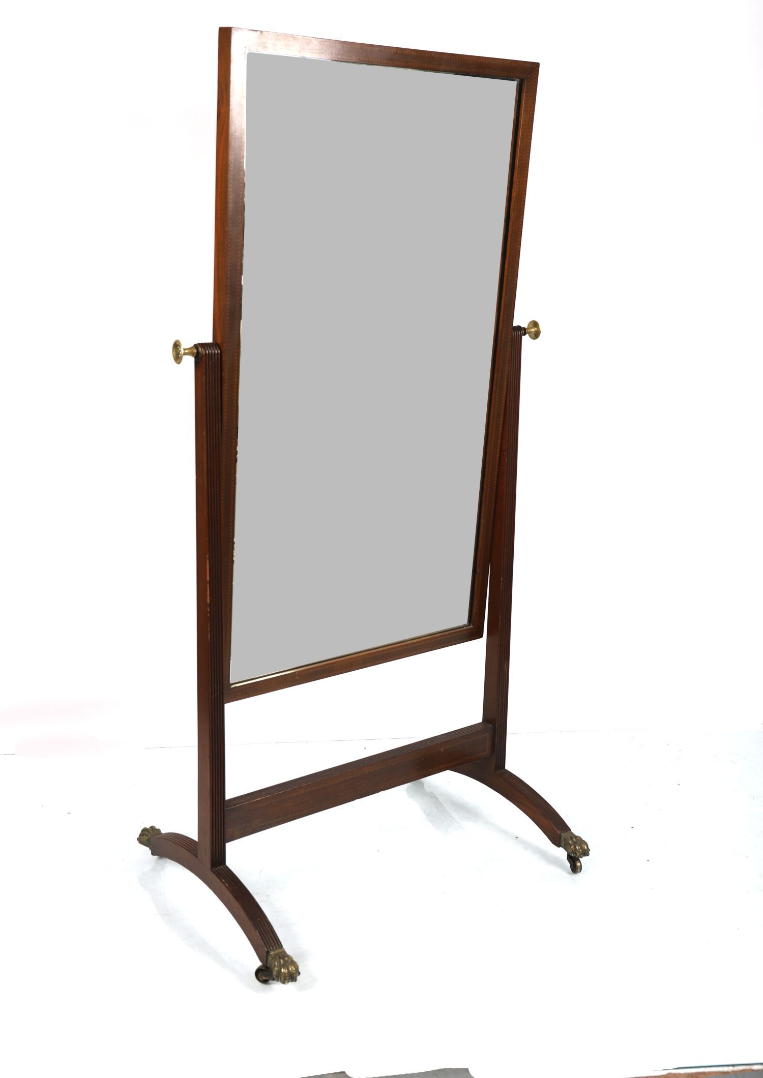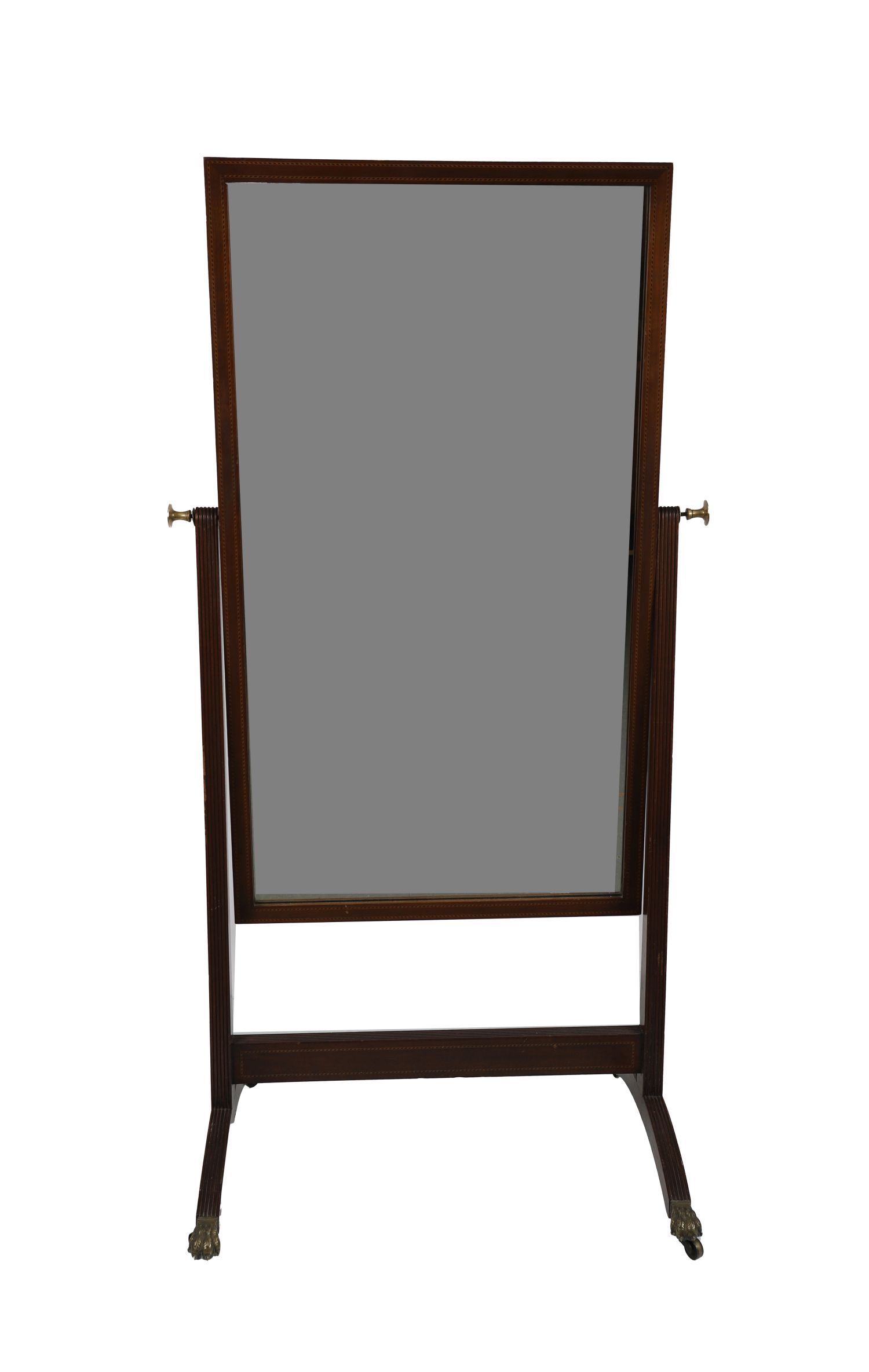 An early 20th-century mahogany cheval mirror, the rectangular bevelled plate in a line-inlaid frame, supported on reeded uprights and splayed legs terminating in brass paw caps and castors.