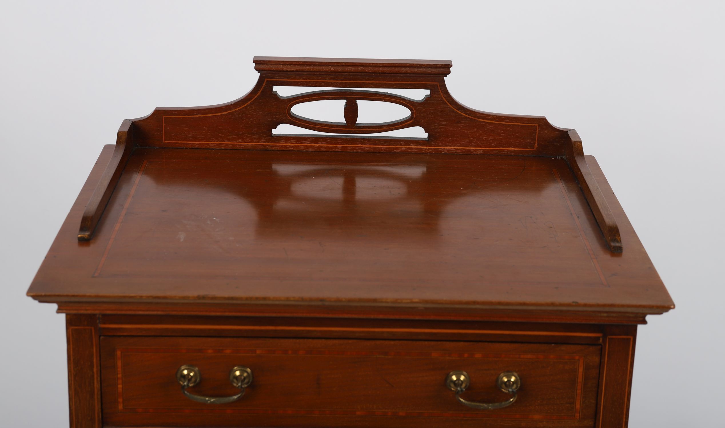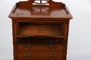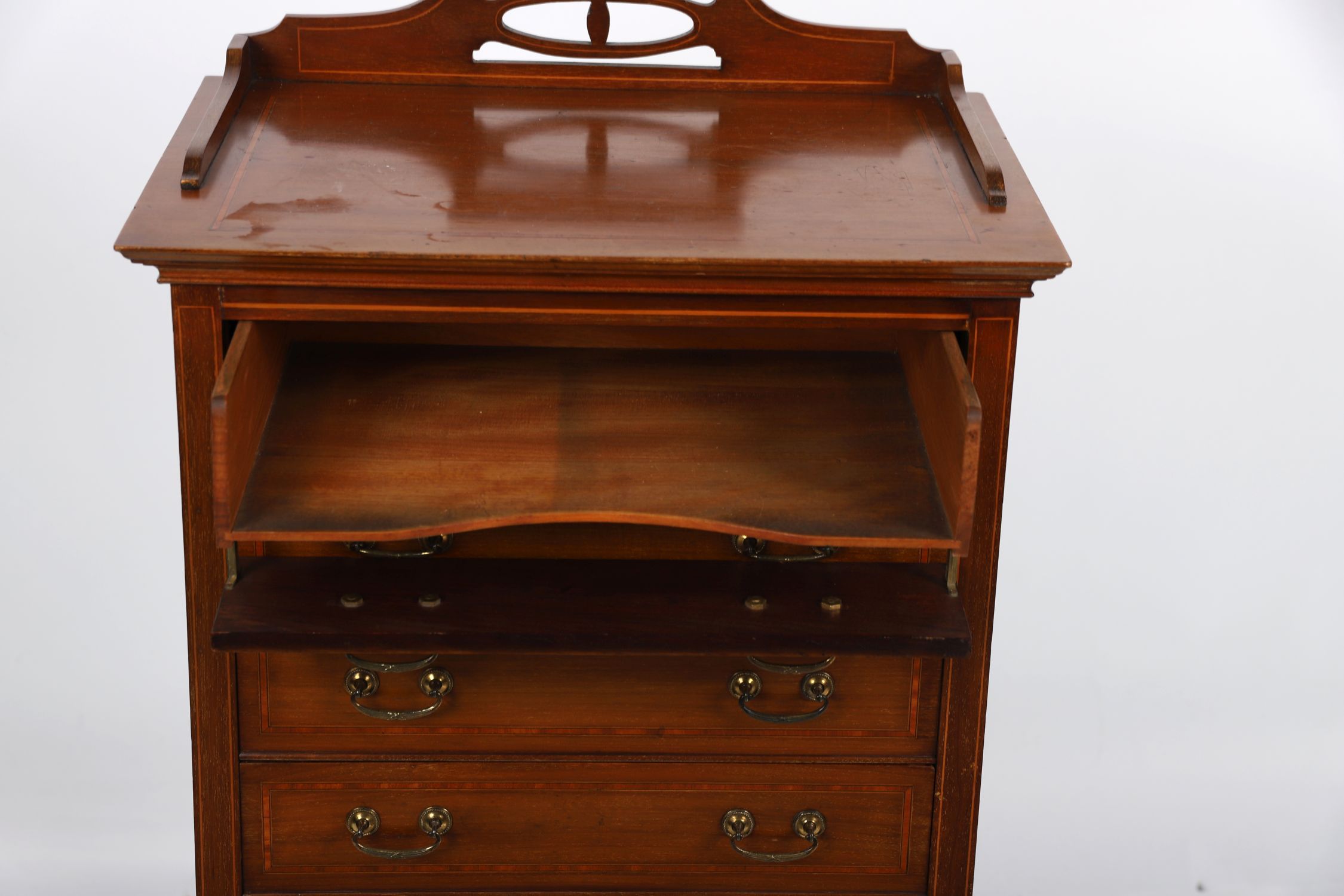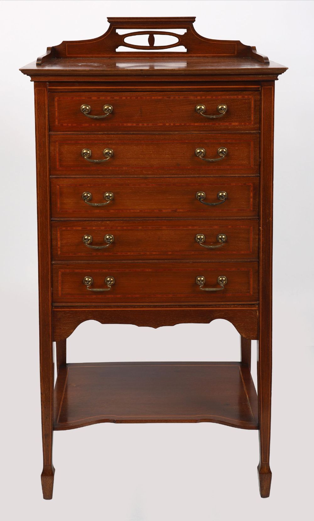 the rectangular form fitted with a series of drop-front drawers designed for sheet music, each with brass swing handles. The facade decorated with boxwood stringing and crossbanded detail, standing on straight legs united by a shaped apron and under-tier shelf.