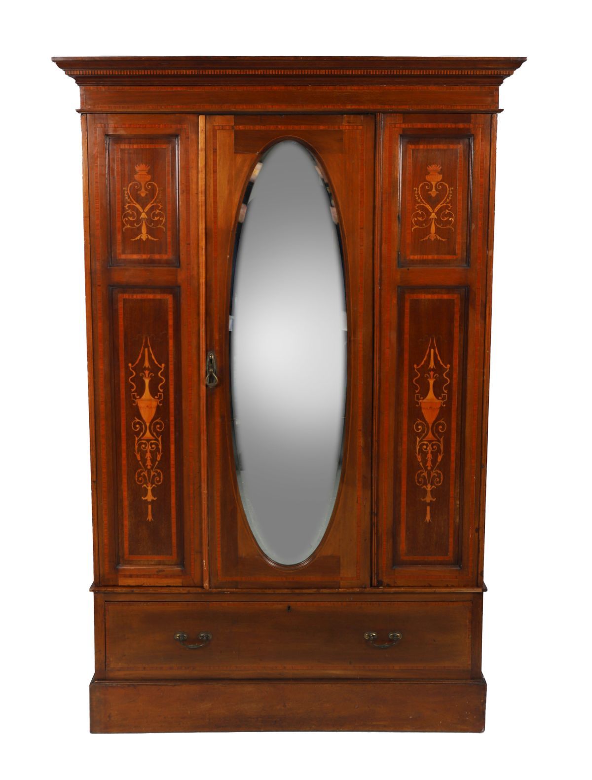 The moulded crown sits above an oval bevelled mirrored central door, flanked by a marquetry panel on either side, above a long drawer furnished with brass handles, and raised on a moulded square plinth.