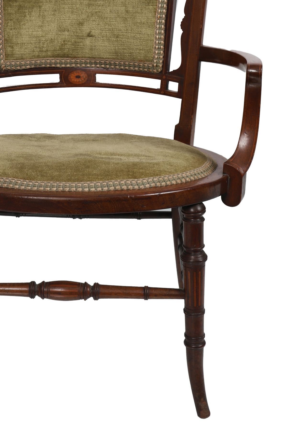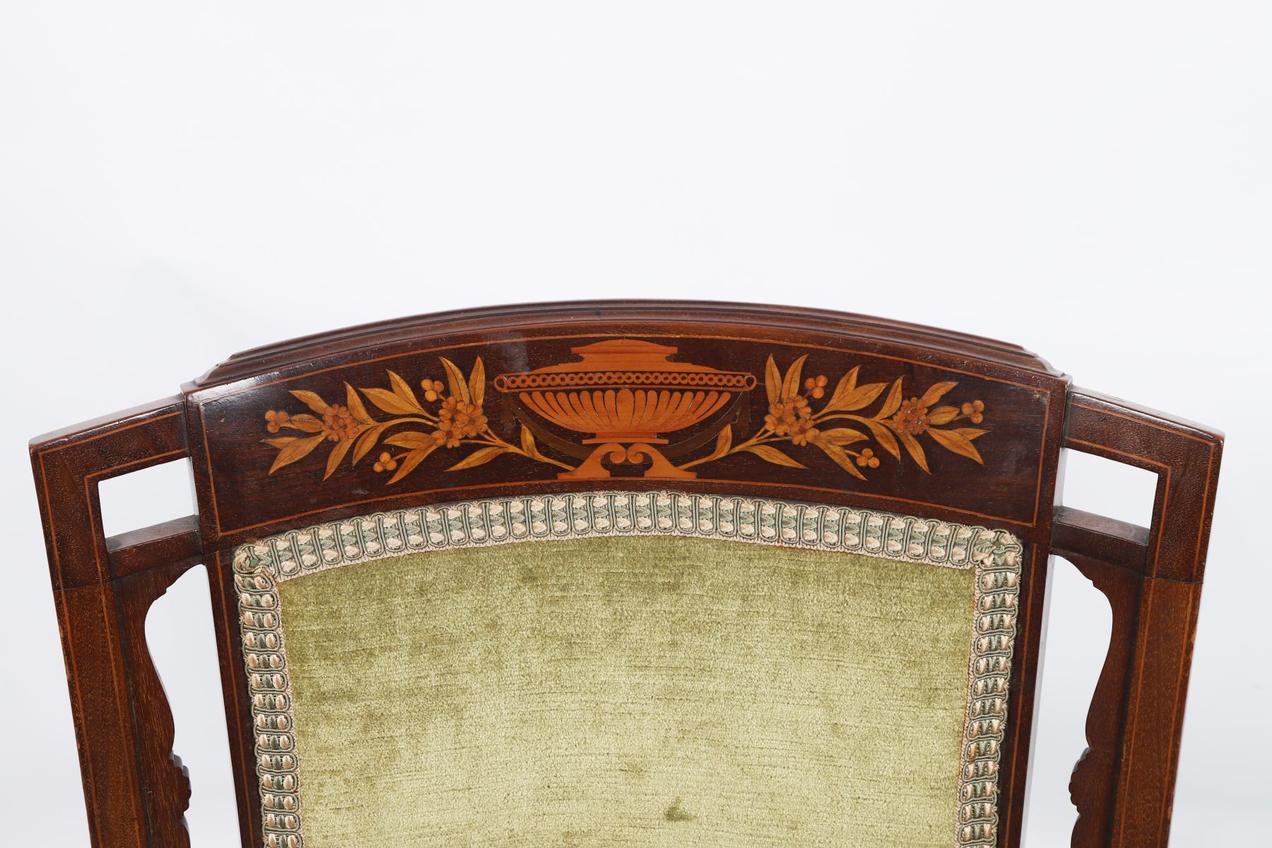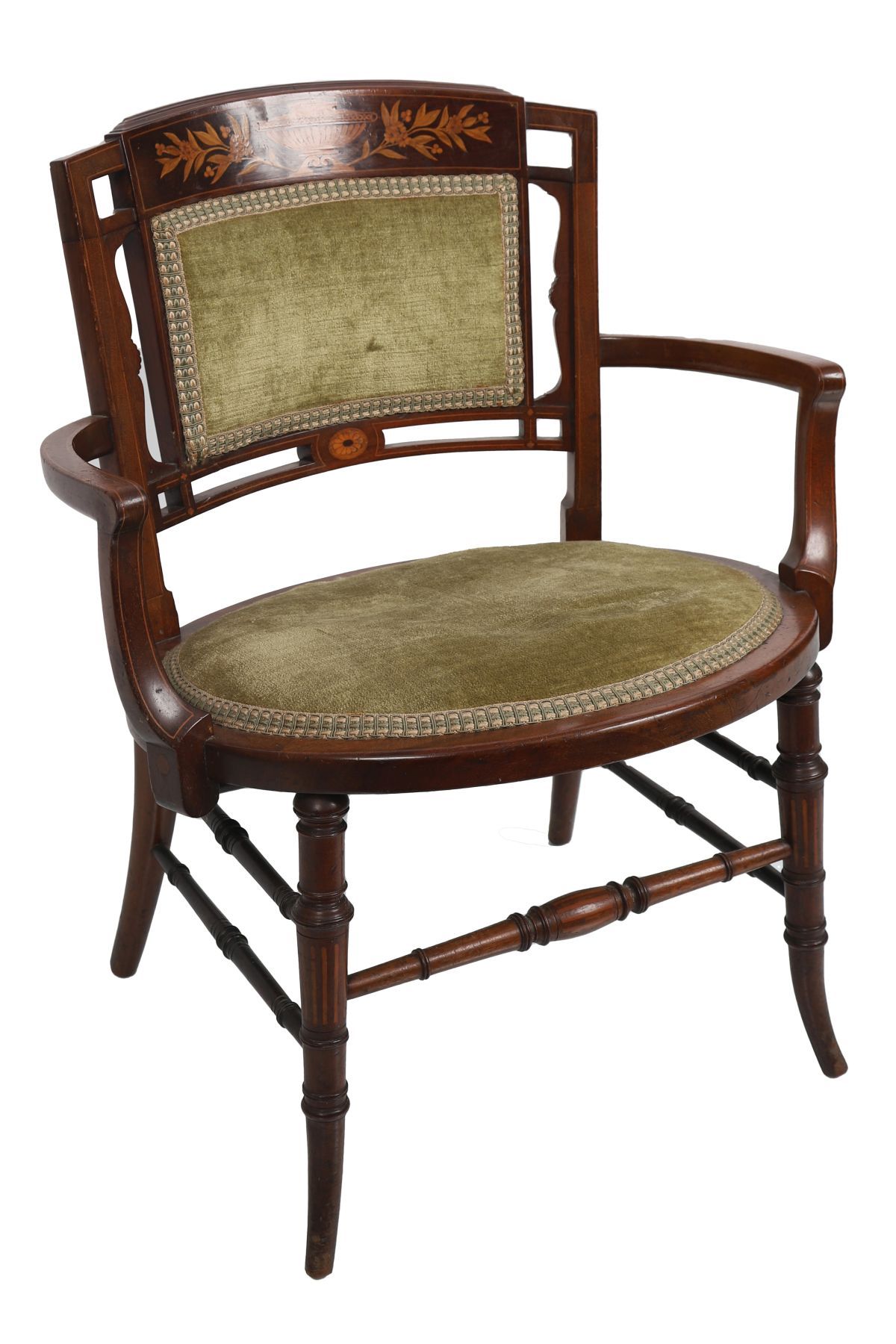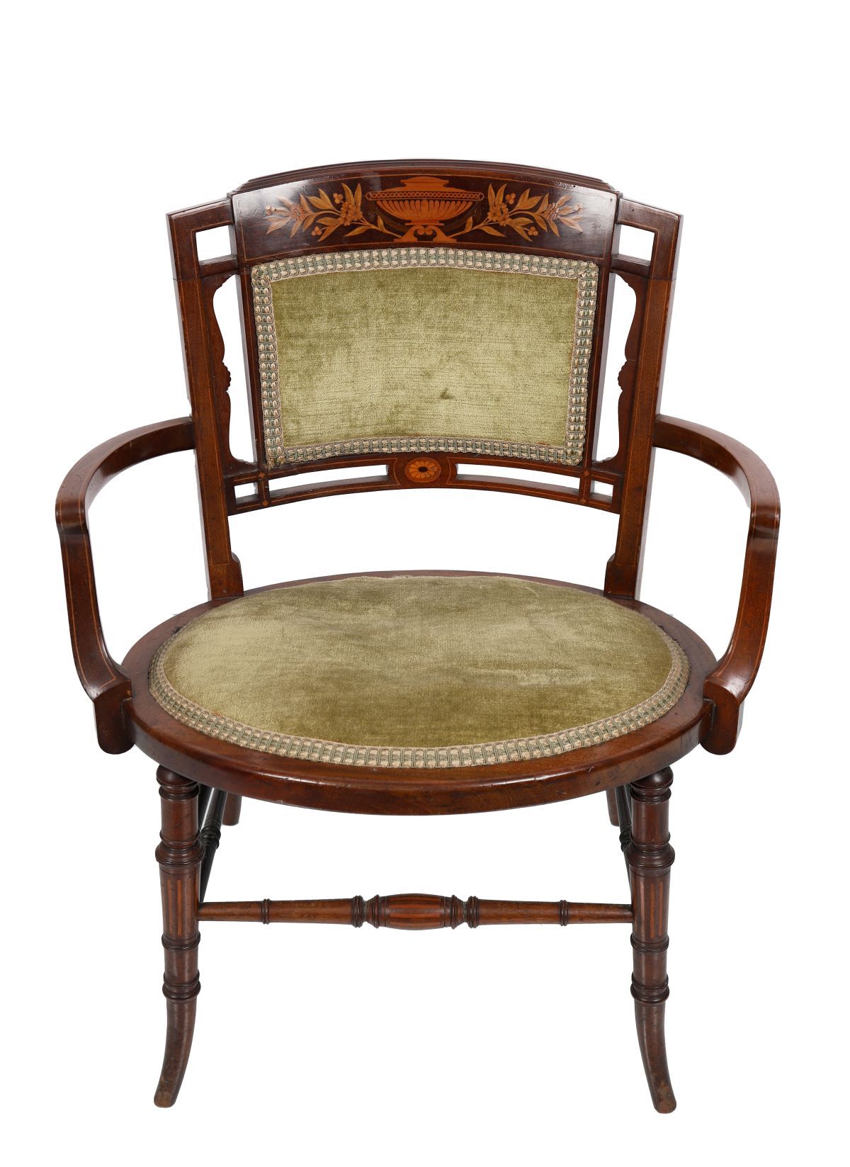 The curved, floral-inlaid crest rail sits above an upholstered cartouche over an oval panelled upholstered seat, between curvaceous arms, and is raised on turned and swept legs to the fore joined by stretcher rails.