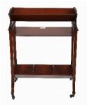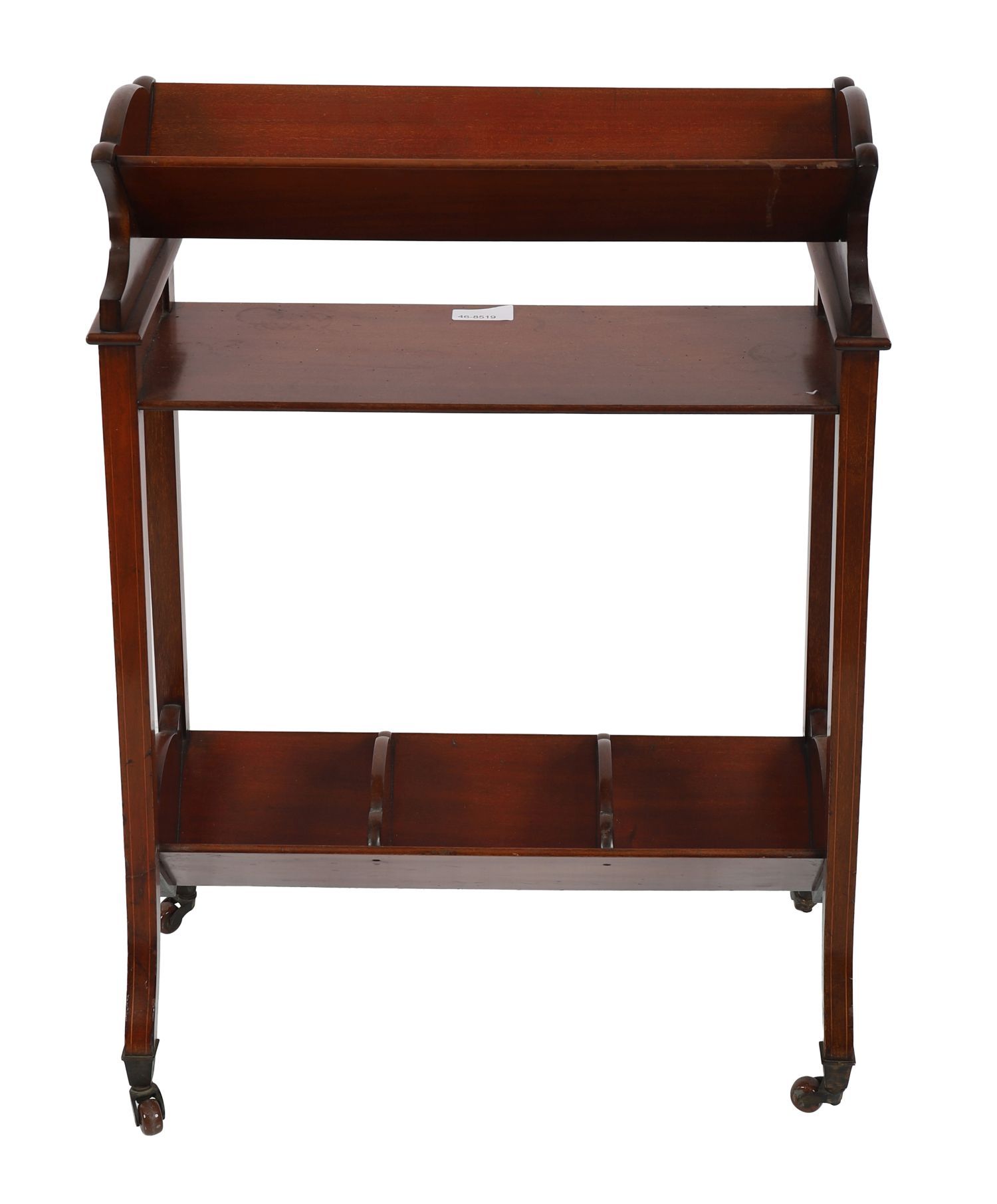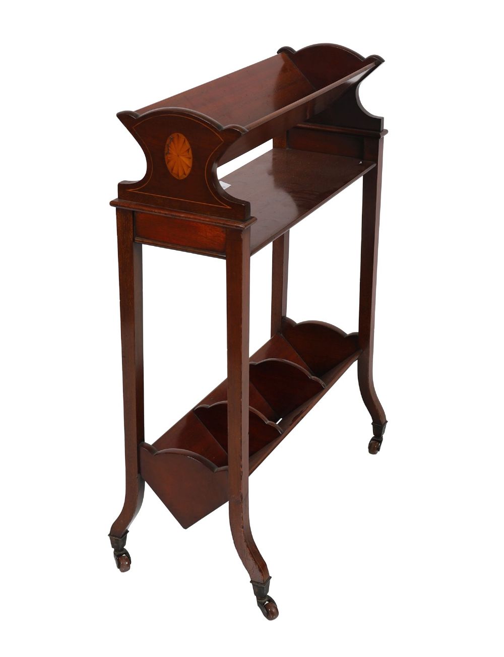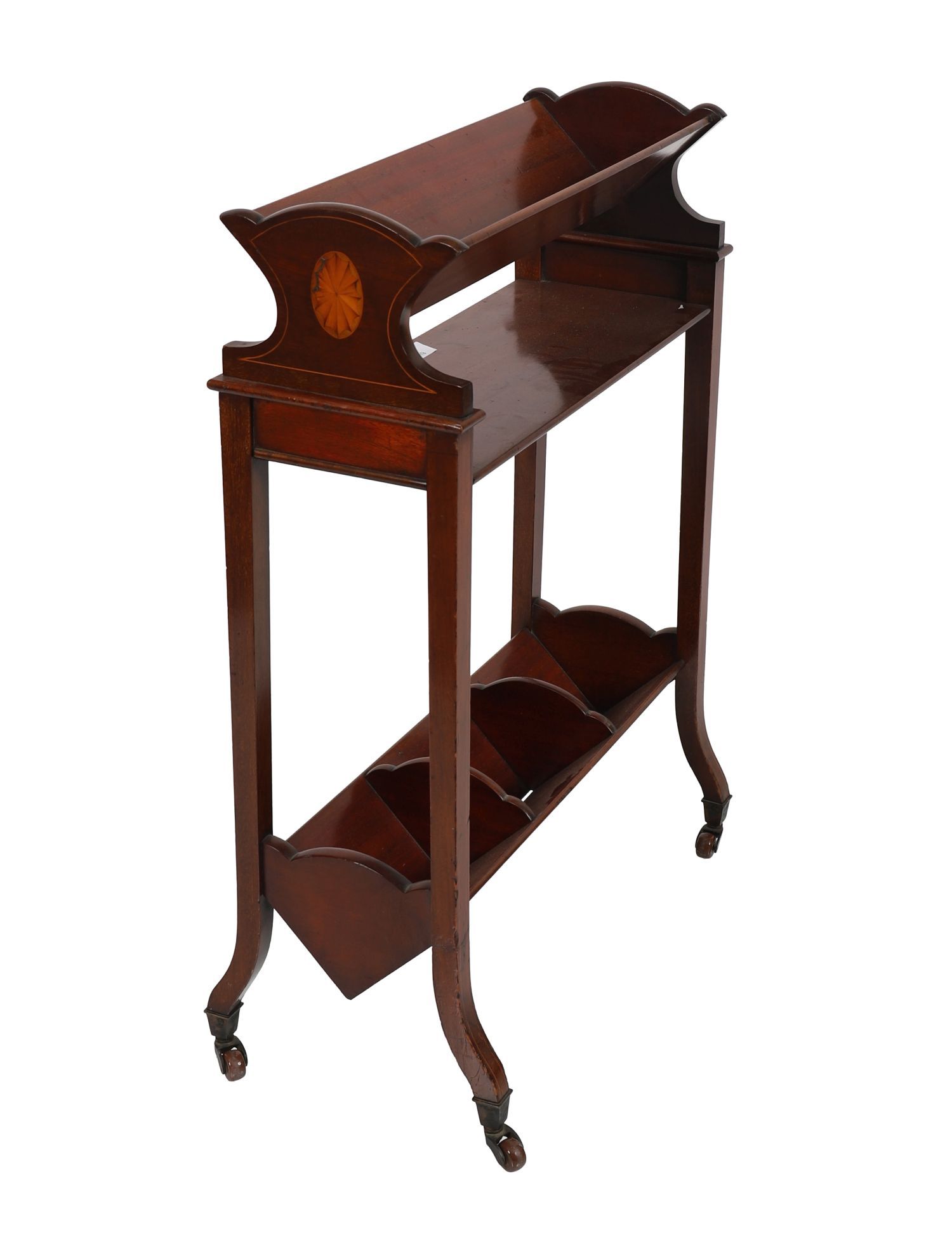 A narrow book trough/stand, the shaped ends with satinwood oval paterae and line inlay, the canted top section above two lower divided shelves; square tapering legs on brass castors. Warm colour and good proportions.