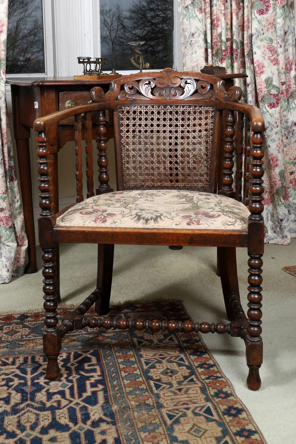 An Edwardian mahogany bergère armchair, with carved cresting rail, cane panelled back and sides, turned supports and upholstered seat, raised on turned legs with stretchers.