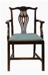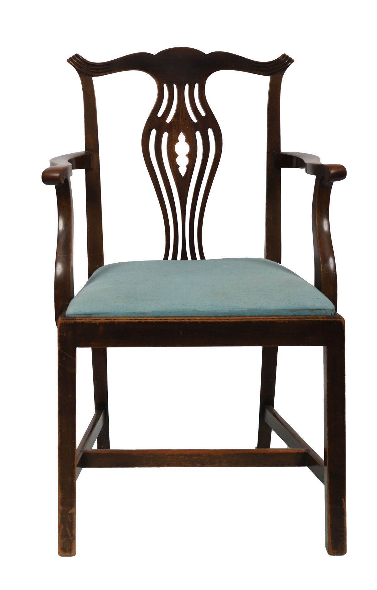 with a serpentine crest rail above a pierced vase-shaped splat and drop-in seat, between scroll-fronted arms, raised on square chamfered legs joined by stretcher rails.