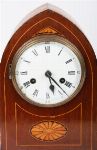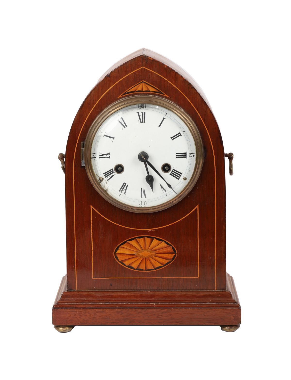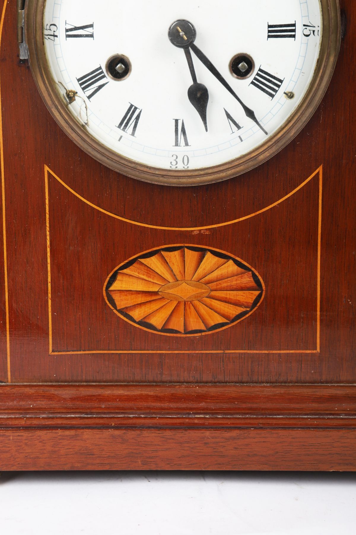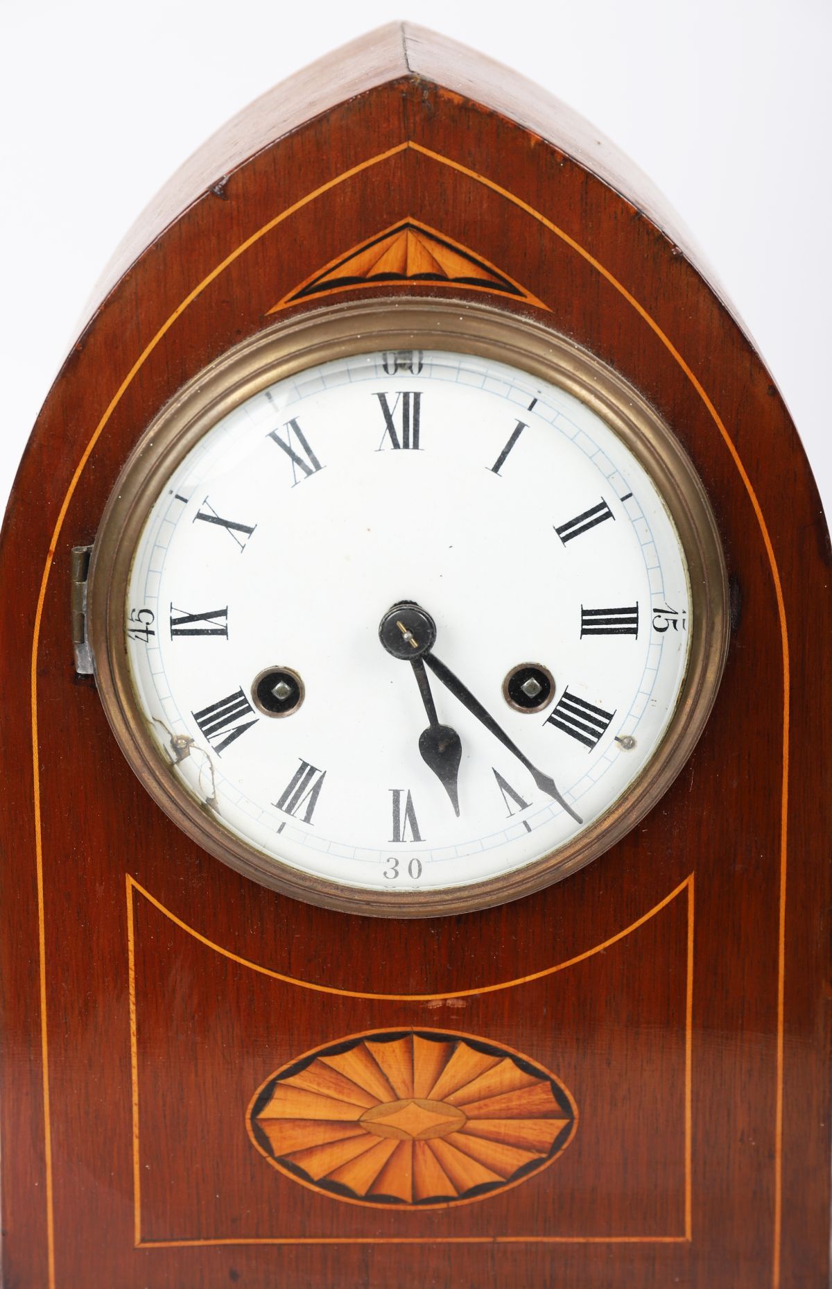 An Edwardian mahogany mantel clock with arched top, fan inlay, and boxwood stringing, the circular enamel dial with Roman numerals and brass bezel.