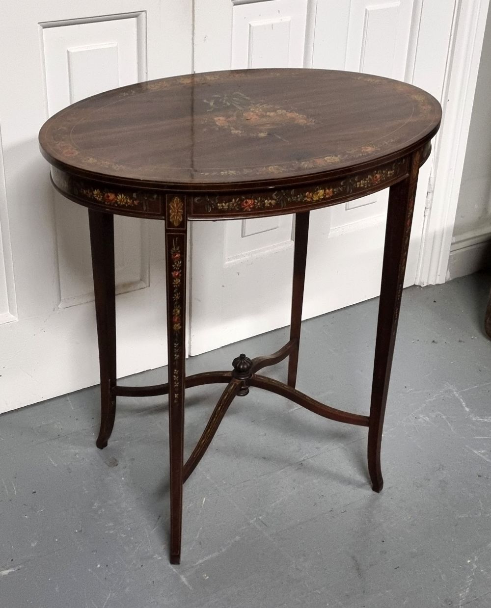 the oval shaped top with painted decoration above a conforming frieze, raised on square tapered legs joined by stretcher rails.