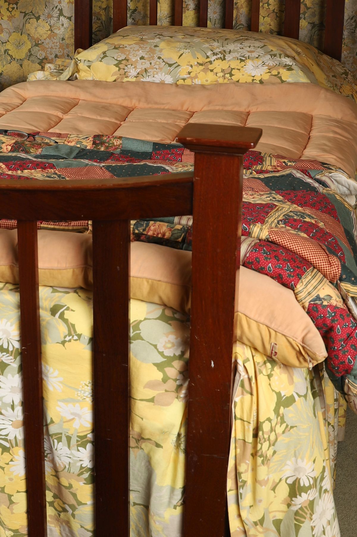 An Edwardian mahogany single bed, the arched slatted headboard and footboard with square uprights and plain rails, raised on turned legs. Early 20th century.