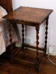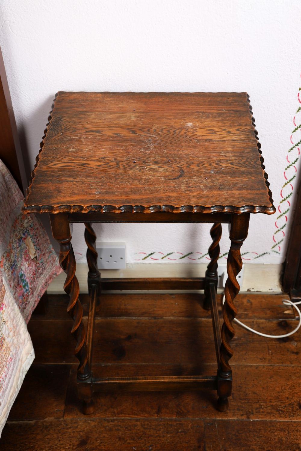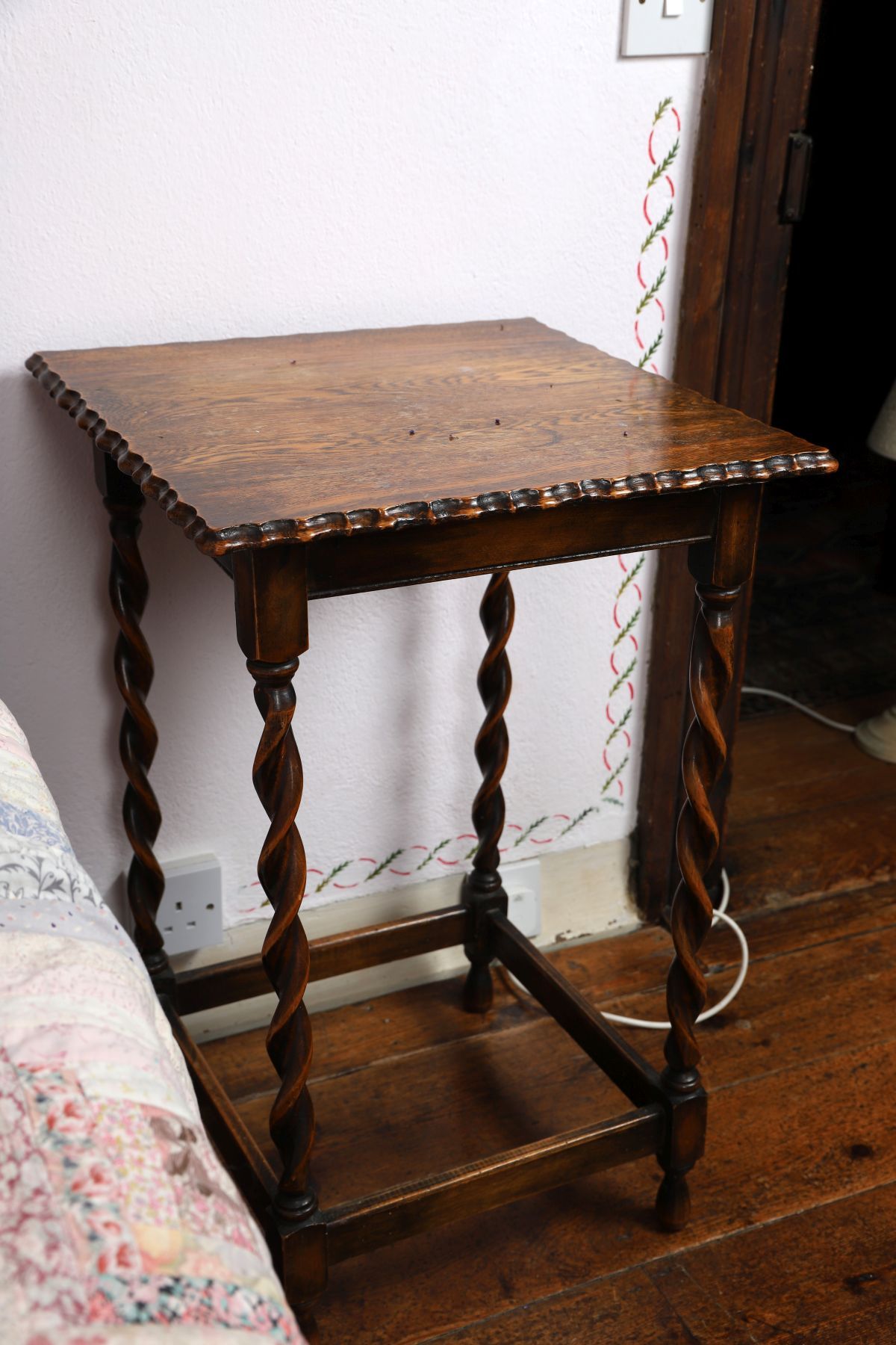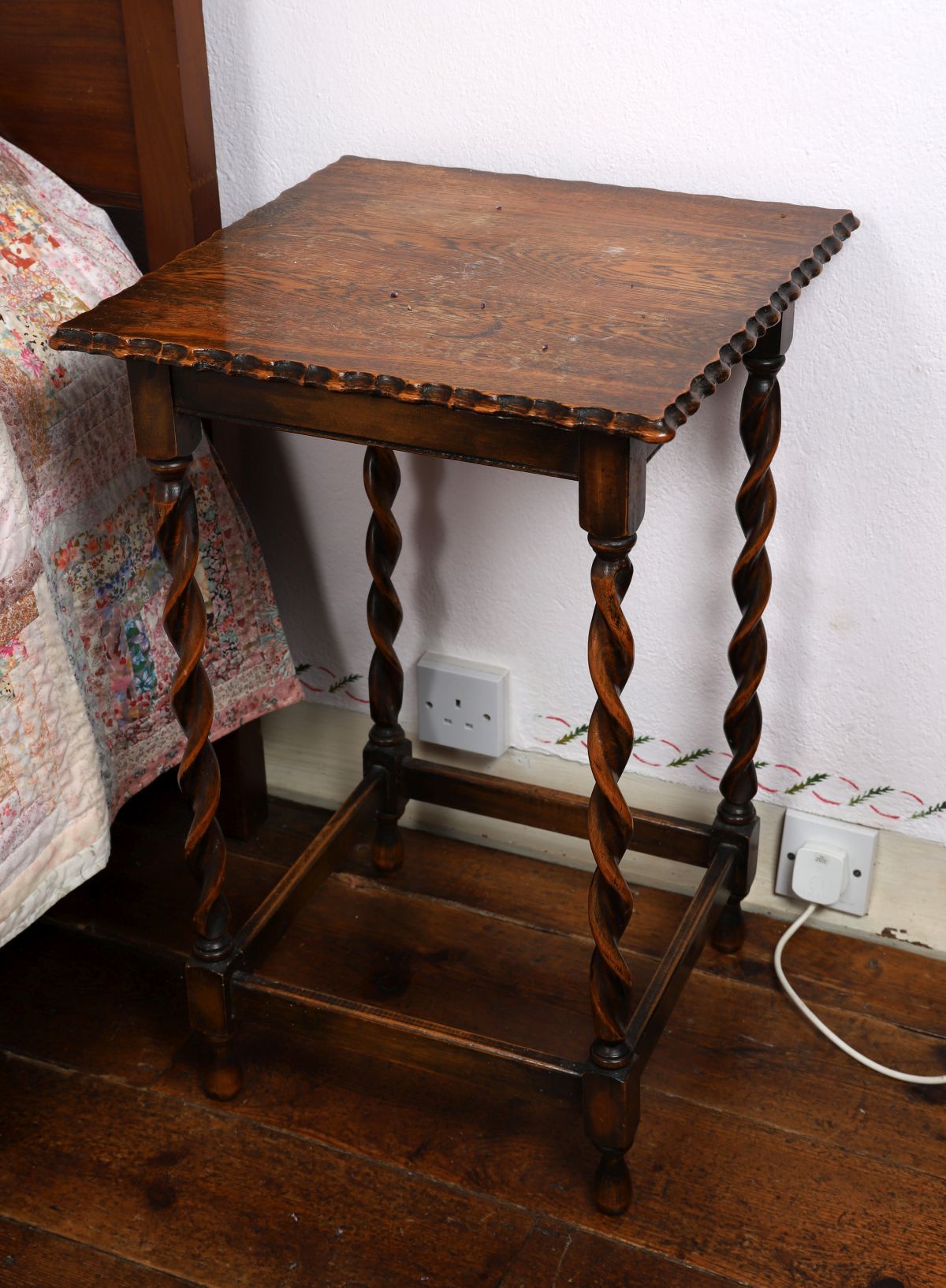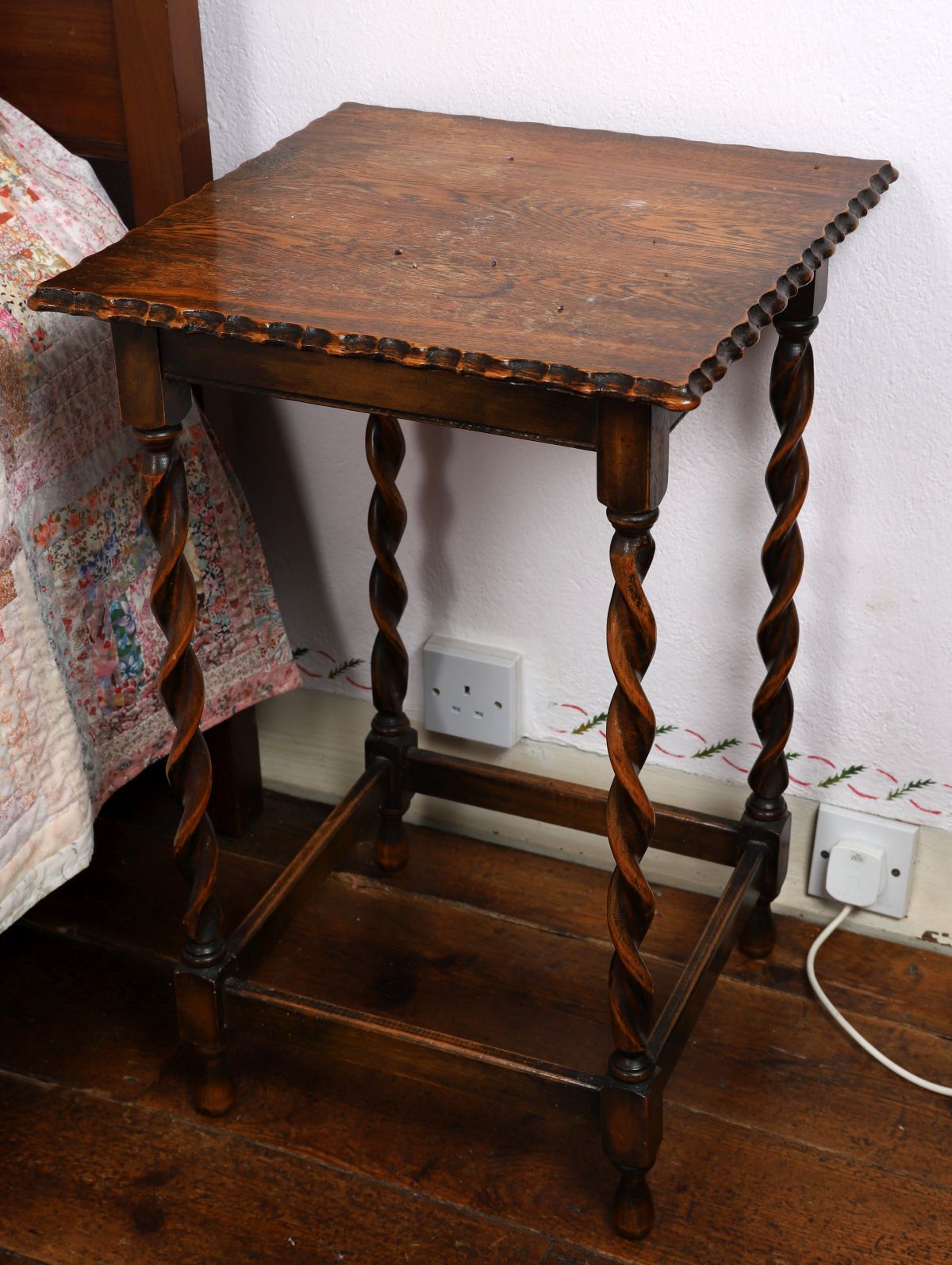 An Edwardian oak occasional table with square top, moulded edge, and barley-twist supports united by a lower stretcher.