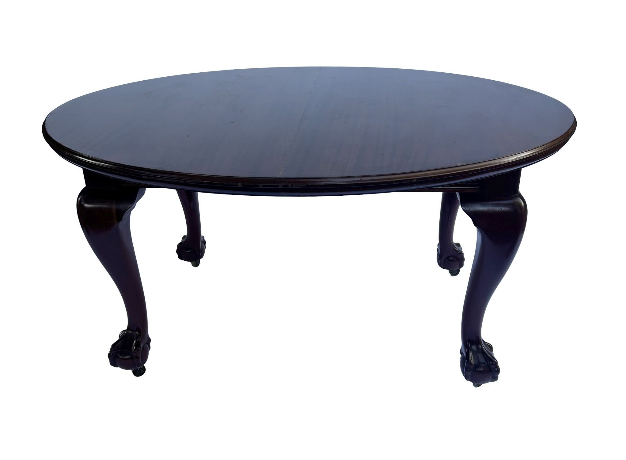 the D-end shaped top with 2 extending leaves, raised on cabriole legs, terminating on claw and ball feet and castors.