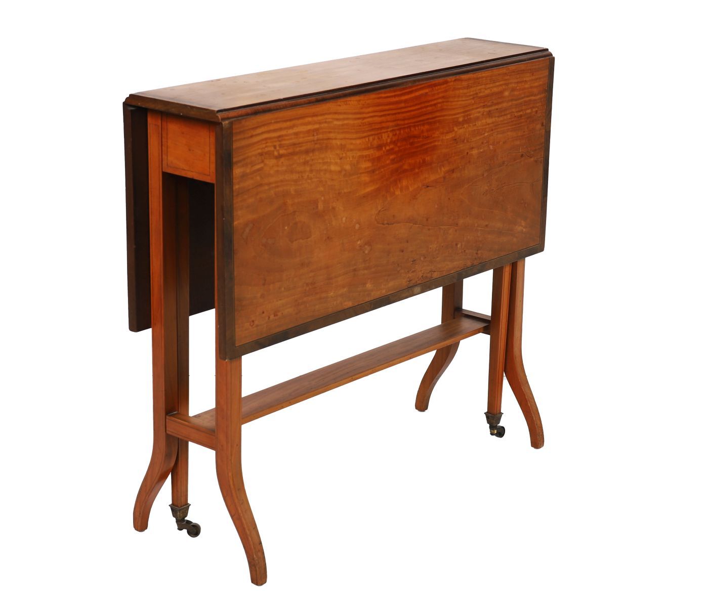 Early 20th century. An Edwardian satinwood Sutherland table, the oval top with crossbanded edge and twin drop leaves supported on gate legs, raised on tapering supports with brass castors.