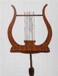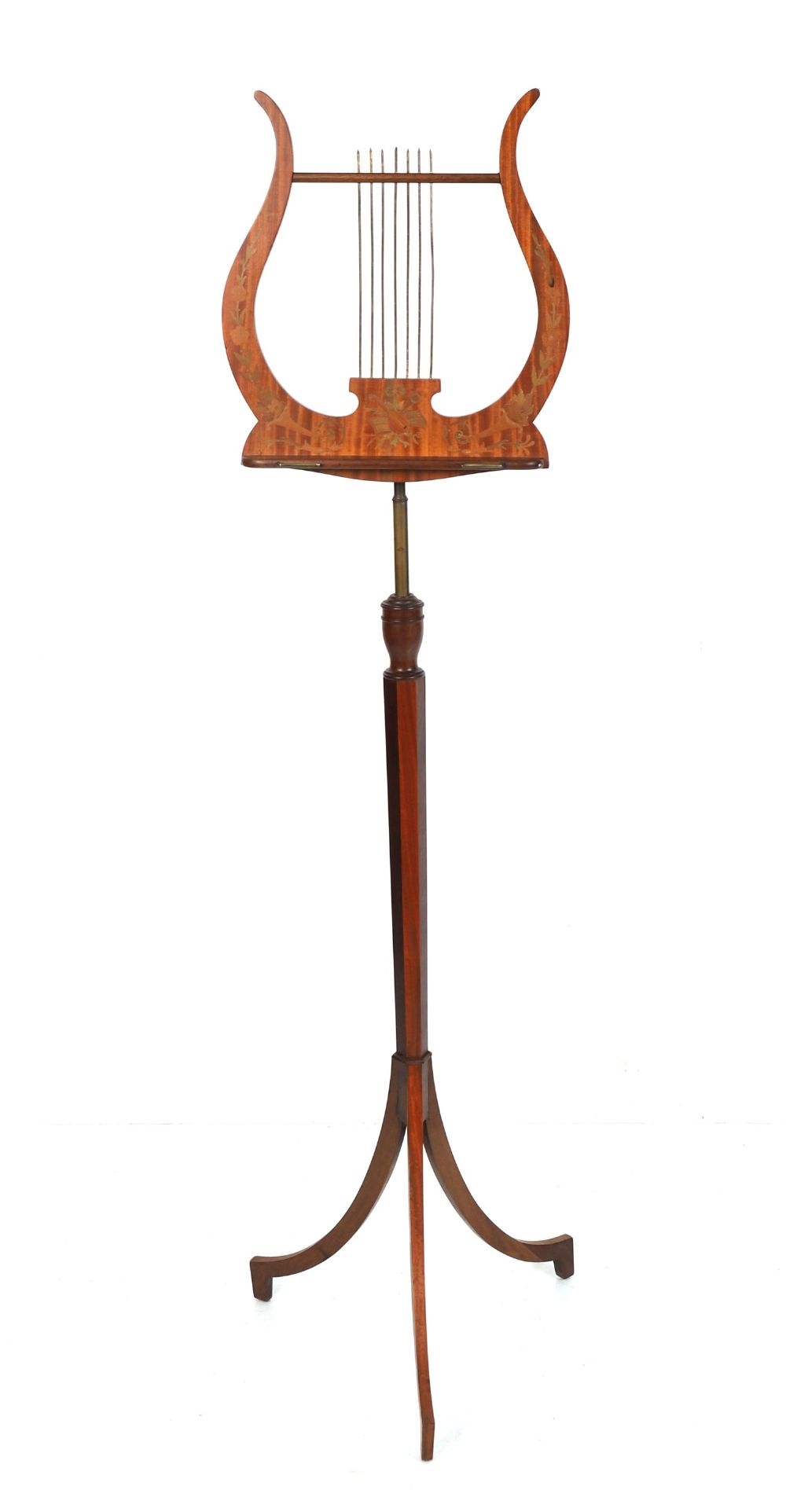 A rare Edwardian satinwood and marquetry music stand, the lyre-shaped support finely inlaid with scrolling floral motifs, raised on a slender turned column with tripod base.