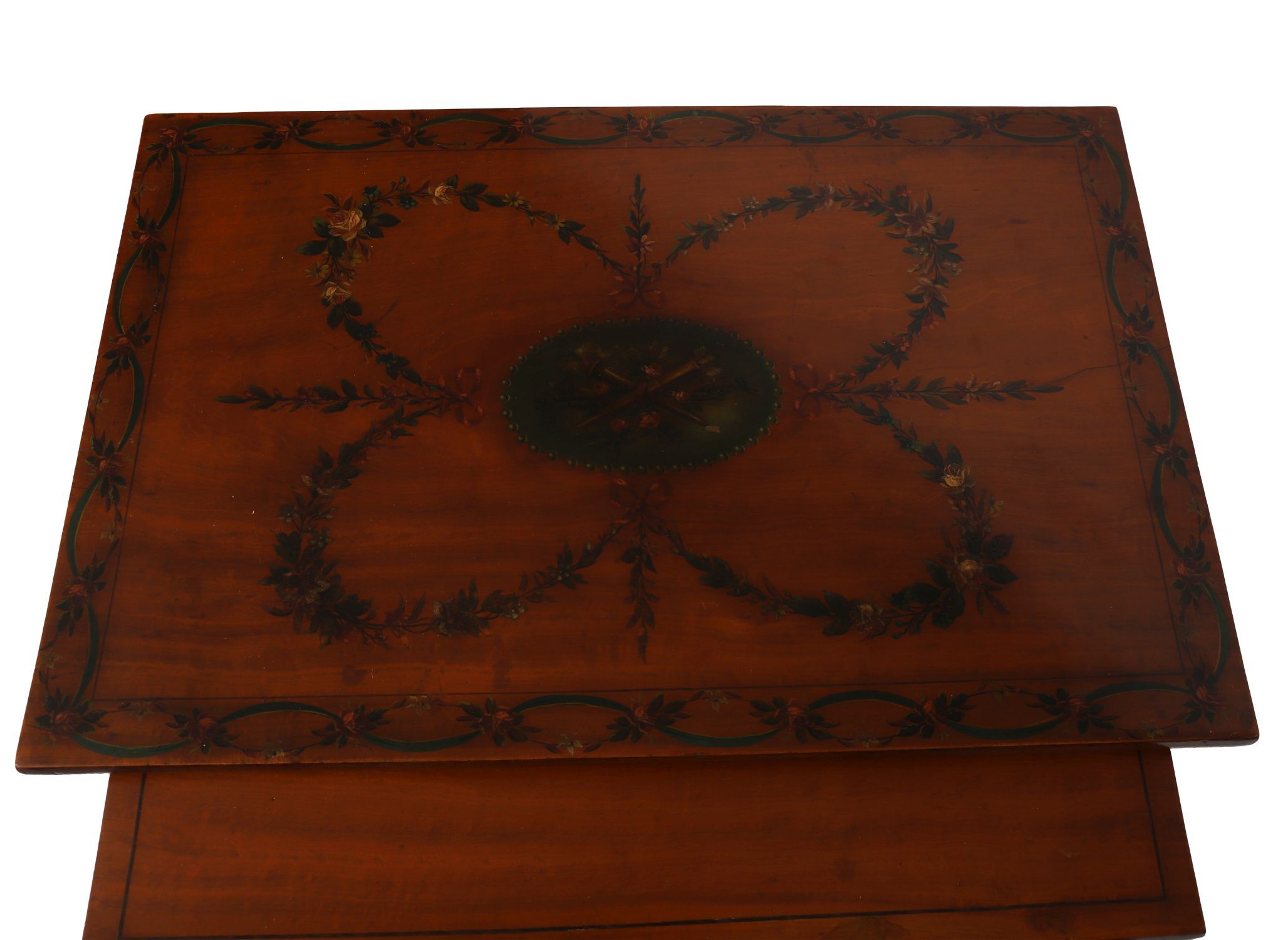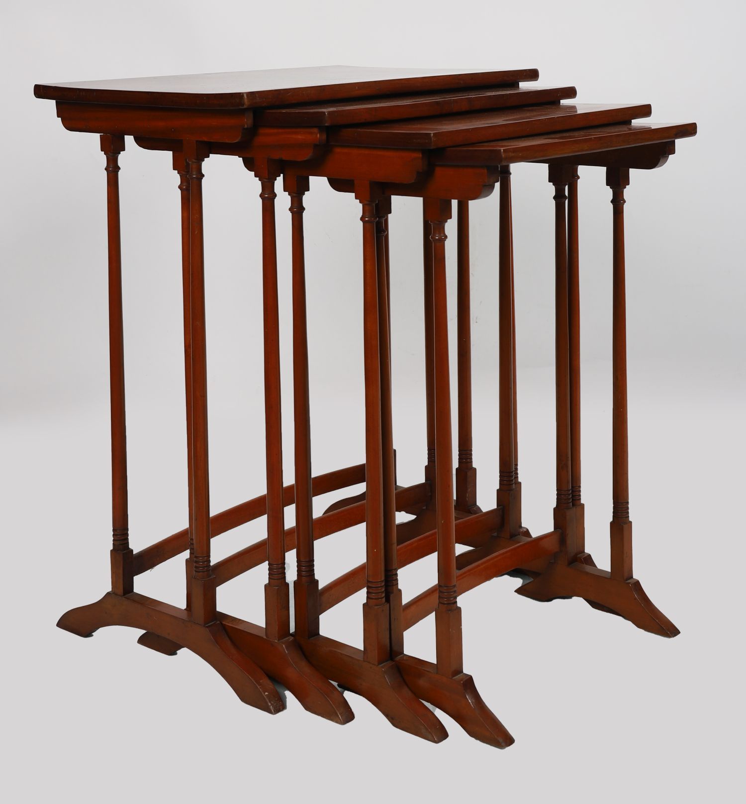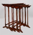 A fine set of Edwardian satinwood quartetto tables, the largest with a central painted oval reserve depicting floral garlands and ribbon swags within a wreath border, framed by painted scrolling foliage. Each table of rectangular form, raised on slender turned supports united by trestle ends and stretchers.