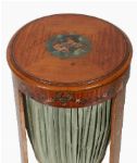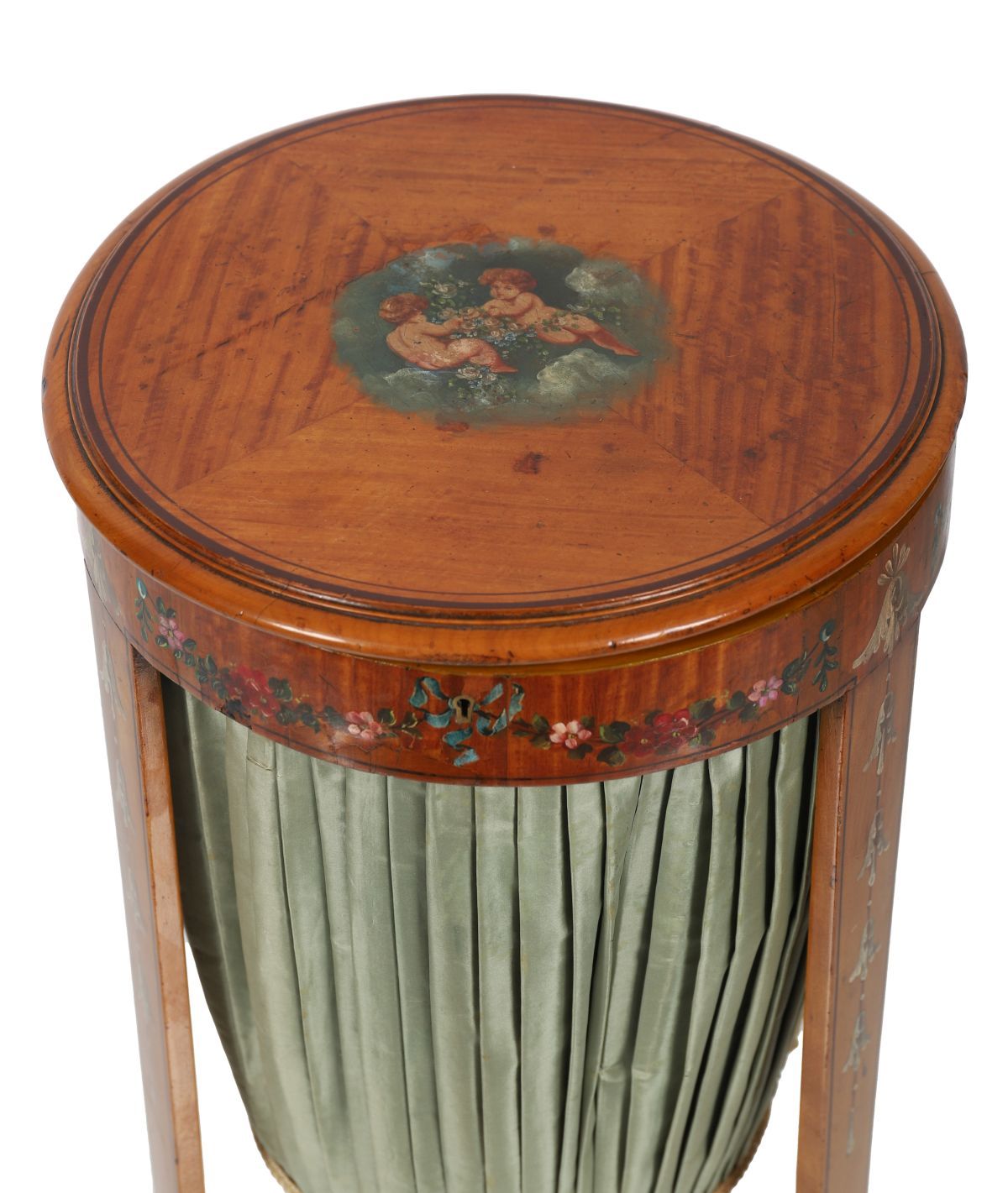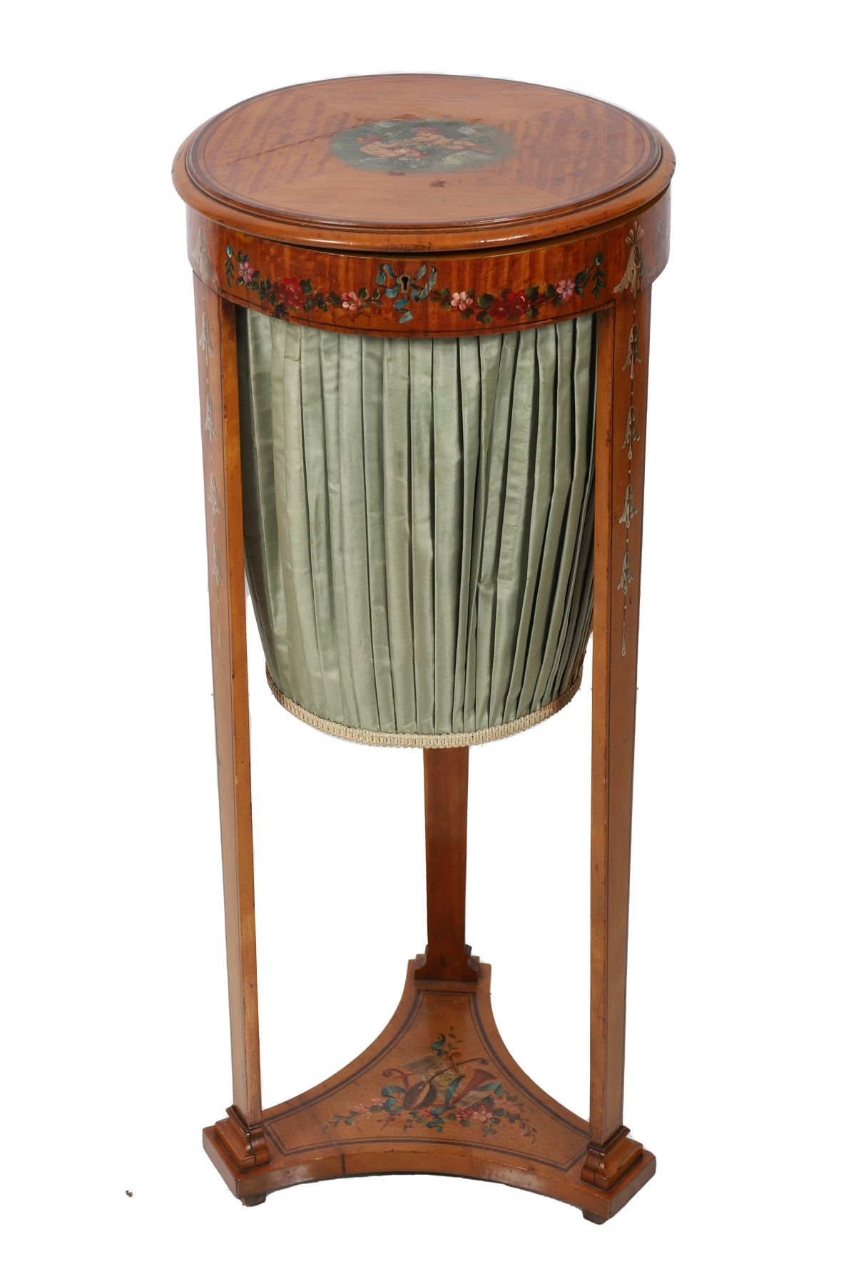 The circular top decorated with a painted panel of cherubs within satinwood crossbanding, above a pleated silk-lined pull-out work compartment, supported on tapering square legs joined by a shaped under-tier, painted with floral motifs.