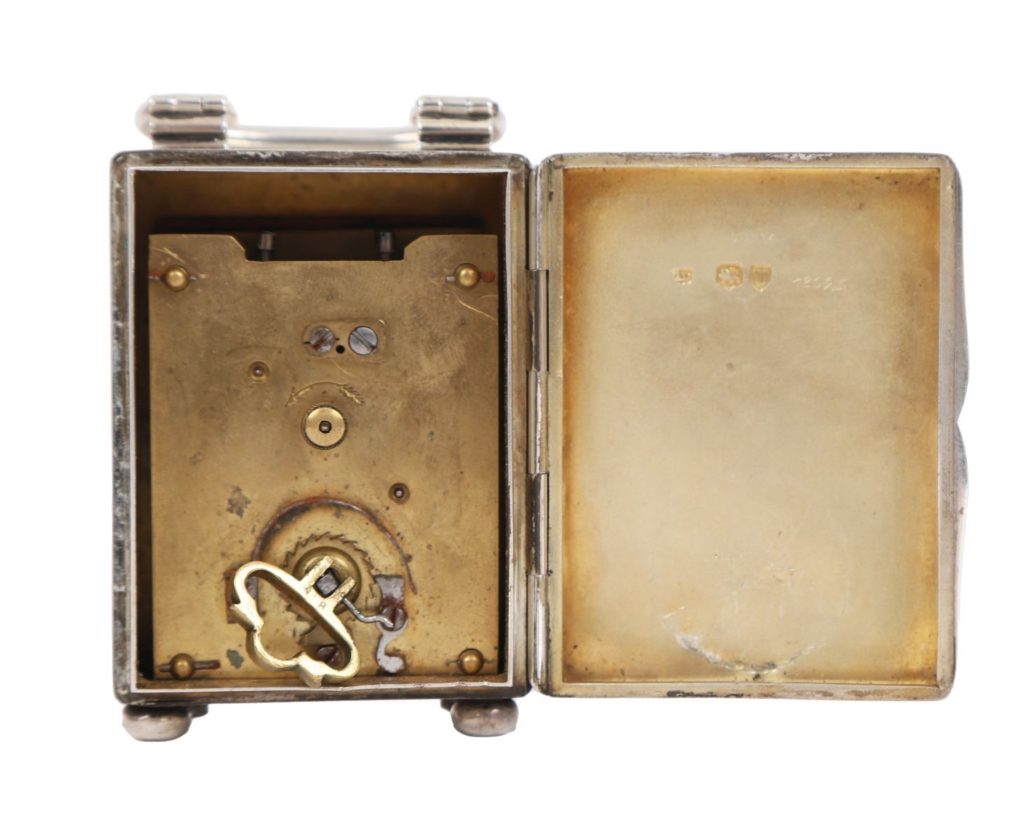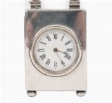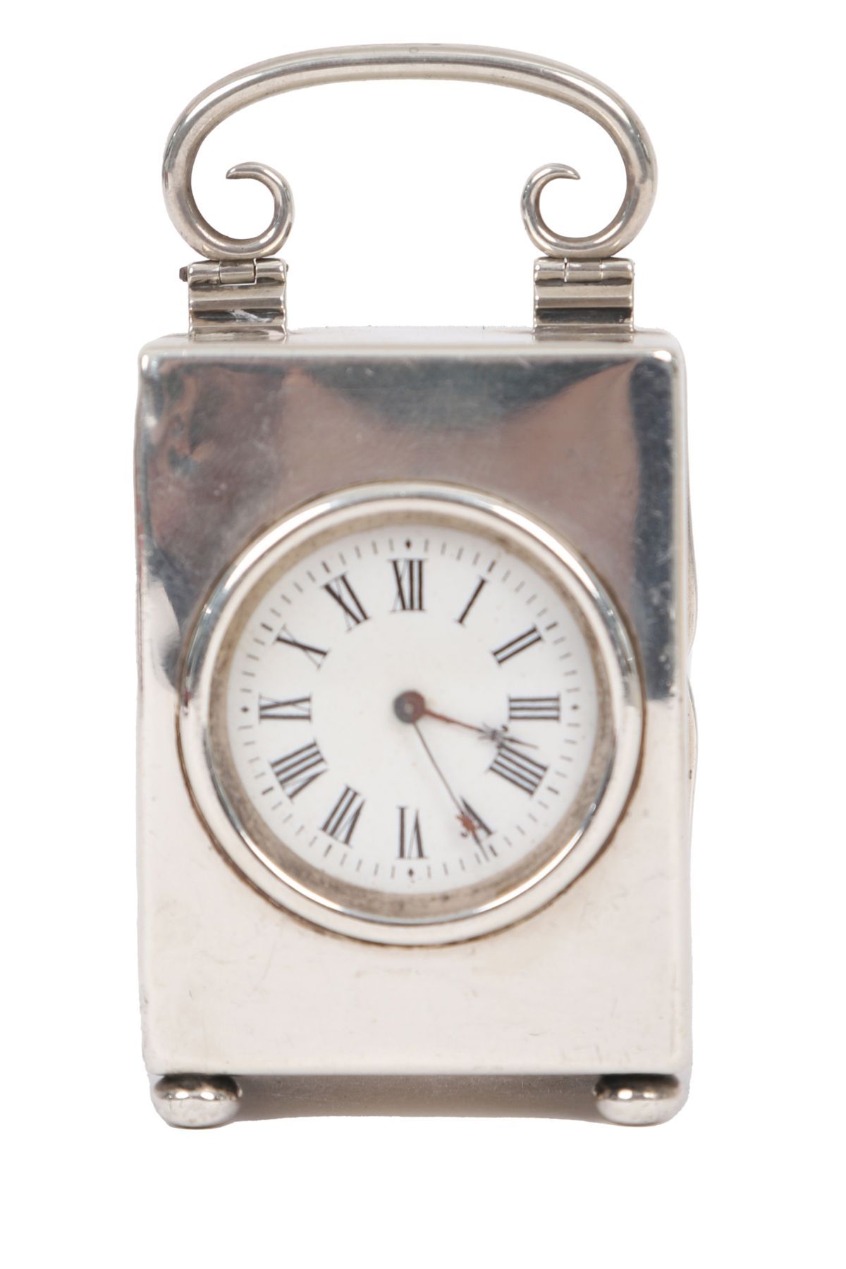 Rectangular silver case with folding handle, enclosing a white enamel dial with Roman numerals.
