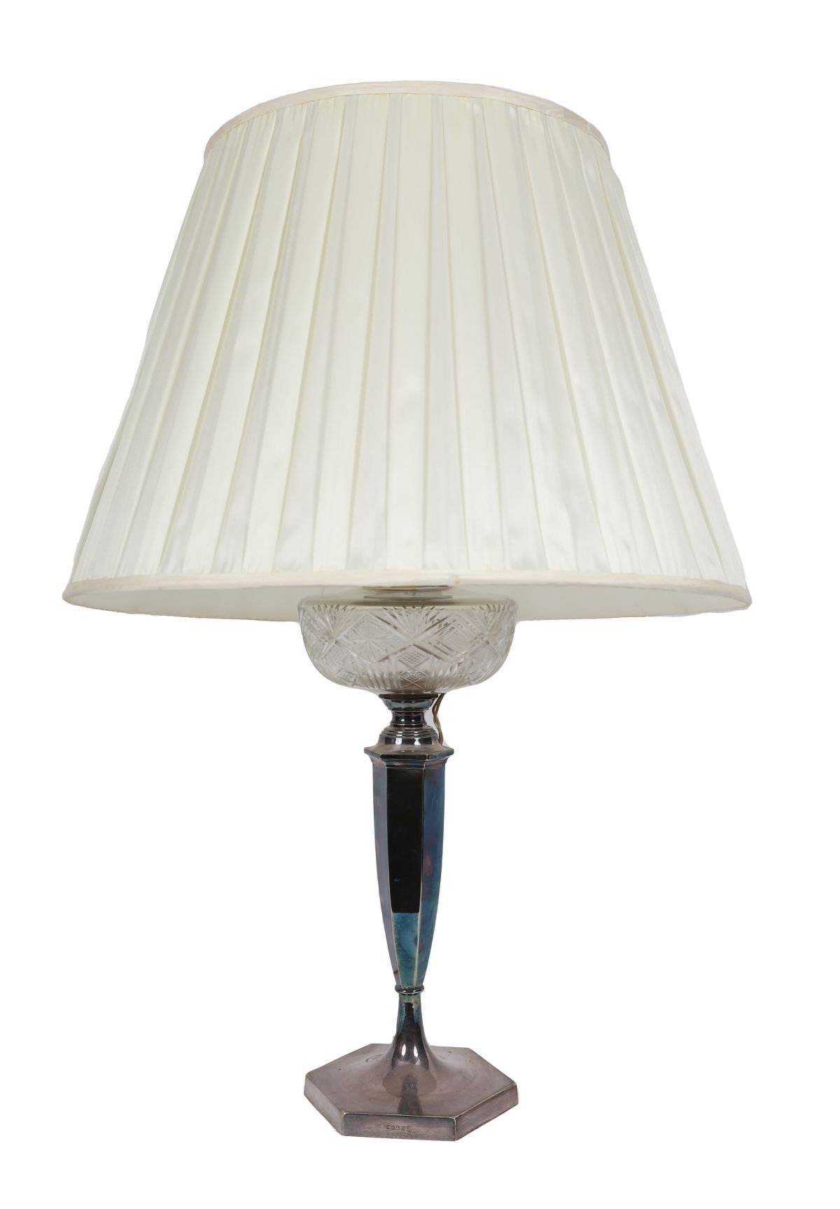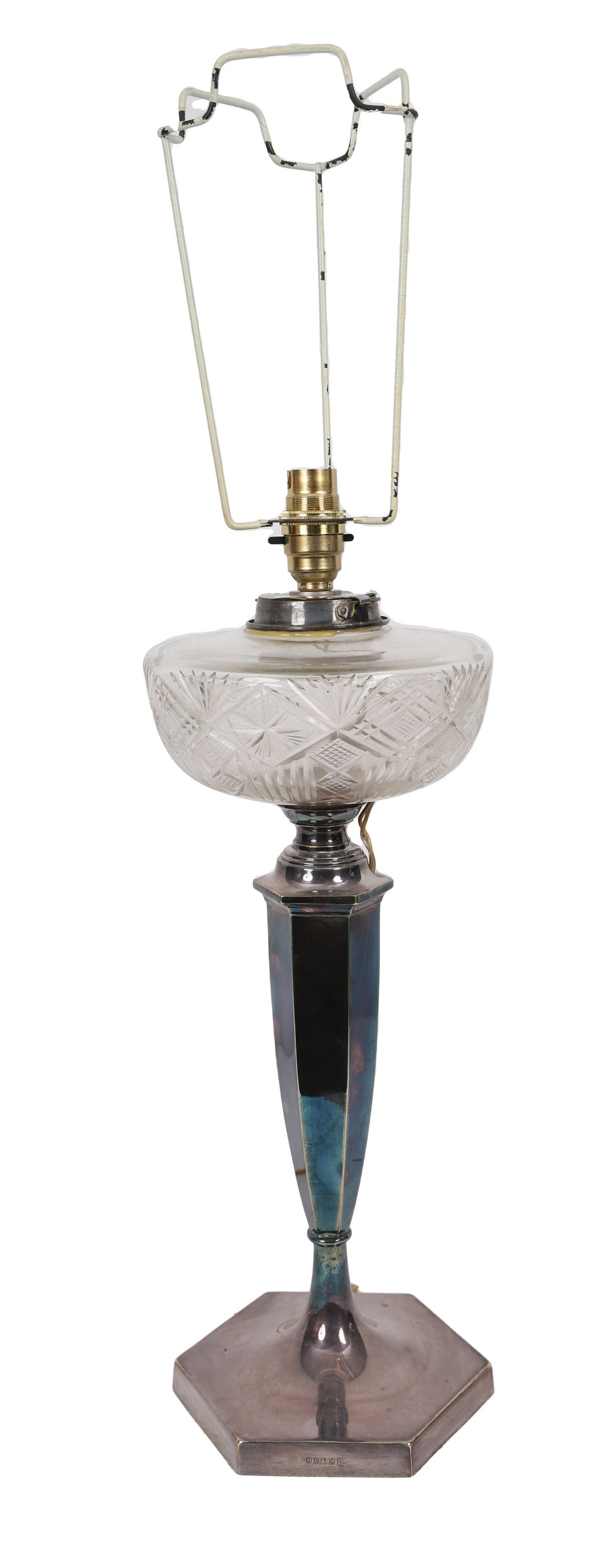 Lot 891 EDWARDIAN SILVER-PLATED AND CUT-CRYSTAL OIL LAMP